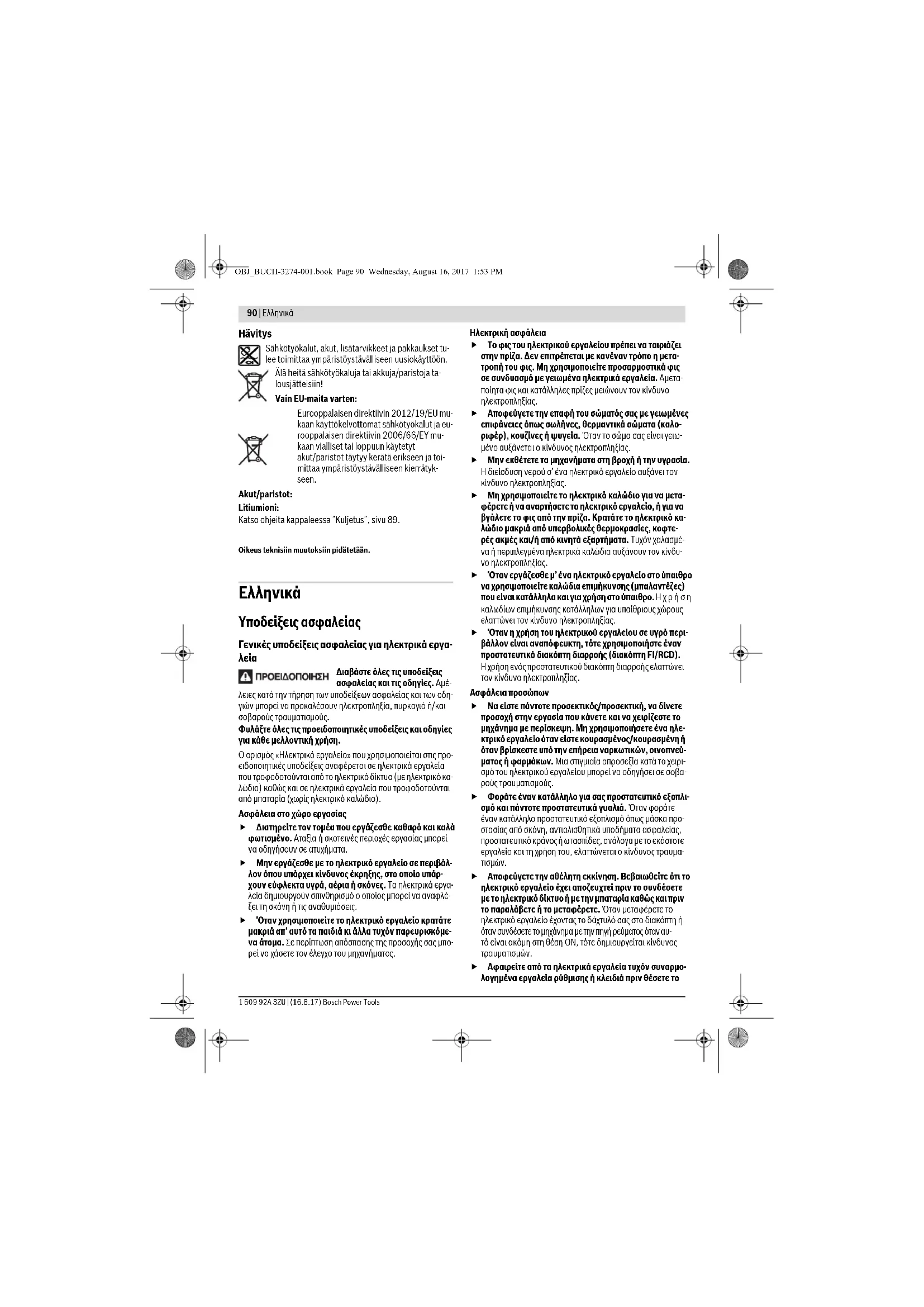 Αποφεύγετε την αθέλητη εκκίνηση. Βεβαιωθείτε ότι το ηλεκτρικό εργαλείο έχει αποζευχτεί πριν το συνδέσετε με το ηλεκτρικό δίκτυο ή με την μπαταρία καθώς και πριν το παραλάβετε ή το μεταφέρετε. Όταν μεταφέρετε το ηλεκτρικό εργαλείο έχοντας το δάχτυλό σας στο διακόπτη ή όταν συνδέσετε το μηχάνημα με την πηγή ρεύματος όταν αυ- τό είναι ακόμη στη θέση ΟΝ, τότε δημιουργείται κίνδυνος τραυματισμών. Αφαιρείτε από τα ηλεκτρικά εργαλεία τυχόν συναρμο- λογημένα εργαλεία ρύθμισης ή κλειδιά πριν θέσετε το OBJ_BUCH-3274-001.book Page 90 Wednesday, August 16, 2017 1:53 PMΕλληνικά | 91 Bosch Power Tools 1 609 92A 3ZU | (16.8.17) ηλεκτρικό εργαλείο σε λειτουργία. Ένα εργαλείο ή κλειδί συναρμολογημένο σ’ ένα περιστρεφόμενο τμήμα ενός μηχανήματος μπορεί να οδηγήσει σε τραυματισμούς. Μην υπερεκτιμάτε τον εαυτό σας. Φροντίζετε για την ασφαλή στάση του σώματός σας και διατηρείτε πάντοτε την ισορροπία σας. Έτσι μπορείτε να ελέγξετε καλύτερα το μηχάνημα σε περιπτώσεις απροσδόκητων περιστάσεων. Φοράτε κατάλληλα ενδύματα. Μη φοράτε φαρδιά ρού- χα ή κοσμήματα. Κρατάτε τα μαλλιά σας, τα ρούχα σας και τα γάντια σας μακριά από κινούμενα εξαρτήματα. Χα- λαρή ενδυμασία, κοσμήματα ή μακριά μαλλιά μπορεί να εμπλακούν στα κινούμενα εξαρτήματα. Όταν υπάρχει η δυνατότητα συναρμολόγησης διατάξε- ων αναρρόφησης ή συλλογής σκόνης, βεβαιωθείτε ότι αυτές είναι συνδεμένες με το μηχάνημα καθώς και ότι χρησιμοποιούνται σωστά. Η χρήση μιας αναρρόφησης σκόνης μπορεί να ελαττώσει τον κίνδυνο που προκαλείται από τη σκόνη. Επιμελής χειρισμός και χρήση ηλεκτρικών εργαλείων Μην υπερφορτώνετε το μηχάνημα. Χρησιμοποιείτε για την εκάστοτε εργασία το ηλεκτρικό εργαλείο που προορίζεται γι’ αυτήν. Με το κατάλληλο ηλεκτρικό εργα- λείο εργάζεστε καλύτερα και ασφαλέστερα στην αναφερό- μενη περιοχή ισχύος. Μη χρησιμοποιήσετε ποτέ ένα μηχάνημα που έχει χαλα- σμένο διακόπτη. Ένα ηλεκτρικό εργαλείο που δεν μπορείτε πλέον να το θέσετε σε λειτουργία και/ή εκτός λειτουργίας εί- ναι επικίνδυνο και πρέπει να επισκευαστεί. Βγάλτε το φις από την πρίζα και/ή αφαιρέστε την μπατα- ρία πριν διεξάγετε στο μηχάνημα μια οποιαδήποτε εργα- σία ρύθμισης, πριν αλλάξετε ένα εξάρτημα ή όταν πρό- κειται να διαφυλάξετε/να αποθηκεύσετε το μηχάνημα. Αυτά τα προληπτικά μέτρα ασφαλείας μειώνουν τον κίνδυνο από τυχόν αθέλητη εκκίνηση του ηλεκτρικού εργαλείου. Διαφυλάγετε τα ηλεκτρικά εργαλεία που δε χρησιμοποι- είτε μακριά από παιδιά. Μην επιτρέψετε τη χρήση του μηχανήματος σε άτομα που δεν είναι εξοικειωμένα μ’ αυτό ή δεν έχουν διαβάσει τις παρούσες οδηγίες. Τα ηλε- κτρικά εργαλεία είναι επικίνδυνα όταν χρησιμοποιούνται από άπειρα πρόσωπα. Να περιποιείστε προσεκτικά το ηλεκτρικό εργαλείο. Ελέγχετε, αν τα κινούμενα εξαρτήματα λειτουργούν άψογα, χωρίς να μπλοκάρουν, ή μήπως έχουν σπάσει ή φθαρεί τυχόν εξαρτήματα τα οποία επηρεάζουν τον τρό- πο λειτουργίας του ηλεκτρικού εργαλείου. Δώστε αυτά τα χαλασμένα εξαρτήματα για επισκευή πριν τα ξανα- χρησιμοποιήσετε. Η κακή συντήρηση των ηλεκτρικών ερ- γαλείων αποτελεί αιτία πολλών ατυχημάτων. Διατηρείτε τα εργαλεία κοπής κοφτερά και καθαρά. Προσεκτικά συντηρημένα κοπτικά εργαλεία σφηνώνουν δυσκολότερα και οδηγούνται ευκολότερα. Χρησιμοποιείτε τα ηλεκτρικά εργαλεία, εξαρτήματα, πα- ρελκόμενα εργαλεία κτλ. σύμφωνα με τις παρούσες οδηγίες. Λαμβάνετε επίσης υπόψη σας τις εκάστοτε συν- θήκες και την υπό εκτέλεση 