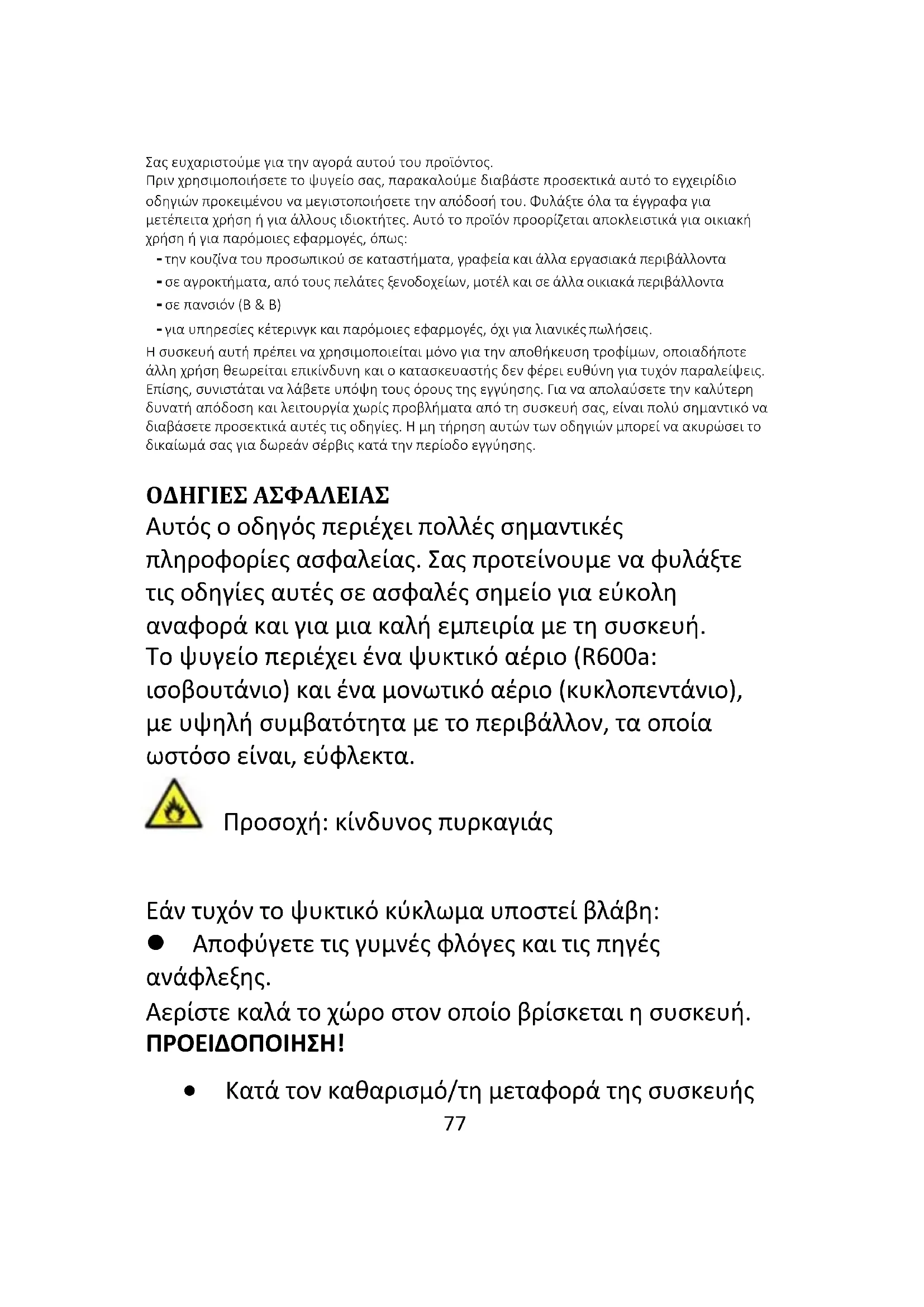 - ΑΝΤΙΜΕΤΩΠΙΣΗ ΠΡΟΒΛΗΜΑΤΩΝ Σας ευχαριστούμε για την αγορά αυτού του προϊόντος. Πριν χρησιμοποιήσετε το ψυγείο σας, παρακαλούμε διαβάστε προσεκτικά αυτό το εγχειρίδιο οδηγιών προκειμένου να μεγιστοποιήσετε την απόδοσή του. Φυλάξτε όλα τα έγγραφα για μετέπειτα χρήση ή για άλλους ιδιοκτήτες. Αυτό το προϊόν προορίζεται αποκλειστικά για οικιακή χρήση ή για παρόμοιες εφαρμογές, όπως: - την κουζίνα του προσωπικού σε καταστήματα, γραφεία και άλλα εργασιακά περιβάλλοντα - σε αγροκτήματα, από τους πελάτες ξενοδοχείων, μοτέλ και σε άλλα οικιακά περιβάλλοντα - σε πανσιόν (B & B) - για υπηρεσίες κέτερινγκ και παρόμοιες εφαρμογές, όχι για λιανικές πωλήσεις. Η συσκευή αυτή πρέπει να χρησιμοποιείται μόνο για την αποθήκευση τροφίμων, οποιαδήποτε άλλη χρήση θεωρείται επικίνδυνη και ο κατασκευαστής δεν φέρει ευθύνη για τυχόν παραλείψεις. Επίσης, συνιστάται να λάβετε υπόψη τους όρους της εγγύησης. Για να απολαύσετε την καλύτερη δυνατή απόδοση και λειτουργία χωρίς προβλήματα από τη συσκευή σας, είναι πολύ σημαντικό να διαβάσετε προσεκτικά αυτές τις οδηγίες. Η μη τήρηση αυτών των οδηγιών μπορεί να ακυρώσει το δικαίωμά σας για δωρεάν σέρβις κατά την περίοδο εγγύησης. ΟΔΗΓΙΕΣ ΑΣΦΑΛΕΙΑΣ Αυτός ο οδηγός περιέχει πολλές σημαντικές πληροφορίες ασφαλείας. Σας προτείνουμε να φυλάξτε τις οδηγίες αυτές σε ασφαλές σημείο για εύκολη αναφορά και για μια καλή εμπειρία με τη συσκευή. Το ψυγείο περιέχει ένα ψυκτικό αέριο (R600a: ισοβουτάνιο) και ένα μονωτικό αέριο (κυκλοπεντάνιο), με υψηλή συμβατότητα με το περιβάλλον, τα οποία ωστόσο είναι, εύφλεκτα. Προσοχή: κίνδυνος πυρκαγιάς Εάν τυχόν το ψυκτικό κύκλωμα υποστεί βλάβη: Αποφύγετε τις γυμνές φλόγες και τις πηγές p. 9377