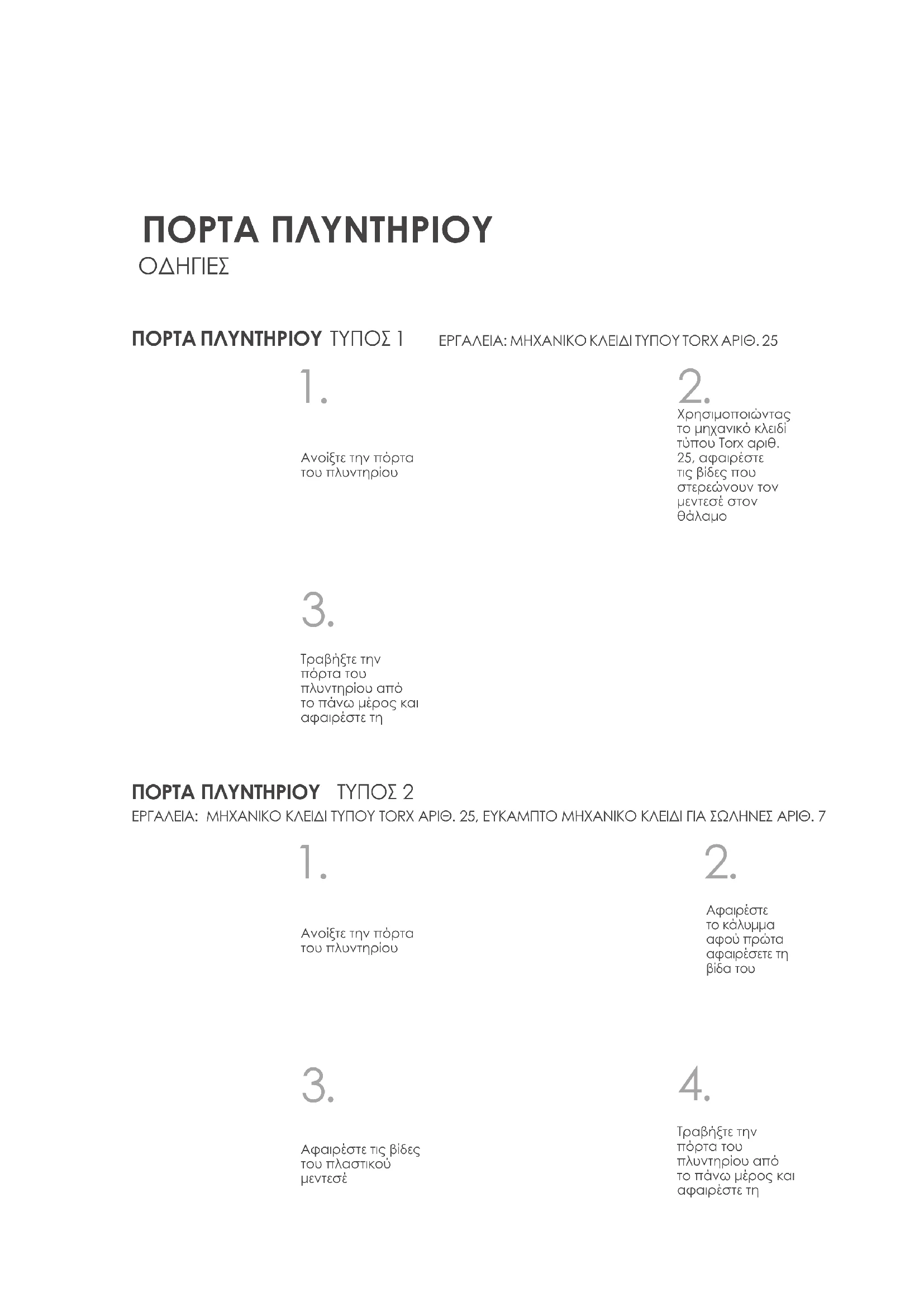 ΠΟΡΤΑ ΠΛΥΝΤΗΡΙΟΥ ΤΥΠΟΣ 1 ΕΡΓΑΛΕΙΑ: ΜΗΧΑΝΙΚΟ ΚΛΕΙΔΙ ΤΥΠΟΥ TORX ΑΡΙΘ. 25 ΠΟΡΤΑ ΠΛΥΝΤΗΡΙΟΥ ΤΥΠΟΣ 2 ΕΡΓΑΛΕΙΑ: ΜΗΧΑΝΙΚΟ ΚΛΕΙΔΙ ΤΥΠΟΥ TORX ΑΡΙΘ. 25, ΕΥΚΑΜΠΤΟ ΜΗΧΑΝΙΚΟ ΚΛΕΙΔΙ ΓΙΑ ΣΩΛΗΝΕΣ ΑΡΙΘ. 7 ΠΟΡΤΑ ΠΛΥΝΤΗΡΙΟΥ ΟΔΗΓΙΕΣ1. Ανοίξτε την πόρτα του πλυντηρίουΑφαιρέστε το κάλυμμα αφού πρώτα αφαιρέσετε τη βίδα του Αφαιρέστε τις βίδες του πλαστικού μεντεσέ Τραβήξτε την πόρτα του πλυντηρίου από το πάνω μέρος και αφαιρέστε τη