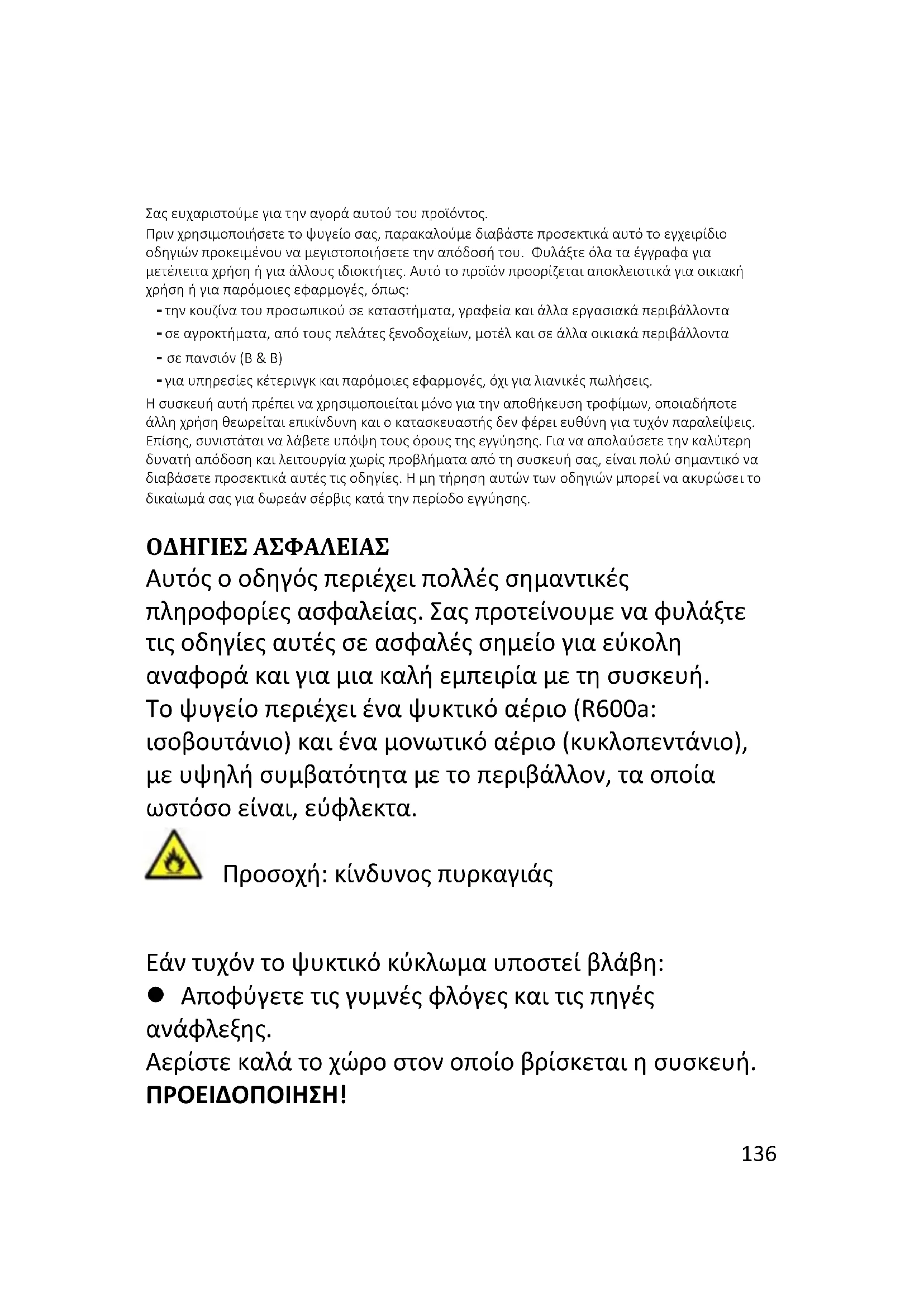 Σας ευχαριστούμε για την αγορά αυτού του προϊόντος. Πριν χρησιμοποιήσετε το ψυγείο σας, παρακαλούμε διαβάστε προσεκτικά αυτό το εγχειρίδιο οδηγιών προκειμένου να μεγιστοποιήσετε την απόδοσή του. Φυλάξτε όλα τα έγγραφα για μετέπειτα χρήση ή για άλλους ιδιοκτήτες. Αυτό το προϊόν προορίζεται αποκλειστικά για οικιακή χρήση ή για παρόμοιες εφαρμογές, όπως: - την κουζίνα του προσωπικού σε καταστήματα, γραφεία και άλλα εργασιακά περιβάλλοντα - σε αγροκτήματα, από τους πελάτες ξενοδοχείων, μοτέλ και σε άλλα οικιακά περιβάλλοντα - σε πανσιόν (B & B) - για υπηρεσίες κέτερινγκ και παρόμοιες εφαρμογές, όχι για λιανικές πωλήσεις. Η συσκευή αυτή πρέπει να χρησιμοποιείται μόνο για την αποθήκευση τροφίμων, οποιαδήποτε άλλη χρήση θεωρείται επικίνδυνη και ο κατασκευαστής δεν φέρει ευθύνη για τυχόν παραλείψεις. Επίσης, συνιστάται να λάβετε υπόψη τους όρους της εγγύησης. Για να απολαύσετε την καλύτερη δυνατή απόδοση και λειτουργία χωρίς προβλήματα από τη συσκευή σας, είναι πολύ σημαντικό να διαβάσετε προσεκτικά αυτές τις οδηγίες. Η μη τήρηση αυτών των οδηγιών μπορεί να ακυρώσει το δικαίωμά σας για δωρεάν σέρβις κατά την περίοδο εγγύησης. ΟΔΗΓΙΕΣ ΑΣΦΑΛΕΙΑΣ Αυτός ο οδηγός περιέχει πολλές σημαντικές πληροφορίες ασφαλείας. Σας προτείνουμε να φυλάξτε τις οδηγίες αυτές σε ασφαλές σημείο για εύκολη αναφορά και για μια καλή εμπειρία με τη συσκευή. Το ψυγείο περιέχει ένα ψυκτικό αέριο (R600a: ισοβουτάνιο) και ένα μονωτικό αέριο (κυκλοπεντάνιο), με υψηλή συμβατότητα με το περιβάλλον, τα οποία ωστόσο είναι, εύφλεκτα. Προσοχή: κίνδυνος πυρκαγιάς Εάν τυχόν το ψυκτικό κύκλωμα υποστεί βλάβη: Αποφύγετε τις γυμνές φλόγες και τις πηγές