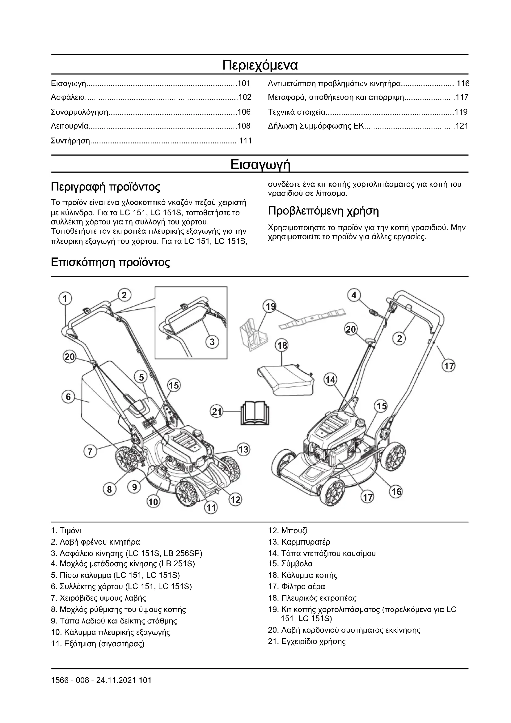 Περιγραφή προϊόντος Το προϊόν είναι ένα χλοοκοπτικό γκαζόν πεζού χειριστή με κύλινδρο. Για τα LC 151, LC 151S, τοποθετήστε το συλλέκτη χόρτου για τη συλλογή του χόρτου. Τοποθετήστε τον εκτροπέα πλευρικής εξαγωγής για την πλευρική εξαγωγή του χόρτου. Για τα LC 151, LC 151S, συνδέστε ένα κιτ κοπής χορτολιπάσματος για κοπή του γρασιδιού σε λίπασμα. Προβλεπόμενη χρήση Χρησιμοποιήστε το προϊόν για την κοπή γρασιδιού. Μην χρησιμοποιείτε το προϊόν για άλλες εργασίες. Επισκόπηση προϊόντος