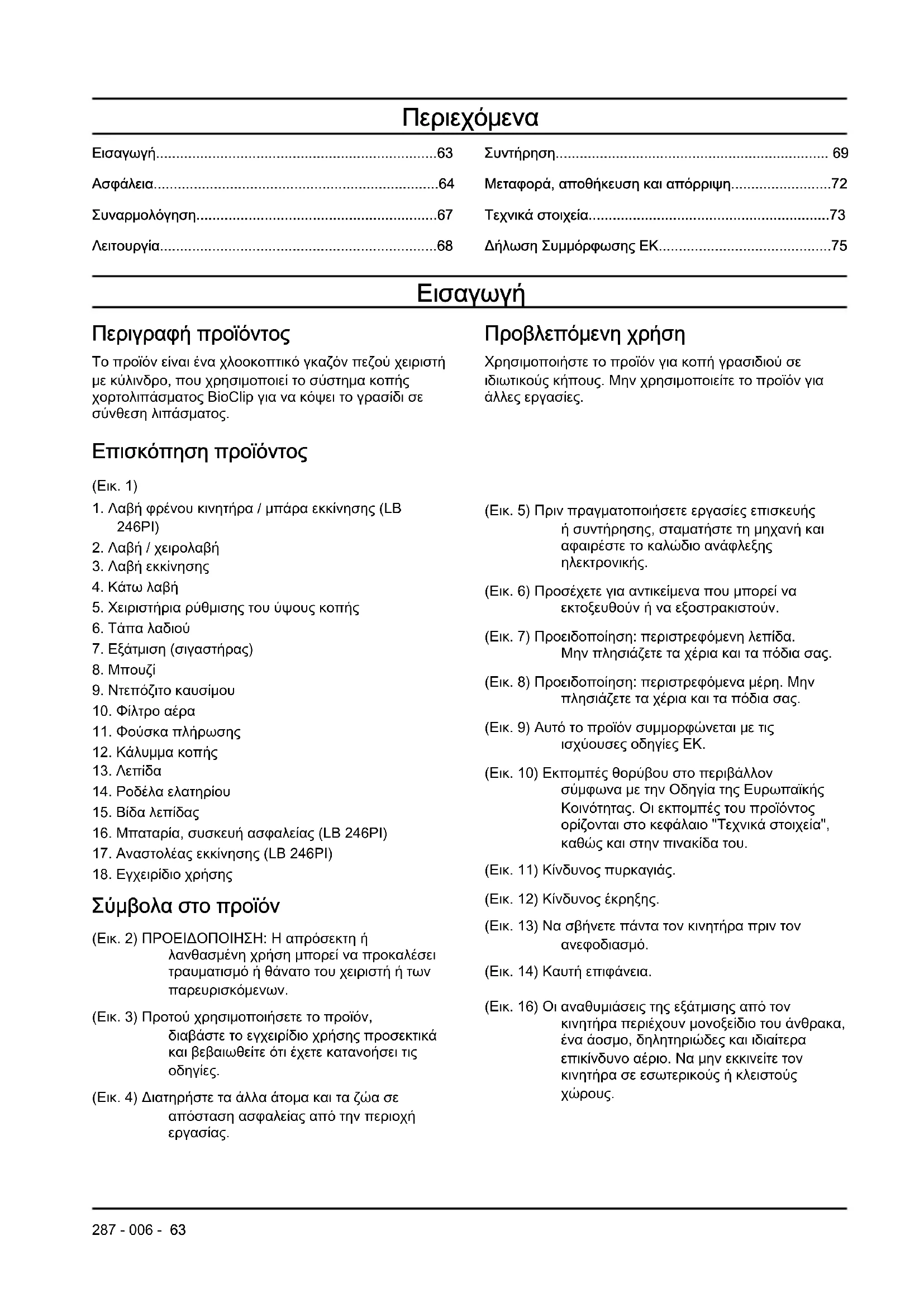 (μπαταρία) πριν εκτελέσετε εργασίες συντήρησης ή αφήσετε το προϊόν εκτός του οπτικού σας πεδίου. (Εικ. 18) Διαδικασία εκκίνησης για LB 146P: Σπρώξτε τη λαβή φρένου κινητήρα προς τα κάτω και τραβήξτε τη λαβή εκκίνησης. (Εικ. 19) Διαδικασία εκκίνησης για LB 246PI: Αφήστε τον αναστολέα εκκίνηση και πιέστε την μπάρα εκκίνησης προς τα κάτω. (Εικ. 15) Κωδικός με δυνατότητα σάρωσης. Περιεχόμενα Άλλα σύμβολα/σήματα που υπάρχουν στο προϊόν αναφέρονται σε απαιτήσεις πιστοποίησης για άλλους εμπορικούς τομείς. Εκπομπές Euro V ΠΡΟΕΙΔΟΠΟΙΗΣΗ: Οποιαδήποτε μη εξουσιοδοτημένη παρέμβαση στον κινητήρα ακυρώνει την έγκριση τύπου ΕΕ αυτού του