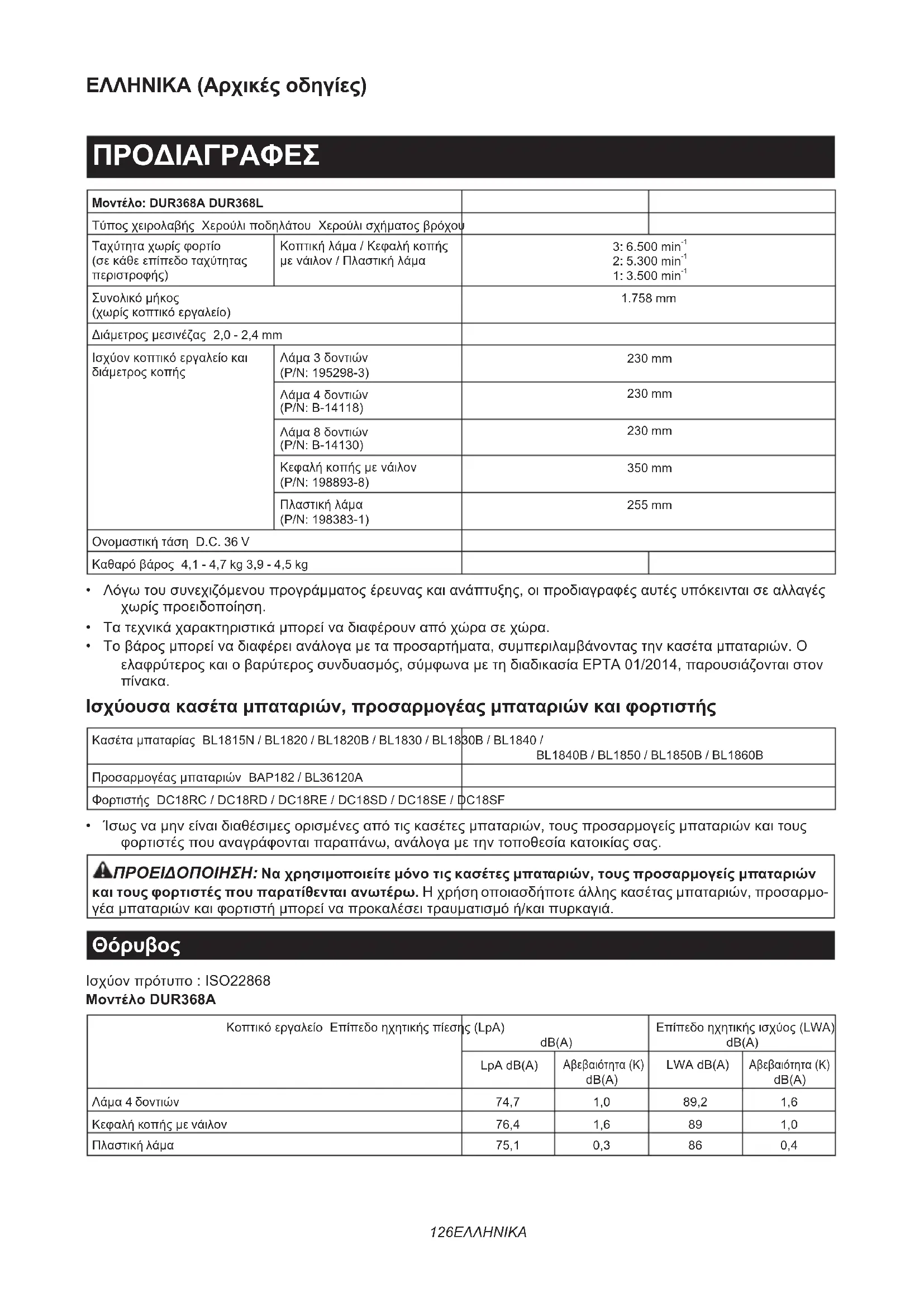 Ισχύονπρότυπο:ISO22868 Μοντέλο DUR368A Κοπτικόεργαλείο Επίπεδοηχητικήςπίεσης(LpA)dB(A)Επίπεδοηχητικήςισχύος(LWA)dB(A)LpA dB(A)Αβεβαιότητα(K)dB(A)LWAdB(A)Αβεβαιότητα(K)dB(A) Λάμα4δοντιών 74,7 1,0 89,2 1,6 Κεφαλήκοπήςμενάιλον 76,4 1,6 89 1,0 Πλαστικήλάμα 75,1 0,3 86 0,4127 ΕΛΛΗΝΙΚΑ Μοντέλο DUR368L Κοπτικόεργαλείο Επίπεδοηχητικήςπίεσης(LpA) dB(A) Επίπεδοηχητικήςισχύος(LWA) dB(A) LpA dB(A) Αβεβαιότητα(K) dB(A) LWAdB(A) Αβεβαιότητα(K) dB(A) Λάμα4δοντιών 74,7 1,0 89,2 1,6 Κεφαλήκοπήςμενάιλον 76,4 1,6 89 1,0 Πλαστικήλάμα 75,1 0,3 86 0,4