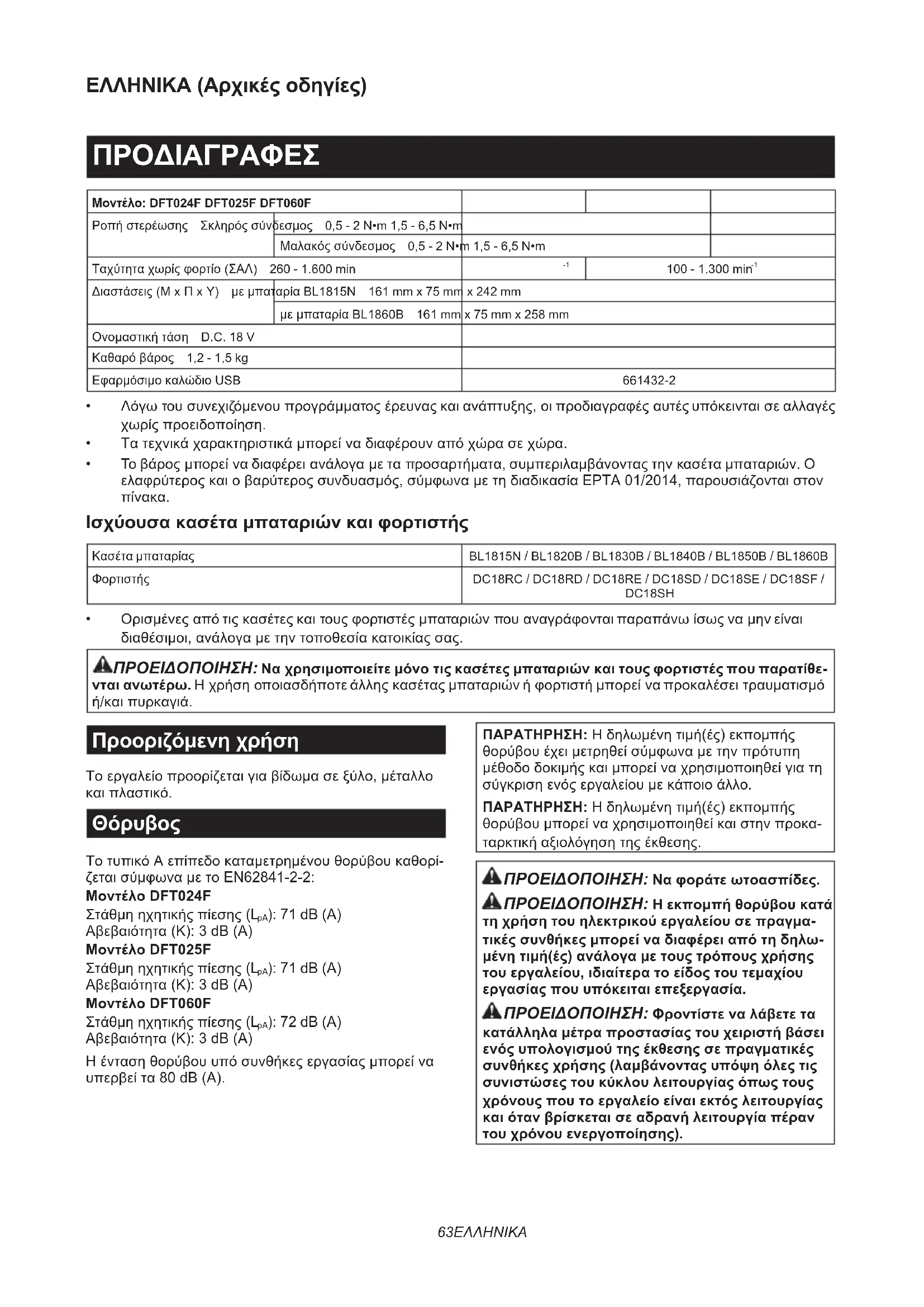 ΤοτυπικόΑεπίπεδοκαταμετρημένουθορύβουκαθορί- ζεταισύμφωναμετοEN62841-2-2: Μοντέλο DFT024F Στάθμηηχητικήςπίεσης(L