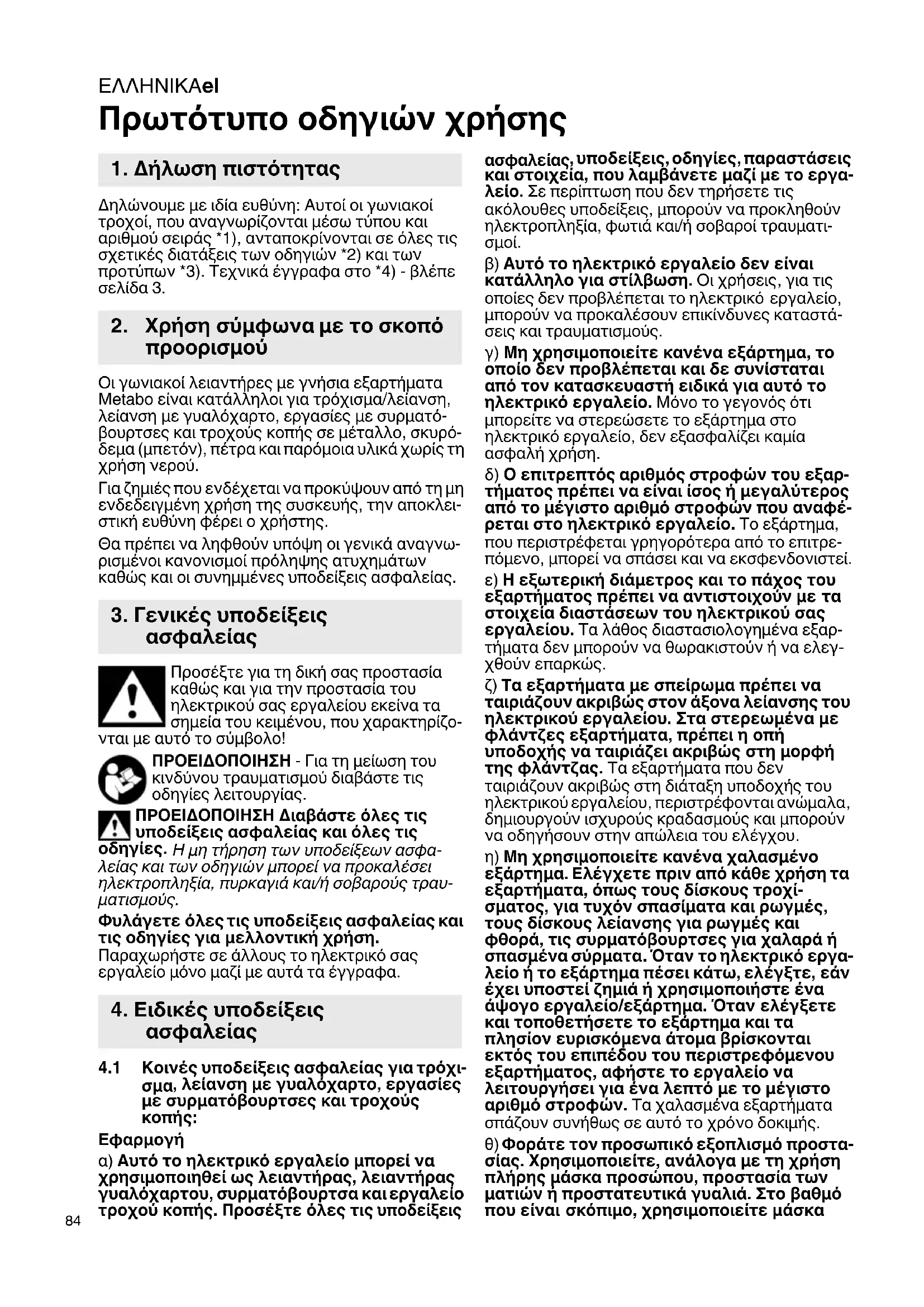 Πρωτότυπο οδηγιών χρήσης Δηλώνουμε με ιδία ευθύνη: Αυτοί οι γωνιακοί τροχοί, που αναγνωρίζονται μέσω τύπου και αριθμού σειράς *1), ανταποκρίνονται σε όλες τις σχετικές διατάξεις των οδηγιών *2) και των προτύπων *3). Τεχνικά έγγραφα στο *4) - βλέπε σελίδα 3. Οι γωνιακοί λειαντήρες με γνήσια εξαρτήματα Metabo είναι κατάλληλοι για τρόχισμα/λείανση, λείανση με γυαλόχαρτο, εργασίες με συρματό- βουρτσες και τροχούς κοπής σε μέταλλο, σκυρό- δεμα (μπετόν), πέτρα και παρόμοια υλικά χωρίς τη χρήση νερού. Για ζημιές που ενδέχεται να προκύψουν από τη μη ενδεδειγμένη χρήση της συσκευής, την αποκλει- στική ευθύνη φέρει ο χρήστης. Θα πρέπει να ληφθούν υπόψη οι γενικά αναγνω- ρισμένοι κανονισμοί πρόληψης ατυχημάτων καθώς και οι συνημμένες υποδείξεις ασφαλείας. Προσέξτε για τη δική σας προστασία καθώς και για την προστασία του ηλεκτρικού σας εργαλείου εκείνα τα σημεία του κειμένου, που χαρακτηρίζο- νται με αυτό το σύμβολο! ΠΡΟΕΙΔΟΠΟΙΗΣΗ - Για τη μείωση του κινδύνου τραυματισμού διαβάστε τις οδηγίες λειτουργίας. ΠΡΟΕΙΔΟΠΟΙΗΣΗ Διαβάστε όλες τις υποδείξεις ασφαλείας και όλες τις