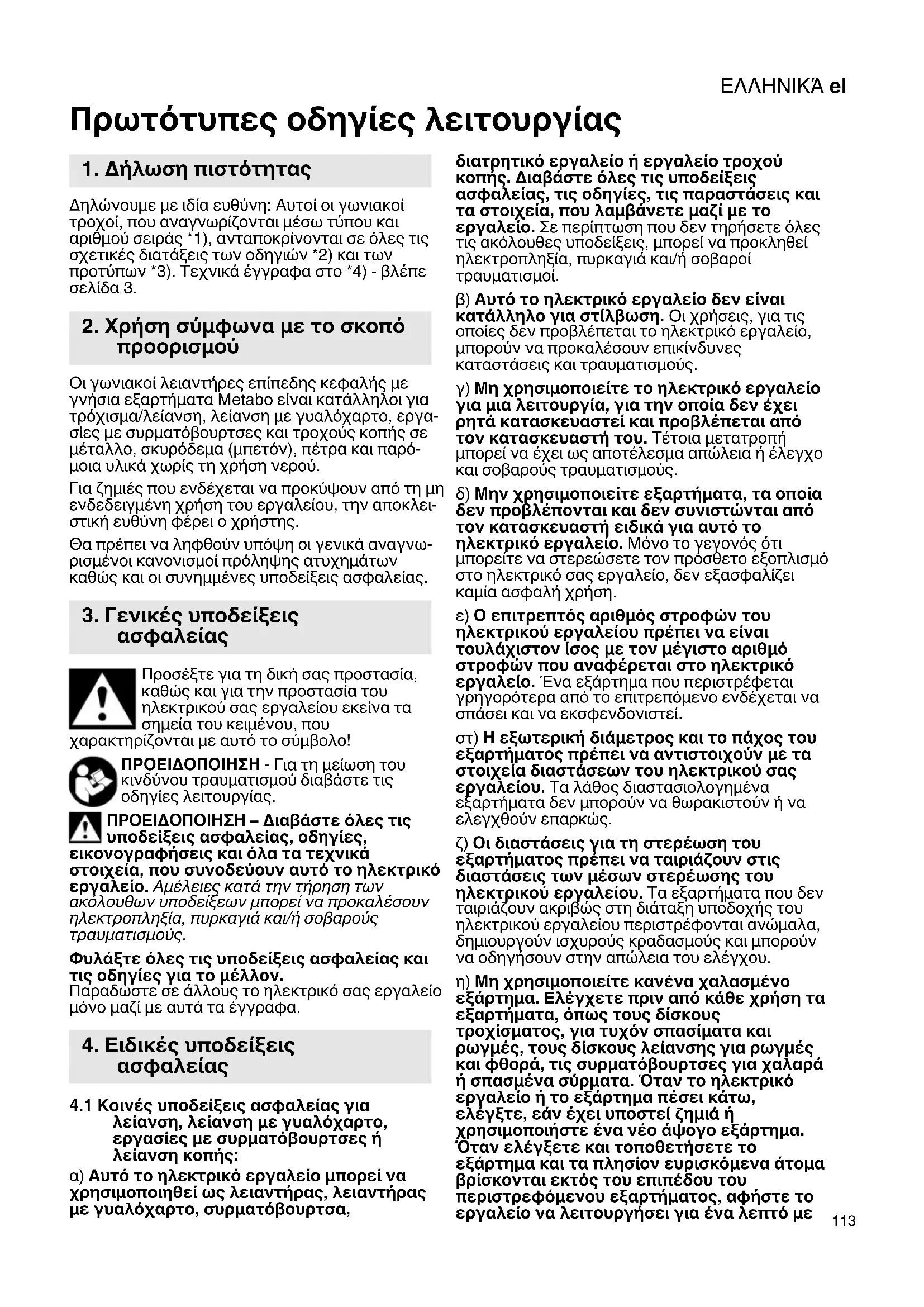 Πρωτότυπες οδηγίες λειτουργίας Δηλώνουμε με ιδία ευθύνη: Αυτοί οι γωνιακοί τροχοί, που αναγνωρίζονται μέσω τύπου και αριθμού σειράς *1), ανταποκρίνονται σε όλες τις σχετικές διατάξεις των οδηγιών *2) και των προτύπων *3). Τεχνικά έγγραφα στο *4) - βλέπε σελίδα 3. Οι γωνιακοί λειαντήρες επίπεδης κεφαλής με γνήσια εξαρτήματα Metabo είναι κατάλληλοι για τρόχισμα/λείανση, λείανση με γυαλόχαρτο, εργα- σίες με συρματόβουρτσες και τροχούς κοπής σε μέταλλο, σκυρόδεμα (μπετόν), πέτρα και παρό- μοια υλικά χωρίς τη χρήση νερού. Για ζημιές που ενδέχεται να προκύψουν από τη μη ενδεδειγμένη χρήση του εργαλείου, την αποκλει- στική ευθύνη φέρει ο χρήστης. Θα πρέπει να ληφθούν υπόψη οι γενικά αναγνω- ρισμένοι κανονισμοί πρόληψης ατυχημάτων καθώς και οι συνημμένες υποδείξεις ασφαλείας. Προσέξτε για τη δική σας προστασία, καθώς και για την προστασία του ηλεκτρικού σας εργαλείου εκείνα τα σημεία του κειμένου, που χαρακτηρίζονται με αυτό το σύμβολο! ΠΡΟΕΙΔΟΠΟΙΗΣΗ - Για τη μείωση του κινδύνου τραυματισμού διαβάστε τις οδηγίες λειτουργίας. ΠΡΟΕΙΔΟΠΟΙΗΣΗ – Διαβάστε όλες τις υποδείξεις ασφαλείας, οδηγίες, εικονογραφήσεις και όλα τα τεχνικά στοιχεία, που συνοδεύουν αυτό το ηλεκτρικό εργαλείο. Αμέλειες κατά την τήρηση των ακόλουθων υποδείξεων μπορεί να προκαλέσουν ηλεκτροπληξία, πυρκαγιά και/ή σοβαρούς τραυματισμούς. Φυλάξτε όλες τις υποδείξεις ασφαλείας και τις οδηγίες για το μέλλον. Παραδώστε σε άλλους το ηλεκτρικό σας εργαλείο μόνο μαζί με αυτά τα έγγραφα.