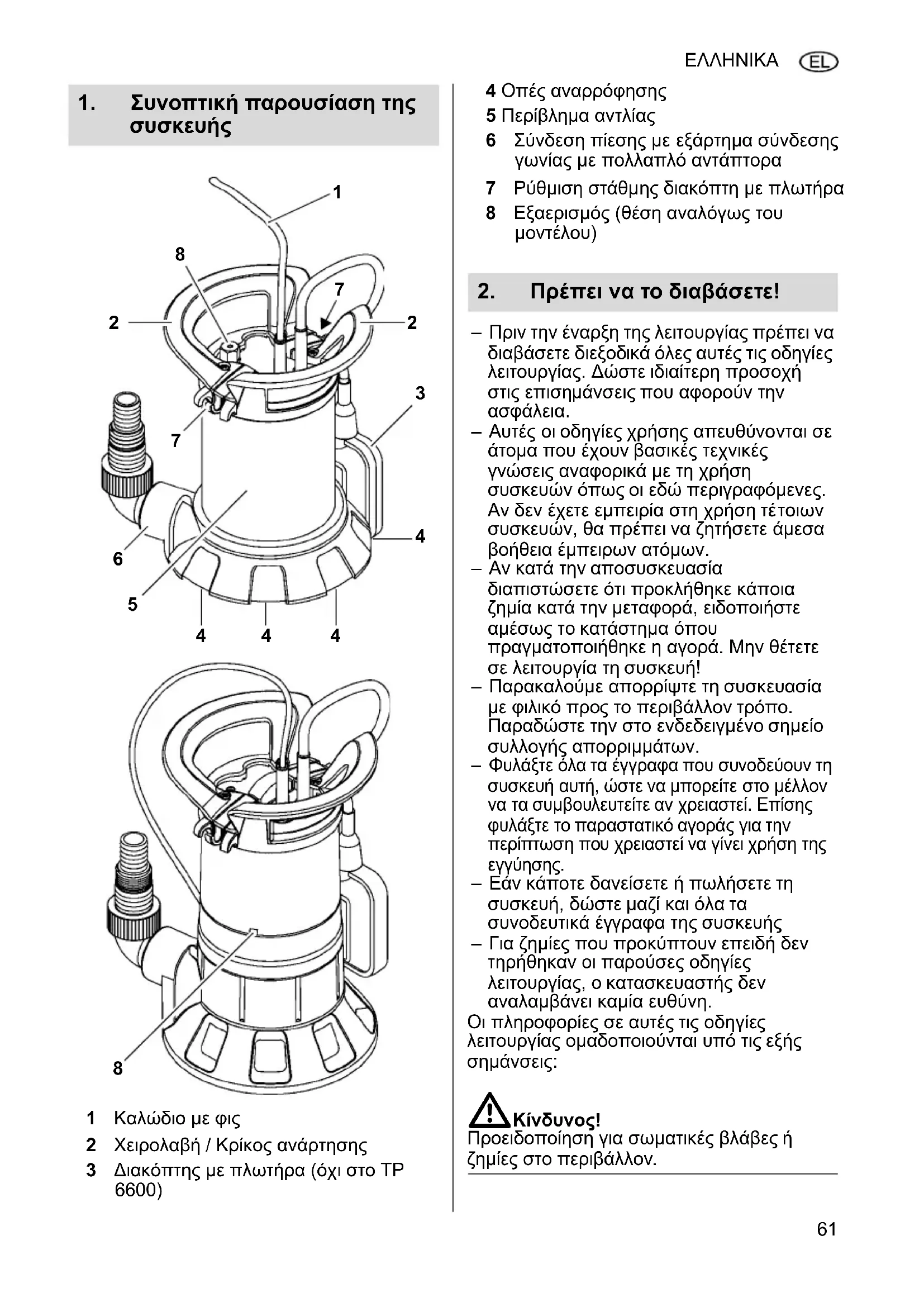 στο προς μεταφορά υγρό. Πριν από εργασίες στη συσκευή, βγάλτε το φις ρεύματος. BΚίνδυνος ηλεκτροπληξίας από ελαττώματα της συσκευής! Ελέγξτε τη συσκευή, ειδικά το καλώδιο ρεύματος, προέκτασης, το φις δικτύου, και το διακόπτη με πλωτήρα κάθε φορά πριν την έναρξη της λειτουργίας για να διαπιστωθεί μήπως υπάρχουν κάποιες βλάβες. Κίνδυνος θανάτου από ηλεκτροπληξία! Μην επισκευάζετε ποτέ μόνοι σας τη συσκευή! Αν οι επισκευές δεν γίν