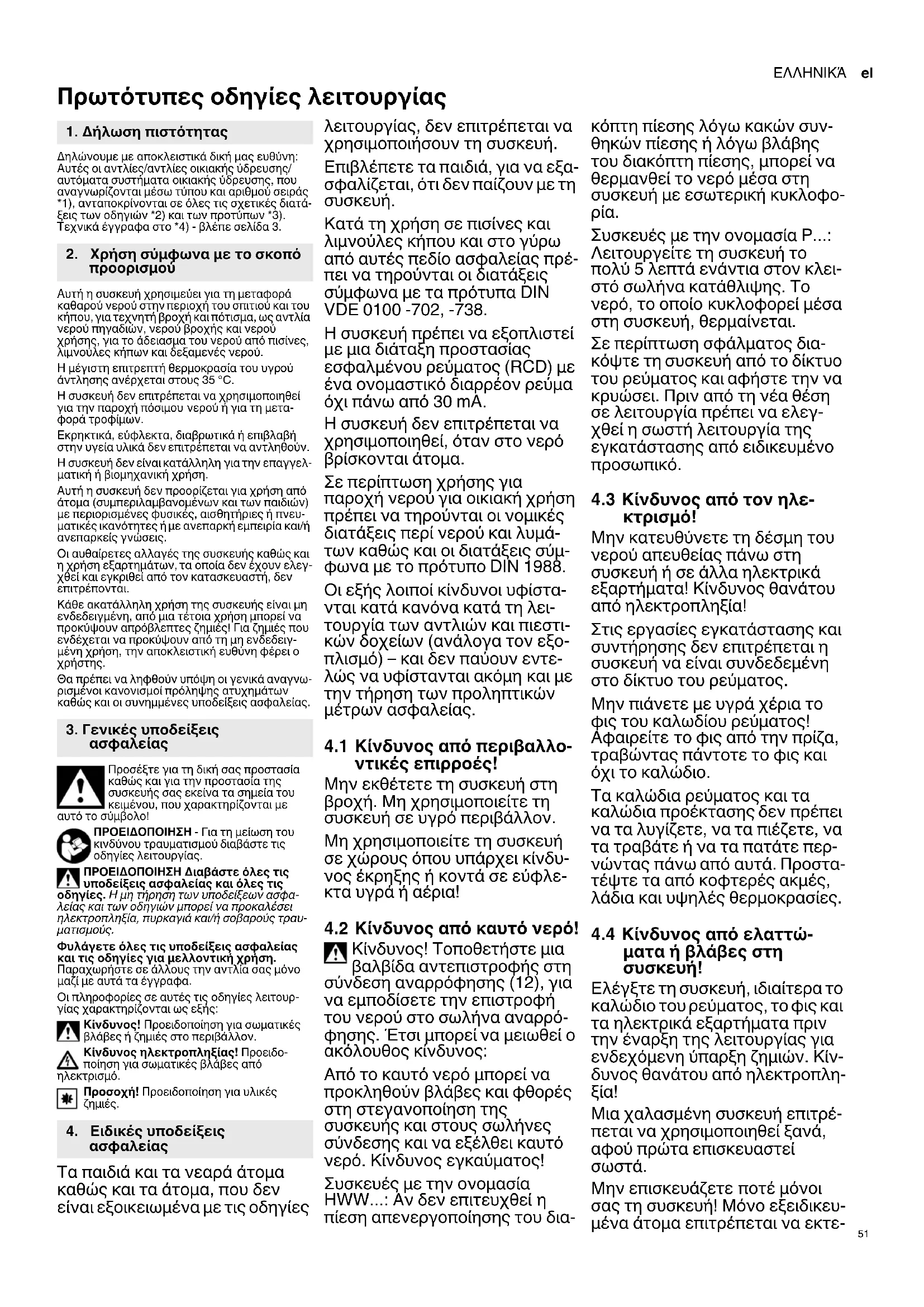 Κατά τη χρήση σε πισίνες και λιμνούλες κήπου και στο γύρω από αυτές πεδίο ασφαλείας πρέ- πει να τηρούνται οι διατάξεις σύμφωνα με τα πρότυπα DIN VDE 0100 -702, -738. Η συσκευή πρέπει να εξοπλιστεί με μια διάταξη προστασίας εσφαλμένου ρεύματος (RCD) με ένα ονομαστικό διαρρέον ρεύμα όχι πάνω από 30 mA. Η συσκευή δεν επιτρέπεται να χρησιμοποιηθεί, όταν στο νερό βρίσκονται άτομα. Σε περίπτωση χρήσης για παροχή νερού για οικιακή χρήση πρέπει να τηρούνται οι νομικές διατάξεις περί νερού και λυμά- των καθώς και οι διατάξεις σύμ- φωνα με το πρότυπο DIN 1988. Οι εξής λοιποί κίνδυνοι υφίστα- νται κατά κανόνα κατά τη λει- τουργία των αντλιών και πιεστι- κών δοχείων (ανάλογα τον εξο- πλισμό) – και δεν παύουν εντε- λώς να υφίστανται ακόμη