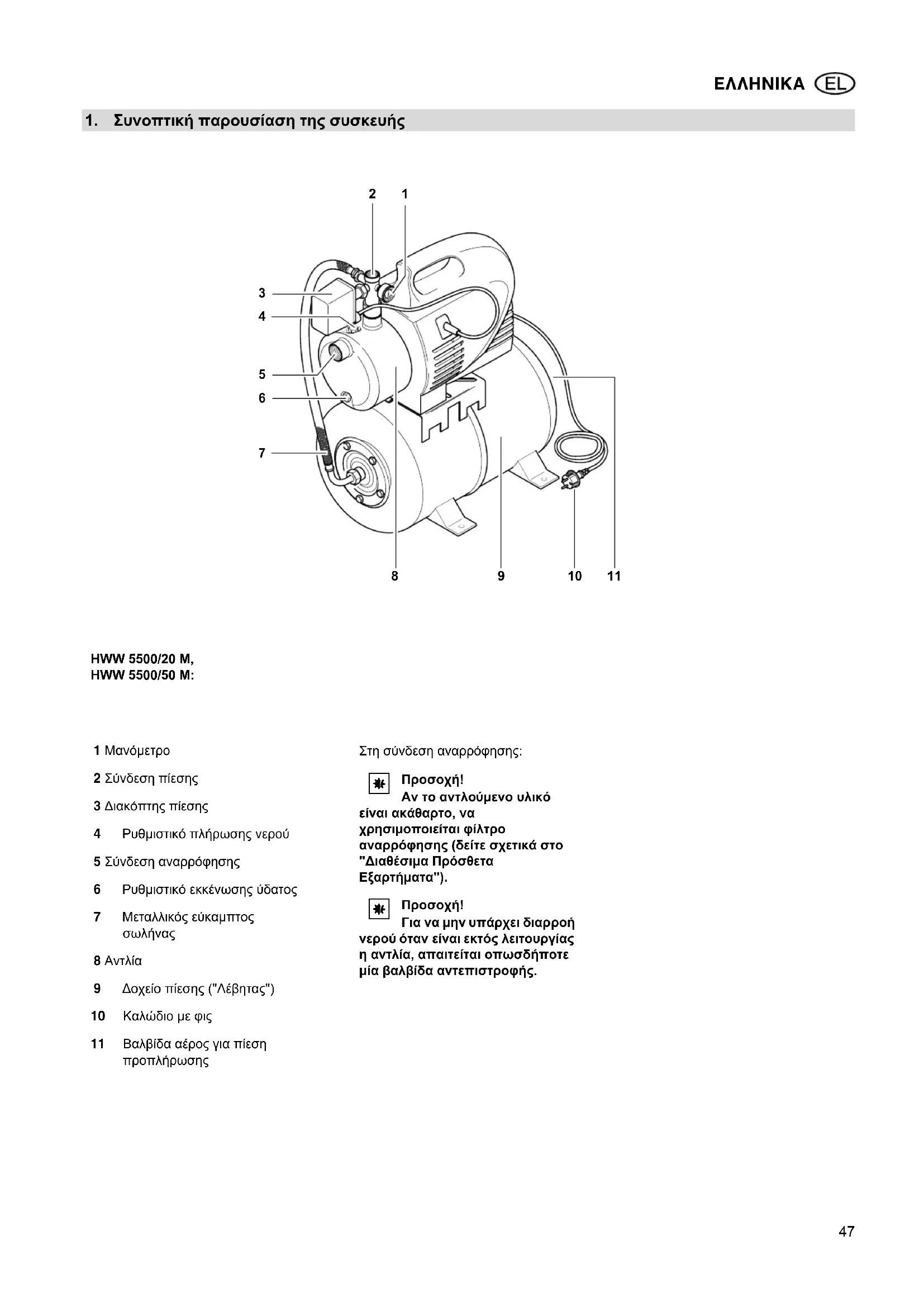 HWW 5500/20 M, HWW 5500/50 M: 1 Μανόμετρο 2 Σύνδεση πίεσης 3 Διακόπτης πίεσης 4 Ρυθμιστικό πλήρωσης νερού 5 Σύνδεση αναρρόφησης 6 Ρυθμιστικό εκκένωσης ύδατος 7 Μεταλλικός εύκαμπτος