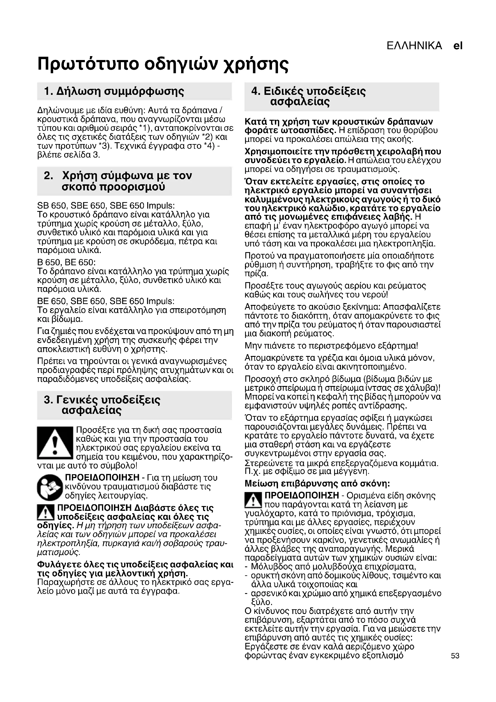 τρύπημα με κρούση σε σκυρόδεμα, πέτρα και παρόμοια υλικά. B 650, BE 650: Το δράπανο είναι κατάλληλο για τρύπημα χωρίς κρούση σε μέταλλο, ξύλο, συνθετικό υλικό και παρόμοια υλικά. BE 650, SBE 650, SBE 650 Impuls: Το εργαλείο είναι κατάλληλο για σπειροτόμηση και βίδωμα. Για ζημιές που ενδέχεται να προκύψουν από τη μη ενδεδειγμένη χρήση της συσκευής φέρει την αποκλειστική ευθύνη ο χρήστης. Πρέπει να τηρούνται οι γενικά αναγνωρισμένες προδιαγραφές περί πρόληψης ατυχημάτων και οι παραδιδόμενες υποδείξεις ασφαλείας. Προσέξτε για τη δική σας προστασία καθώς και για την προστασία του ηλεκτρικού σας εργαλείου εκείνα τα σημεία του κειμένου, που χαρακτηρίζο- νται με αυτό το σύμβολο! ΠΡΟΕΙΔΟΠΟΙΗΣΗ - Για τη μείωση του κινδύνου τραυματισμού διαβάστε τις οδηγίες λειτουργίας. ΠΡΟΕΙΔΟΠΟΙΗΣΗ Διαβάστε όλες τις υποδείξεις ασφαλείας και όλες τις οδηγίες. Η μη τήρηση των υποδείξεων ασφα- λείας και των οδηγιών μπορεί να προκαλέσει ηλεκτροπληξία, πυρκαγιά και/ή σοβαρούς τραυ-
