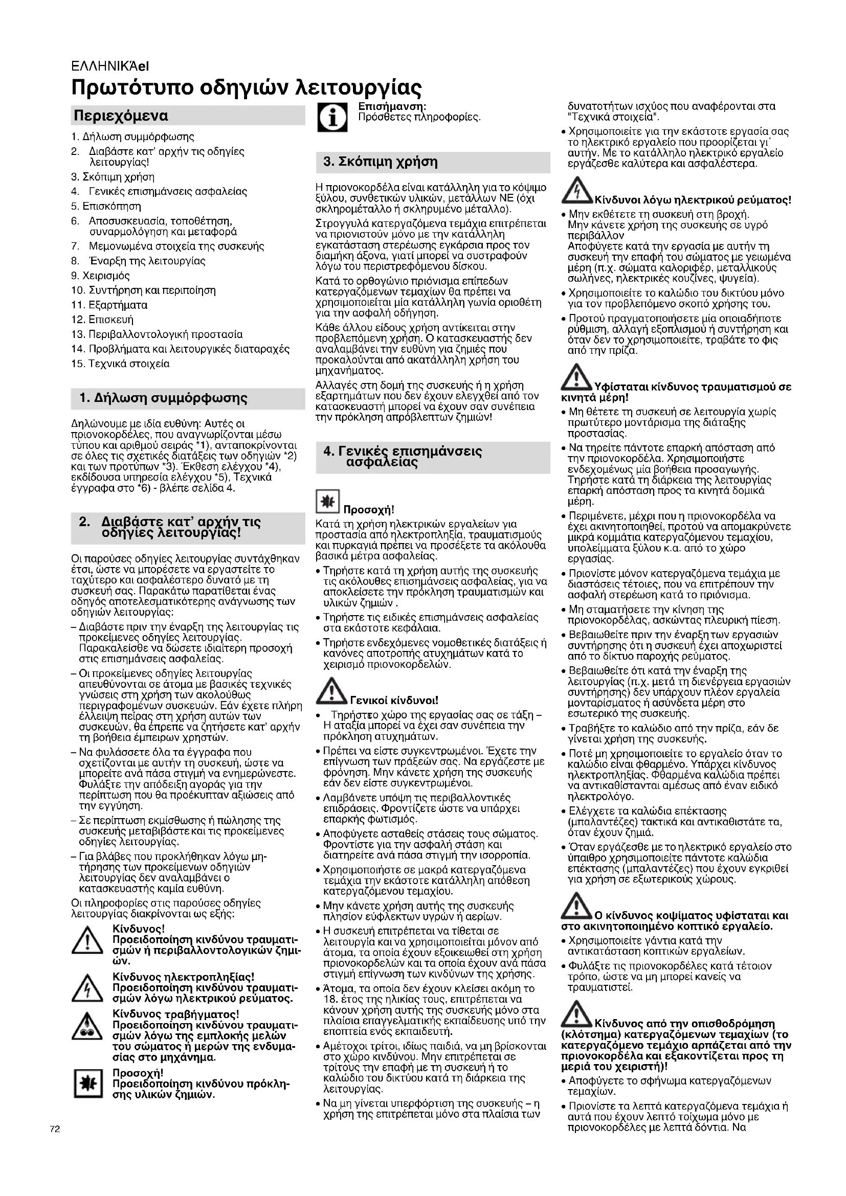 εποπτεία ενός εκπαιδευτή. Αμέτοχοι τρίτοι, ιδίως παιδιά, να μη βρίσκονται στο χώρο κινδύνου. Μην επιτρέπεται σε τρίτους την επαφή με τη συσκευή ή το καλώδιο του δικτύου κατά τη διάρκεια της λειτουργίας. Να μη γίνεται υπερφόρτιση της συσκευής – η χρήση της επιτρέπεται μόνο στα πλαίσια των δυνατοτήτων ισχύος που αναφέρονται στα "Τεχνικά στοιχεία". Χρησιμοποιείτε για την εκάστοτε εργασία σας το ηλεκτρικό εργαλείο που προορίζεται γι΄ αυτήν. Με το κατάλληλο ηλεκτρικό εργαλείο εργάζεσθε καλύτερα και ασφαλέστερα. Κίνδυνοι λόγω ηλεκτρικού ρεύματος! Μην εκθέτετε τη συσκευή στη βροχή. Μην κάνετε χρήση της συσκευής σε υγρό