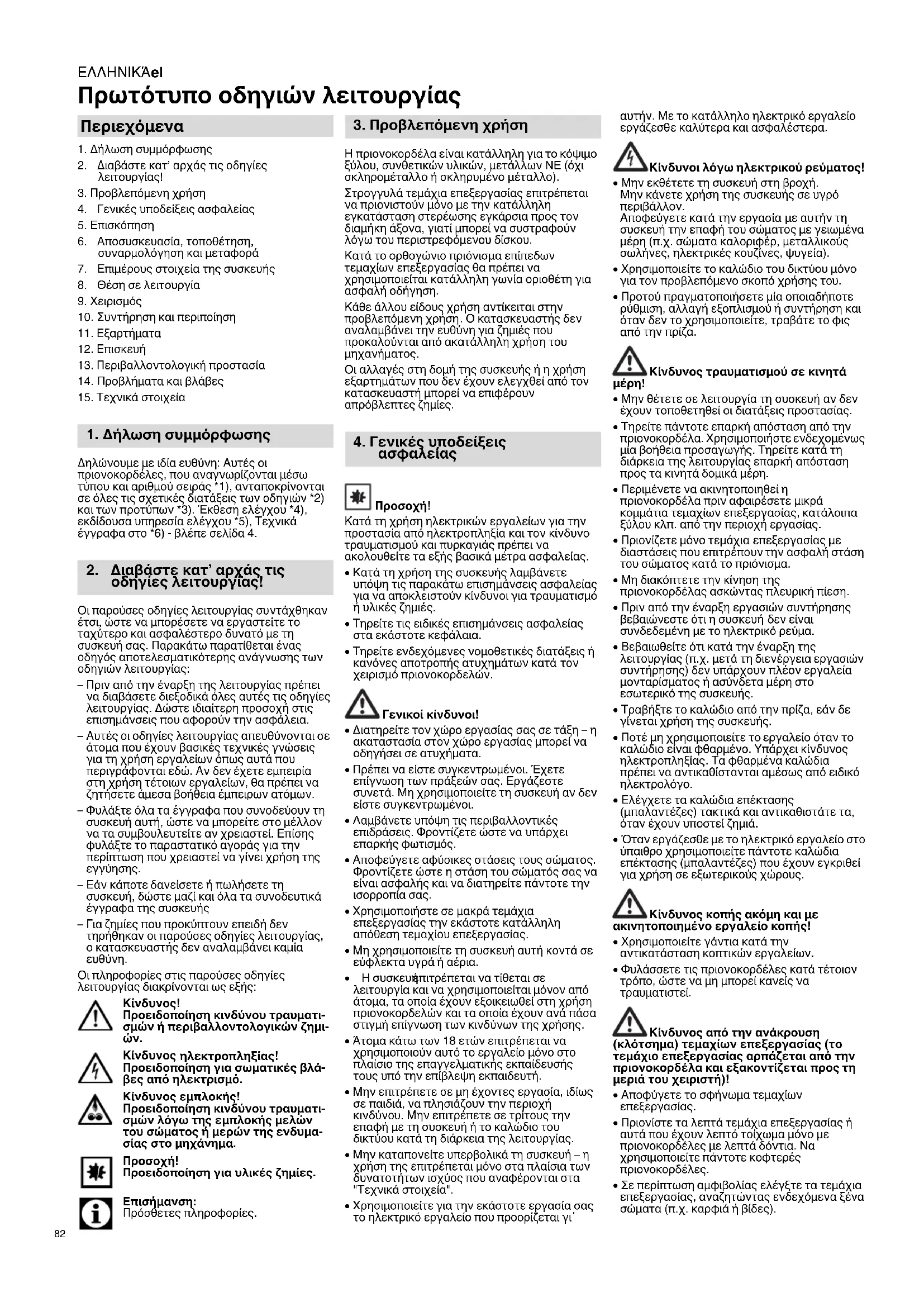 επιτρέπεται να τίθεται σε λειτουργία και να χρησιμοποιείται μόνον από άτομα, τα οποία έχουν εξοικειωθεί στη χρήση πριονοκορδελών και τα οποία έχουν ανά πάσα στιγμή επίγνωση των κινδύνων της χρήσης. Άτομα κάτω των 18 ετών επιτρέπεται να χρησιμοποιούν αυτό το εργαλείο μόνο στο πλαίσιο της επαγγελματικής εκπαίδευσής τους υπό την επίβλεψη εκπαιδευτή. Μην επιτρέπετε σε μη έχοντες εργασία, ιδίως σε παιδιά, να πλησιάζουν την περιοχή κινδύνου. Μην επιτρέπετε σε τρίτους την επαφή με τη συσκευή ή το καλώδιο του δικτύου κατά τη διάρκεια της λειτουργίας. Μην καταπονείτε υπερβολικά τη συσκευή – η χρήση της επιτρέπεται μόνο στα πλαίσια των δυνατοτήτων ισχύος που αναφέρονται στα "Τεχνικά στοιχεία". Χρησιμοποιείτε για την εκάστοτε εργασία σας το ηλεκτρικό εργαλείο που προορίζεται γι΄ αυτήν. Με το κατάλληλο ηλεκτρικό εργαλείο εργάζεσθε καλύτερα και ασφαλέστερα. Κίνδυνοι λόγω ηλεκτρικού ρεύματος! Μην εκθέτετε τη συσκευή στη βροχή. Μην κάνετε χρήση της συσκευής σε υγρό περιβάλλον. Αποφεύγετε κατά την εργασία με αυτήν τη συσκευή την επαφή του σώματος με γειωμένα μέρη (π.χ. σώματα καλοριφέρ, μεταλλικούς σωλήνες, ηλεκτρικές κουζίνες, ψυγεία). Χρησιμοποιείτε το καλώδιο του δικτύου μόνο για τον προβλεπόμενο σκοπό χρήσης του. Προτού πραγματοποιήσετε μία οποιαδήποτε ρύθμιση, αλλαγή εξοπλισμού ή συντήρηση και όταν δεν το χρησιμοποιείτε, τραβάτε το φις