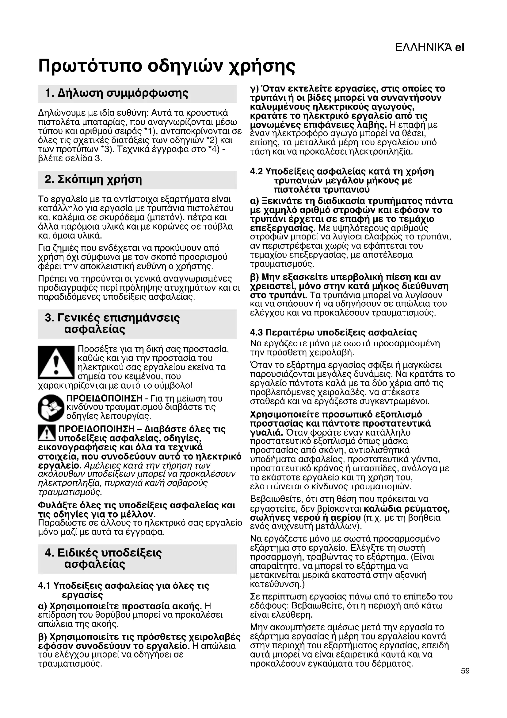 Πρωτότυπο οδηγιών χρήσης Δηλώνουμε με ιδία ευθύνη: Αυτά τα κρουστικά πιστολέτα μπαταρίας, που αναγνωρίζονται μέσω τύπου και αριθμού σειράς *1), ανταποκρίνονται σε όλες τις σχετικές διατάξεις των οδηγιών *2) και των προτύπων *3). Τεχνικά έγγραφα στο *4) - βλέπε σελίδα 3. Το εργαλείο με τα αντίστοιχα εξαρτήματα είναι κατάλληλο για εργασία με τρυπάνια πιστολέτου και καλέμια σε σκυρόδεμα (μπετόν), πέτρα και άλλα παρόμοια υλικά και με κορώνες σε τούβλα και όμοια υλικά. Για ζημιές που ενδέχεται να προκύψουν από χρήση όχι σύμφωνα με τον σκοπό προορισμού φέρει την αποκλειστική ευθύνη ο χρήστης. Πρέπει να τηρούνται οι γενικά αναγνωρισμένες προδιαγραφές περί πρόληψης ατυχημάτων και οι παραδιδόμενες υποδείξεις ασφαλείας. Προσέξτε για τη δική σας προστασία, καθώς και για την προστασία του ηλεκτρικού σας εργαλείου εκείνα τα σημεία του κειμένου, που χαρακτηρίζονται με αυτό το σύμβολο! ΠΡΟΕΙΔΟΠΟΙΗΣΗ - Για τη μείωση του κινδύνου τραυματισμού διαβάστε τις οδηγίες λειτουργίας. ΠΡΟΕΙΔΟΠΟΙΗΣΗ – Διαβάστε όλες τις υποδείξεις ασφαλείας, οδηγίες, εικονογραφήσεις και όλα τα τεχνικά στοιχεία, που συνοδεύουν αυτό το ηλεκτρικό εργαλείο. Αμέλειες κατά την τήρηση των ακόλουθων υποδείξεων μπορεί να προκαλέσουν ηλεκτροπληξία, πυρκαγιά και/ή σοβαρούς τραυματισμούς. Φυλάξτε όλες τις υποδείξεις ασφαλείας και τις οδηγίες για το μέλλον. Παραδώστε σε άλλους το ηλεκτρικό σας εργαλείο μόνο μαζί με αυτά τα έγγραφα.