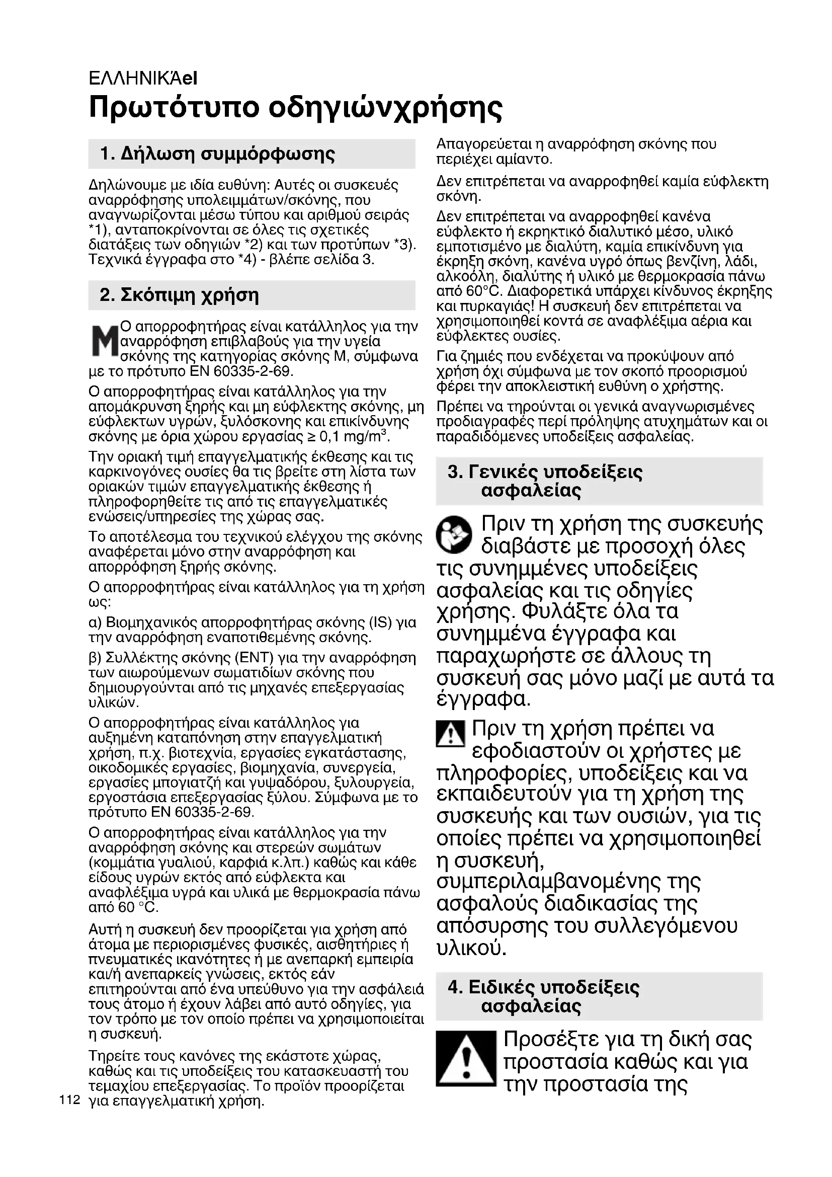 Μην ανοίγετε ποτέ τη συσκευή στο ύπαιθρο σε περίπτωση βροχής ή σε περίπτωση καταιγίδας. Η συσκευή δεν επιτρέπεται να λειτουργεί σε επικίνδυνους για έκρηξη χώρους Προσέξτε την ασφαλή στήριξη του απορροφητήρα. Όταν ο αέρας εξαερισμού επιστρέφει στο χώρο, πρέπει να υπάρχει ένας επαρκής ρυθμός αλλαγής του αέρα L στο χώρο. Προσέξτε τις εθνικές διατάξεις. Προσοχή! Αυτή η συσκευή εμπεριέχει βλαβερή για την υγεία σκόνη. Οι διαδικασίες εκκένωσης και συντήρησης, συμπεριλαμβανομένης της απόσυρσης των δοχείων συλλογής της σκόνης, επιτρέπεται να πραγματοποιούνται μόνο από ειδικευμένα άτομα, τα οποία φέρουν αντίστοιχο εξοπλισμό προστασίας. Προειδοποίηση από γενικό