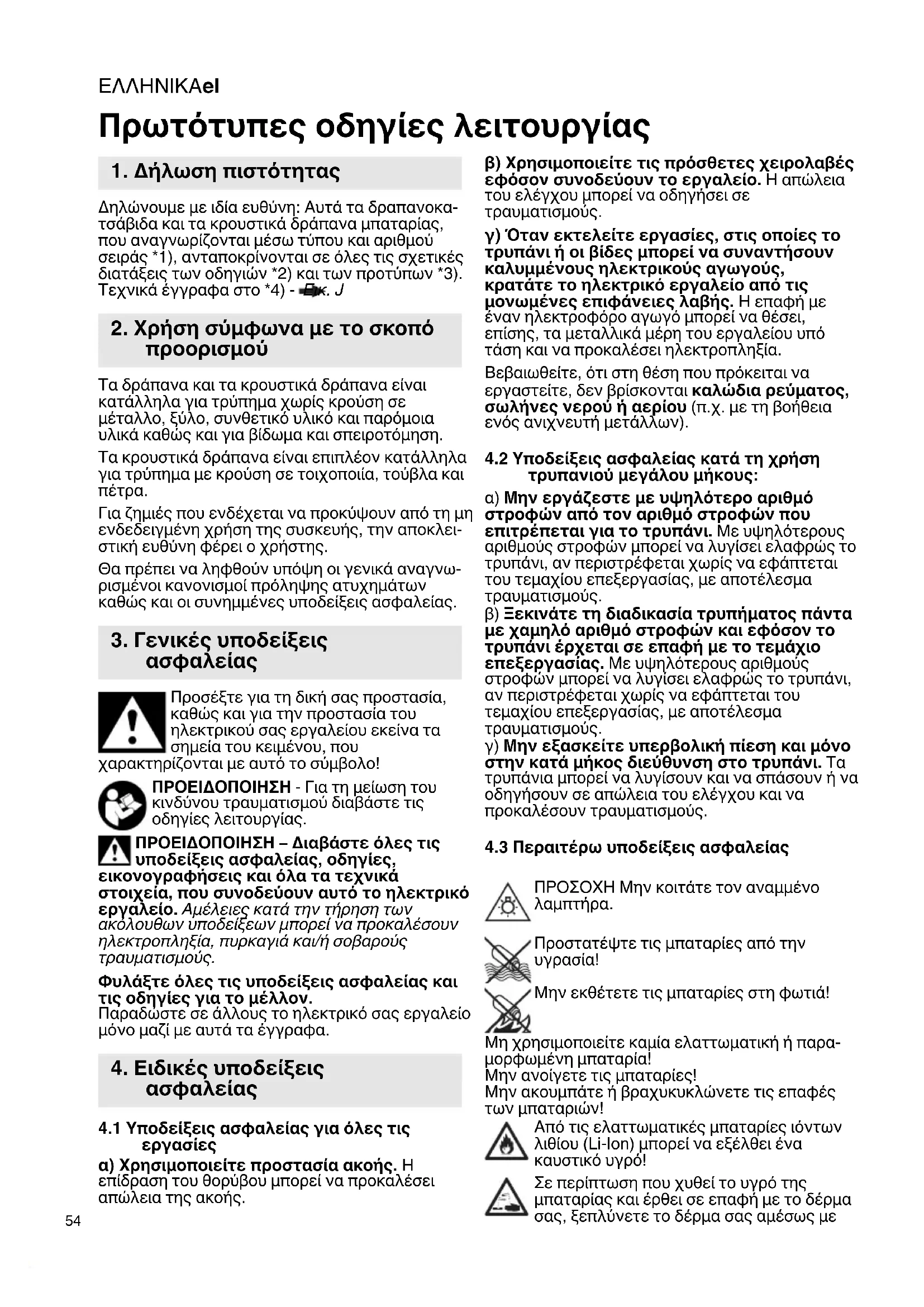 Δηλώνουμε με ιδία ευθύνη: Αυτά τα δραπανοκα- τσάβιδα και τα κρουστικά δράπανα μπαταρίας, που αναγνωρίζονται μέσω τύπου και αριθμού σειράς *1), ανταποκρίνονται σε όλες τις σχετικές διατάξεις των οδηγιών *2) και των προτύπων *3). Τεχνικά έγγραφα στο *4) - Εικ. J Τα δράπανα και τα κρουστικά δράπανα είναι κατάλληλα για τρύπημα χωρίς κρούση σε μέταλλο, ξύλο, συνθετικό υλικό και παρόμοια υλικά καθώς και για βίδωμα και σπειροτόμηση. Τα κρουστικά δράπανα είναι επιπλέον κατάλληλα για τρύπημα με κρούση σε τοιχοποιία, τούβλα και