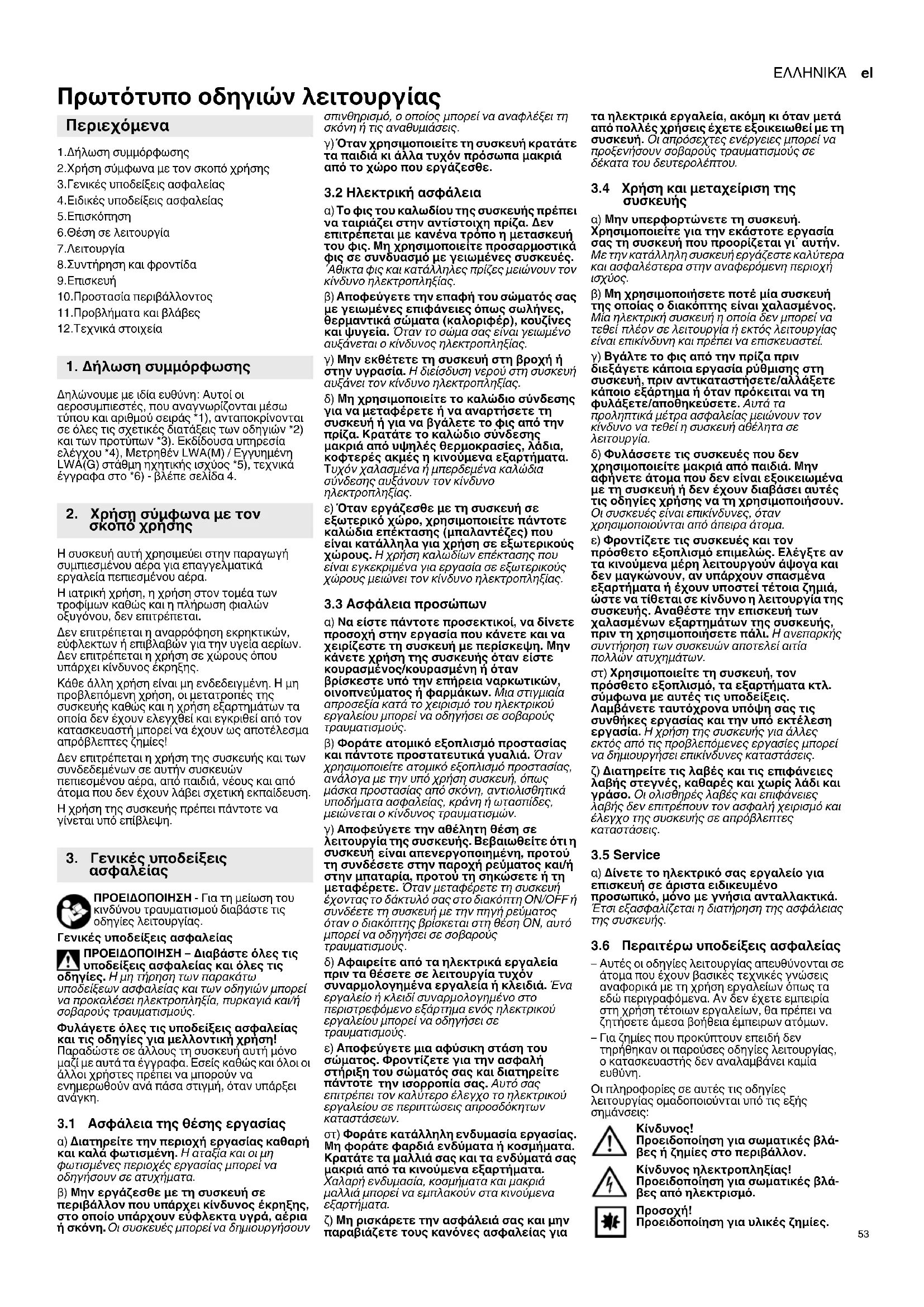 Πρωτότυπο οδηγιών λειτουργίας 1.Δήλωση συμμόρφωσης 2.Χρήση σύμφωνα με τον σκοπό χρήσης 3.Γενικές υποδείξεις ασφαλείας 4.Ειδικές υποδείξεις ασφαλείας 5.Επισκόπηση 6.Θέση σε λειτουργία 7.Λειτουργία 8.Συντήρηση και φροντίδα 9.Επισκευή 10.Προστασία περιβάλλοντος 11.Προβλήματα και βλάβες 12.Τεχνικά στοιχεία Δηλώνουμε με ιδία ευθύνη: Αυτοί οι αεροσυμπιεστές, που αναγνωρίζονται μέσω τύπου και αριθμού σειράς *1), ανταποκρίνονται σε όλες τις σχετικές διατάξεις των οδηγιών *2) και των προτύπων *3). Εκδίδουσα υπηρεσία ελέγχου *4), Μετρηθέν LWA(M) / Εγγυημένη LWA(G) στάθμη ηχητικής ισχύος *5), τεχνικά έγγραφα στο *6) - βλέπε σελίδα 4. Η συσκευή αυτή χρησιμεύει στην παραγωγή συμπιεσμένου αέρα για επαγγελματικά εργαλεία πεπιεσμένου αέρα. Η ιατρική χρήση, η χρήση στον τομέα των τροφίμων καθώς και η πλήρωση φιαλών οξυγόνου, δεν επιτρέπεται. Δεν επιτρέπεται η αναρρόφηση εκρηκτικών, εύφλεκτων ή επιβλαβών για την υγεία αερίων. Δεν επιτρέπεται η χρήση σε χώρους όπου υπάρχει κίνδυνος έκρηξης. Κάθε άλλη χρήση είναι μη ενδεδειγμένη. Η μη προβλεπόμενη χρήση, οι μετατροπές της συσκευής καθώς και η χρήση εξαρτημάτων τα οποία δεν έχουν ελεγχθεί και εγκριθεί από τον κατασκευαστή μπορεί να έχουν ως αποτέλεσμα απρόβλεπτες ζημίες! Δεν επιτρέπεται η χρήση της συσκευής και των συνδεδεμένων σε αυτήν συσκευών πεπιεσμένου αέρα, από παιδιά, νέους και από άτομα που δεν έχουν λάβει σχετική εκπαίδευση. Η χρήση της συσκευής πρέπει πάντοτε να γίνεται υπό επίβλεψη. ΠΡΟΕΙΔΟΠΟΙΗΣΗ - Για τη μείωση του κινδύνου τραυματισμού διαβάστε τις