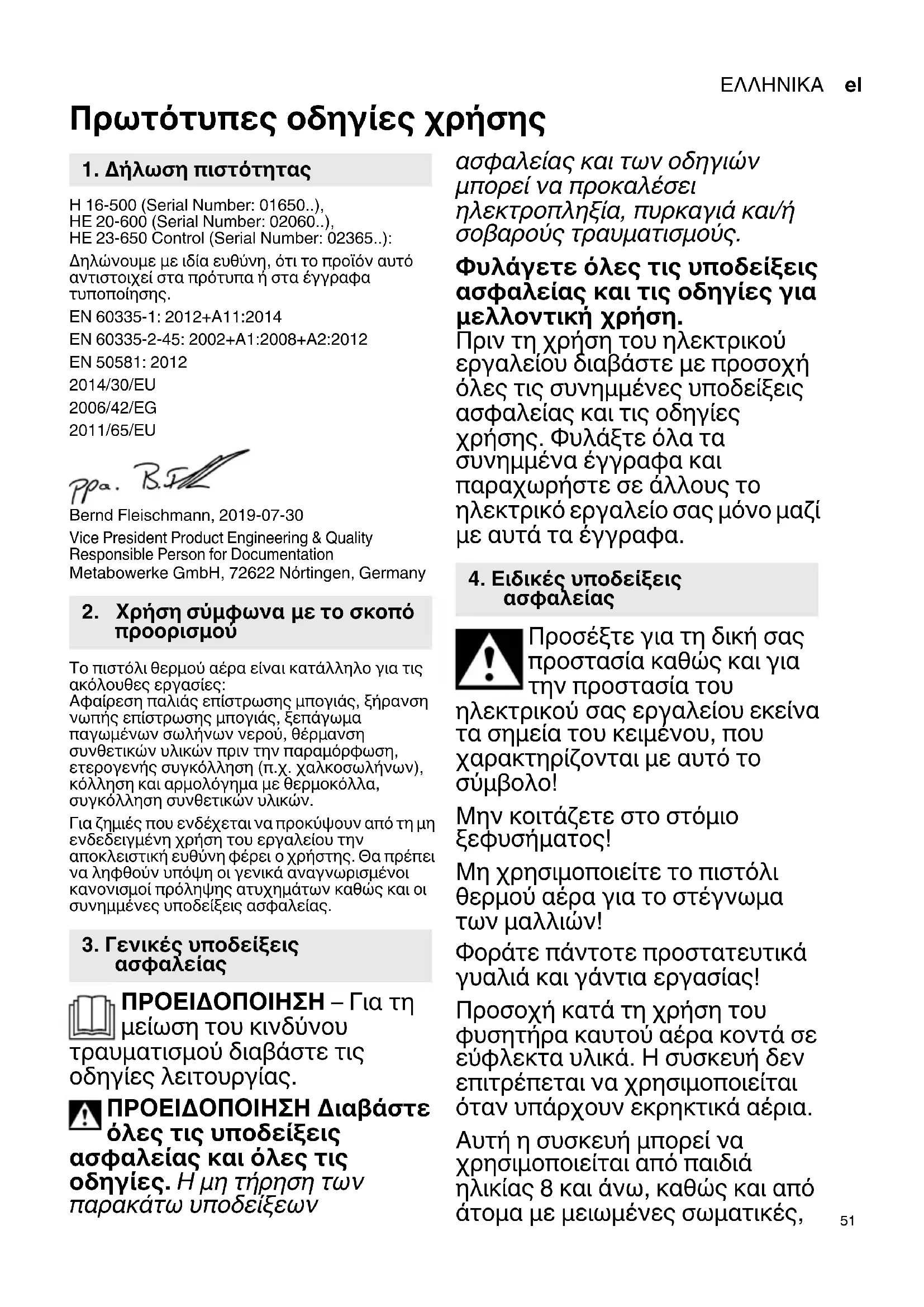 Πρωτότυπες οδηγίες χρήσης H 16-500 (Serial Number: 01650..), HE 20-600 (Serial Number: 02060..), HE 23-650 Control (Serial Number: 02365..): Δηλώνουμε με ιδία ευθύνη, ότι το προϊόν αυτό αντιστοιχεί στα πρότυπα ή στα έγγραφα τυποποίησης. EN 60335-1: 2012+A11:2014 EN 60335-2-45: 2002+A1:2008+A2:2012 EN 50581: 2012 2014/30/EU 2006/42/EG 2011/65/EU Bernd Fleischmann, 2019-07-30 Vice President Product Engineering & Quality Responsible Person for Documentation Metabowerke GmbH, 72622 Nόrtingen, Germany Το πιστόλι θερμού αέρα είναι κατάλληλο για τις ακόλουθες εργασίες: Αφαίρεση παλιάς επίστρωσης μπογιάς, ξήρανση νωπής επίστρωσης μπογιάς, ξεπάγωμα παγωμένων σωλήνων νερού, θέρμανση συνθετικών υλικών πριν την παραμόρφωση, ετερογενής συγκόλληση (π.χ. χαλκοσωλήνων), κόλληση και αρμολόγημα με θερμοκόλλα, συγκόλληση συνθετικών υλικών. Για ζημιές που ενδέχεται να προκύψουν από τη
