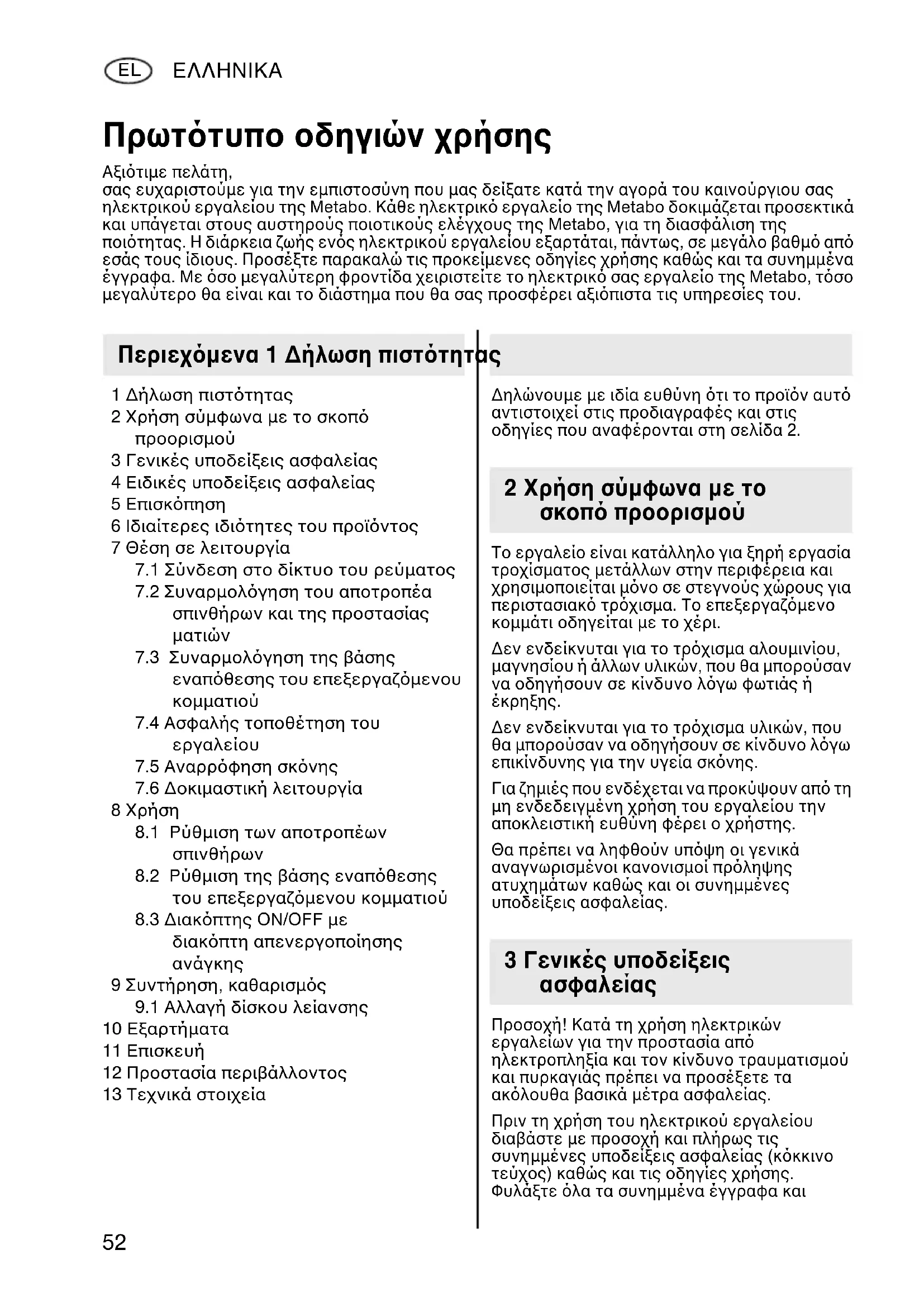 ∆εν ενδείκνυται για το τρχισµα υλικών, που θα µπορούσαν να οδηγήσουν σε κίνδυνο λγω επικίνδυνης για την υγεία σκνης. Για ζηµιές που ενδέχεται να προκύψουν απ τη µη ενδεδειγµένη χρήση του εργαλείου την αποκλειστική ευθύνη φέρει ο χρήστης. Θα πρέπει να ληφθούν υπψη οι γενικά αναγνωρισµένοι κανονισµοί πρληψης ατυχηµάτων καθώς και οι συνηµµένες υποδείξεις ασφαλείας. Προσοχή! Κατά τη χρήση ηλεκτρικών εργαλείων για την προστασία απ ηλεκτροπληξία και τον κίνδυνο τραυµατισµού και πυρκαγιάς πρέπει να προσέξετε τα ακλουθα βασικά µέτρα ασφαλείας. Πριν τη χρήση του ηλεκτρικού εργαλείου διαβάστε µε προσοχή και πλήρως τις συνηµµένες υποδείξεις ασφαλείας (κκκινο τεύχος) καθώς και τις οδηγίες χρήσης. Φυλάξτε λα τα συνηµµένα έγγραφα και Πρωττυπο οδηγιών χρήσης Αξιτιµε πελάτη, σας ευχαριστούµε για την εµπιστοσύνη που µας δείξατε κατά την αγορά του καινούργιου σας ηλεκτρικού εργαλείου της Metabo. Κάθε ηλεκτρικ εργαλείο της Metabo δοκιµάζεται προσεκτικά και υπάγεται στους αυστηρούς ποιοτικούς ελέγχους της Metabo, για τη διασφάλιση της ποιτητας. Η διάρκεια ζωής ενς ηλεκτρικού εργαλείου εξαρτάται, πάντως, σε µεγάλο βαθµ απ εσάς τους ίδιους. Προσέξτε παρακαλώ τις προκείµενες οδηγίες χρήσης καθώς και τα συνηµµένα έγγραφα. Με σο µεγαλύτερη φροντίδα χειριστείτε το ηλεκτρικ σας εργαλείο της Metabo, τσο µεγαλύτερο θα είναι και το διάστηµα που θα σας προσφέρει αξιπιστα τις υπηρεσίες του. Περιεχµενα 1 ∆ήλωση πισττητας 2 Χρήση σύµφωνα µε το σκοπ προορισµού 3 Γενικές υποδείξεις