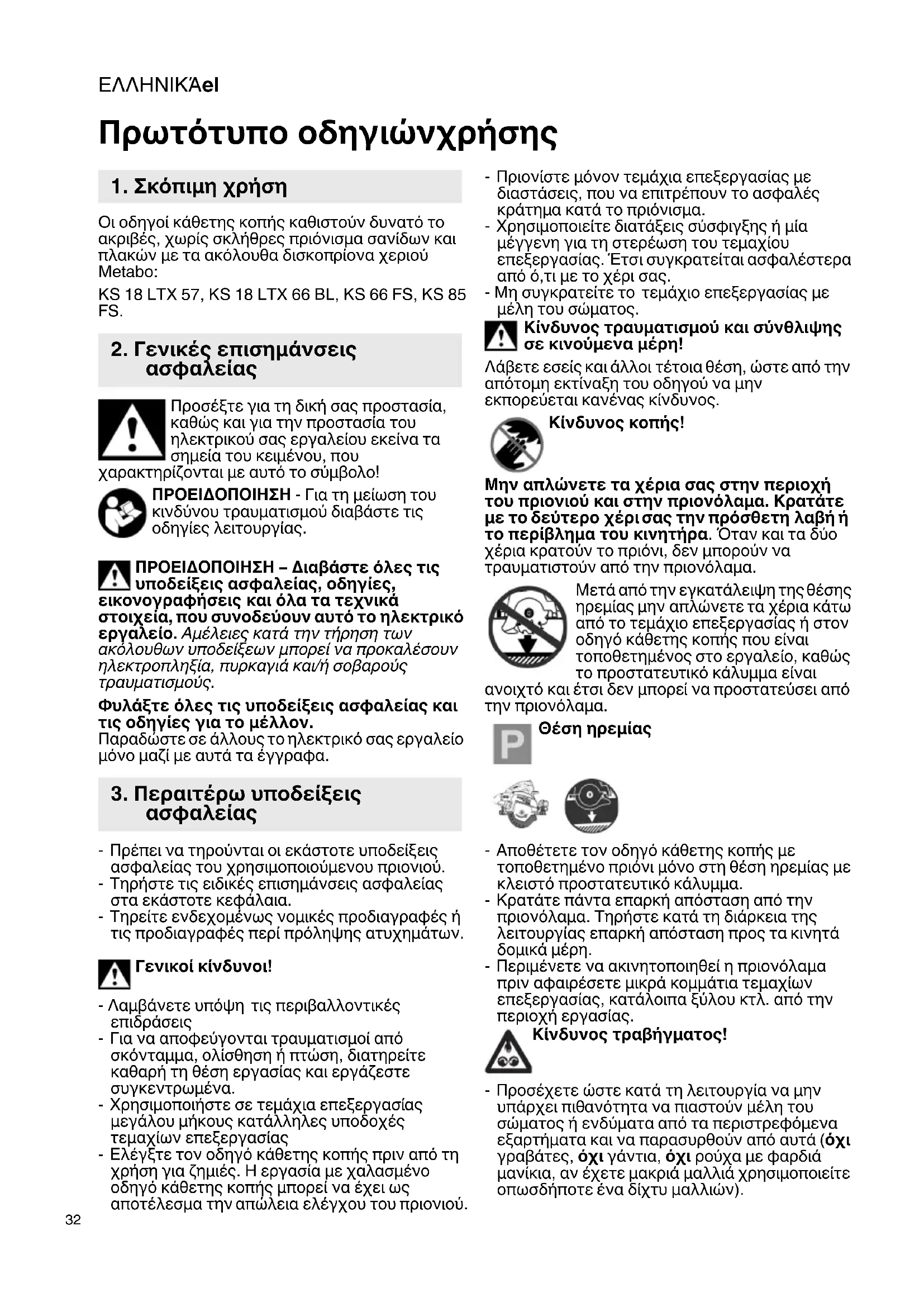 Οι οδηγοί κάθετης κοπής καθιστούν δυνατό το ακριβές, χωρίς σκλήθρες πριόνισμα σανίδων και πλακών με τα ακόλουθα δισκοπρίονα χεριού Metabo: KS 18 LTX 57, KS 18 LTX 66 BL, KS 66 FS, KS 85 FS. Προσέξτε για τη δική σας προστασία, καθώς και για την προστασία του ηλεκτρικού σας εργαλείου εκείνα τα σημεία του κειμένου, που χαρακτηρίζονται με αυτό το σύμβολο! ΠΡΟΕΙΔΟΠΟΙΗΣΗ - Για τη μείωση