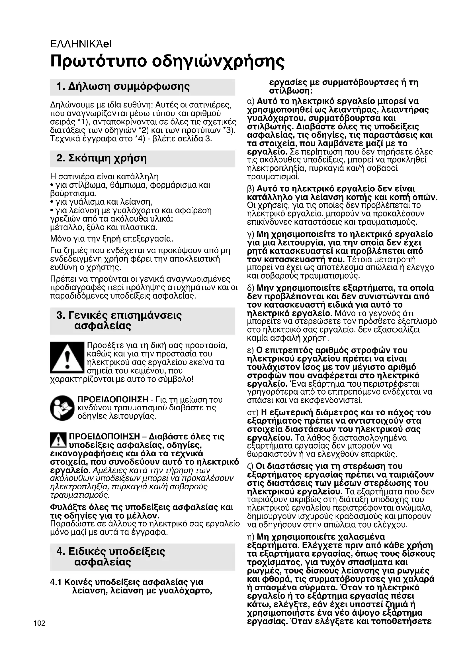 - για λείανση με γυαλόχαρτο και αφαίρεση γρεζιών από τα ακόλουθα υλικά: μέταλλο, ξύλο και πλαστικά. Μόνο για την ξηρή επεξεργασία. Για ζημιές που ενδέχεται να προκύψουν από μη ενδεδειγμένη χρήση φέρει την αποκλειστική ευθύνη ο χρήστης. Πρέπει να τηρούνται οι γενικά αναγνωρισμένες προδιαγραφές περί πρόληψης ατυχημάτων και οι παραδιδόμενες υποδείξεις ασφαλείας. Προσέξτε για τη δική σας προστασία, καθώς και για την προστασία του ηλεκτρικού σας εργαλείου εκείνα τα σημεία του κειμένου, που χαρακτηρίζονται με αυτό το σύμβολο! ΠΡΟΕΙΔΟΠΟΙΗΣΗ - Για τη μείωση του κινδύνου τραυματισμού διαβάστε τις οδηγίες λειτουργίας. ΠΡΟΕΙΔΟΠΟΙΗΣΗ – Διαβάστε όλες τις υποδείξεις ασφαλείας, οδηγίες, εικονογραφήσεις και όλα τα τεχνικά στοιχεία, που συνοδεύουν αυτό το ηλεκτρικό εργαλείο. Αμέλειες κατά την τήρηση των ακόλουθων υποδείξεων μπορεί να προκαλέσουν ηλεκτροπληξία, πυρκαγιά και/ή σοβαρούς τραυματισμούς. Φυλάξτε όλες τις υποδείξεις ασφαλείας και τις οδηγίες για το μέλλον. Παραδώστε σε άλλους το ηλεκτρικό σας εργαλείο μόνο μαζί με αυτά τα έγγραφα.