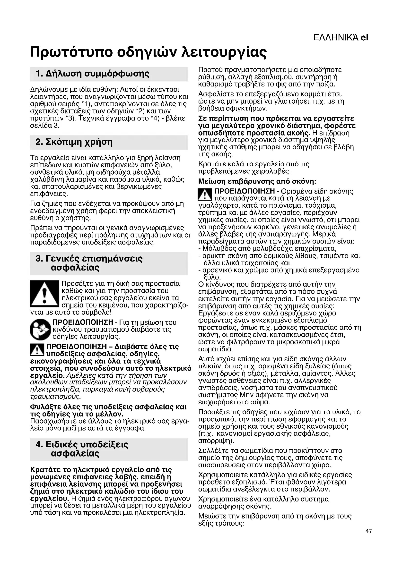 Πρωτότυπο οδηγιών λειτουργίας Δηλώνουμε με ιδία ευθύνη: Αυτοί οι έκκεντροι λειαντήρες, που αναγνωρίζονται μέσω τύπου και αριθμού σειράς *1), ανταποκρίνονται σε όλες τις σχετικές διατάξεις των οδηγιών *2) και των προτύπων *3). Τεχνικά έγγραφα στο *4) - βλέπε σελίδα 3. Το εργαλείο είναι κατάλληλο για ξηρή λείανση επίπεδων και κυρτών επιφανειών από ξύλο, συνθετικά υλικά, μη σιδηρούχα μέταλλα, χαλύβδινη λαμαρίνα και παρόμοια υλικά, καθώς και σπατουλαρισμένες και βερνικωμένες επιφάνειες. Για ζημιές που ενδέχεται να προκύψουν από μη ενδεδειγμένη χρήση φέρει την αποκλειστική ευθύνη ο χρήστης. Πρέπει να τηρούνται οι γενικά αναγνωρισμένες προδιαγραφές περί πρόληψης ατυχημάτων και οι παραδιδόμενες υποδείξεις ασφαλείας. Προσέξτε για τη δική σας προστασία καθώς και για την προστασία του ηλεκτρικού σας εργαλείου εκείνα τα σημεία του κειμένου, που χαρακτηρίζο- νται με αυτό το σύμβολο! ΠΡΟΕΙΔΟΠΟΙΗΣΗ - Για τη μείωση του κινδύνου τραυματισμού διαβάστε τις οδηγίες λειτουργίας. ΠΡΟΕΙΔΟΠΟΙΗΣΗ – Διαβάστε όλες τις υποδείξεις ασφαλείας, οδηγίες, εικονογραφήσεις και όλα τα τεχνικά στοιχεία, που συνοδεύουν αυτό το ηλεκτρικό εργαλείο. Αμέλειες κατά την τήρηση των ακόλουθων υποδείξεων μπορεί να προκαλέσουν ηλεκτροπληξία, πυρκαγιά και/ή σοβαρούς τραυματισμούς. Φυλάξτε όλες τις υποδείξεις ασφαλείας και τις οδηγίες για το μέλλον. Παραχωρήστε σε άλλους το ηλεκτρικό σας εργα- λείο μόνο μαζί με αυτά τα έγγραφα. Κρατάτε το ηλεκτρικό εργαλείο από τις μονωμένες επιφάνειες λαβής, επειδή η επιφάνεια λείανσης μπορεί να προξενήσει ζημιά στο ηλεκτρικό καλώδιο του ίδιου του εργαλείου. Η ζημιά ενός ηλεκτροφόρου αγωγού μπορεί να θέσει τα μεταλλικά μέρη του εργαλείου υπό τάση και να προκαλέσει μια ηλεκτροπληξία. Προτού πραγματοποιήσετε μία οποιαδήποτε ρύθμιση, αλλαγή εξοπλισμού, συντήρηση ή καθαρισμό τραβήξτε το φις από την πρίζα. Ασφαλίστε το επεξεργαζόμενο κομμάτι έτσι, ώστε να μην μπορεί να γλιστρήσει, π.χ. με τη βοήθεια σφιγκτήρων. Σε περίπτωση που πρόκειται να εργαστείτε για μεγαλύτερο χρονικό διάστημα, φορέστε οπωσδήποτε προστασία ακοής. Η επίδραση για μεγαλύτερο χρονικό διάστημα υψηλής ηχητικής στάθμης μπορεί να οδηγήσει σε βλάβη