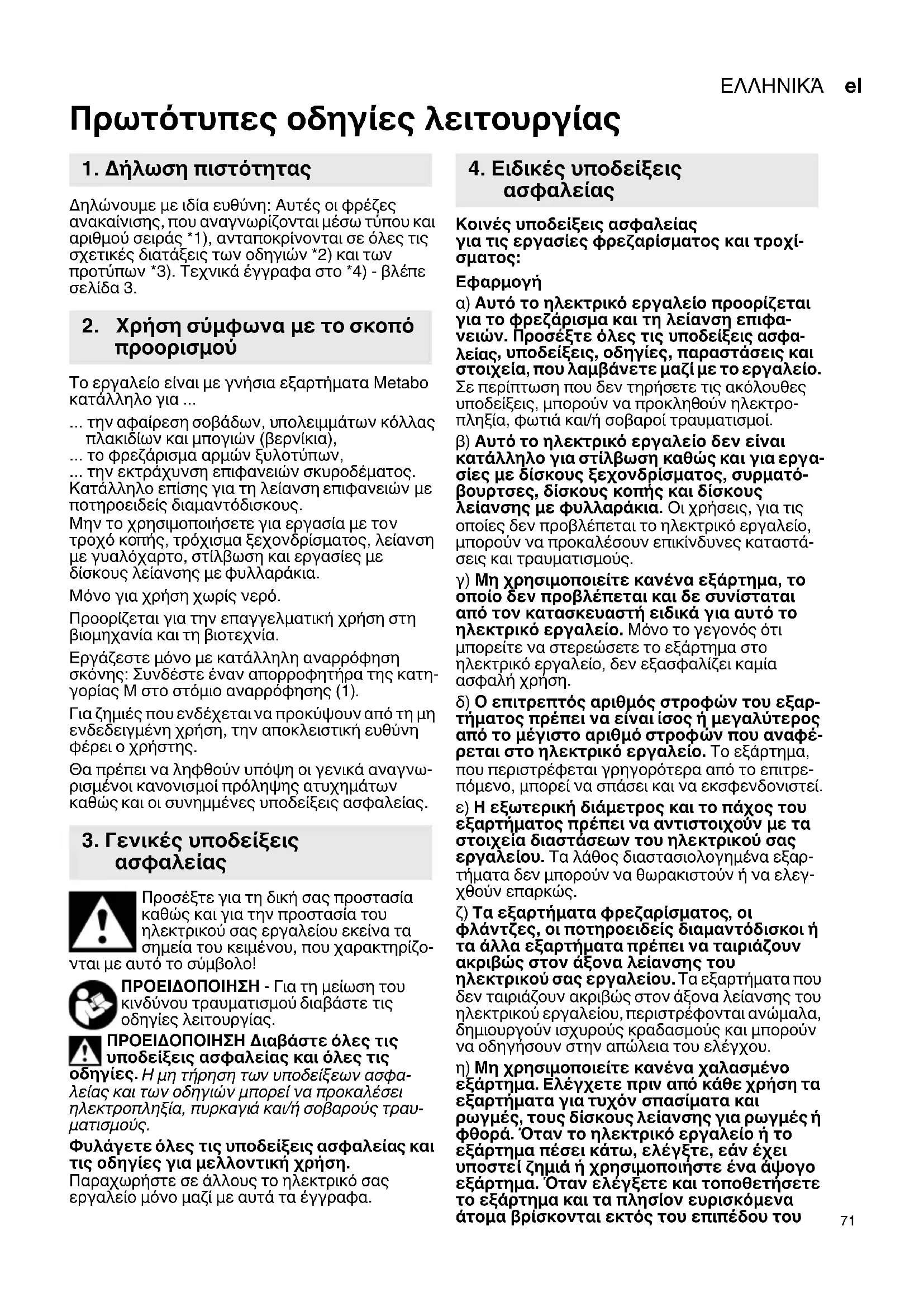 Πρωτότυπες οδηγίες λειτουργίας Δηλώνουμε με ιδία ευθύνη: Αυτές οι φρέζες ανακαίνισης, που αναγνωρίζονται μέσω τύπου και αριθμού σειράς *1), ανταποκρίνονται σε όλες τις σχετικές διατάξεις των οδηγιών *2) και των προτύπων *3). Τεχνικά έγγραφα στο *4) - βλέπε σελίδα 3. Το εργαλείο είναι με γνήσια εξαρτήματα Metabo κατάλληλο για ... ... την αφαίρεση σοβάδων, υπολειμμάτων κόλλας πλακιδίων και μπογιών (βερνίκια), ... το φρεζάρισμα αρμών ξυλοτύπων, ... την εκτράχυνση επιφανειών σκυροδέματος. Κατάλληλο επίσης για τη λείανση επιφανειών με ποτηροειδείς διαμαντόδισκους. Μην το χρησιμοποιήσετε για εργασία με τον τροχό κοπής, τρόχισμα ξεχονδρίσματος, λείανση με γυαλόχαρτο, στίλβωση και εργασίες με δίσκους λείανσης με φυλλαράκια. Μόνο για χρήση χωρίς νερό. Προορίζεται για την επαγγελματική χρήση στη βιομηχανία και τη βιοτεχνία. Εργάζεστε μόνο με κατάλληλη αναρρόφηση σκόνης: Συνδέστε έναν απορροφητήρα της κατη- γορίας M στο στόμιο αναρρόφησης (1). Για ζημιές που ενδέχεται να προκύψουν από τη μη ενδεδειγμένη χρήση, την αποκλειστική ευθύνη φέρει ο χρήστης. Θα πρέπει να ληφθούν υπόψη οι γενικά αναγνω- ρισμένοι κανονισμοί πρόληψης ατυχημάτων καθώς και οι συνημμένες υποδείξεις ασφαλείας. Προσέξτε για τη δική σας προστασία καθώς και για την προστασία του ηλεκτρικού σας εργαλείου εκείνα τα σημεία του κειμένου, που χαρακτηρίζο- νται με αυτό το σύμβολο! ΠΡΟΕΙΔΟΠΟΙΗΣΗ - Για τη μείωση του κινδύνου τραυματισμού διαβάστε τις οδηγίες λειτουργίας. ΠΡΟΕΙΔΟΠΟΙΗΣΗ Διαβάστε όλες τις υποδείξεις ασφαλείας και όλες τις