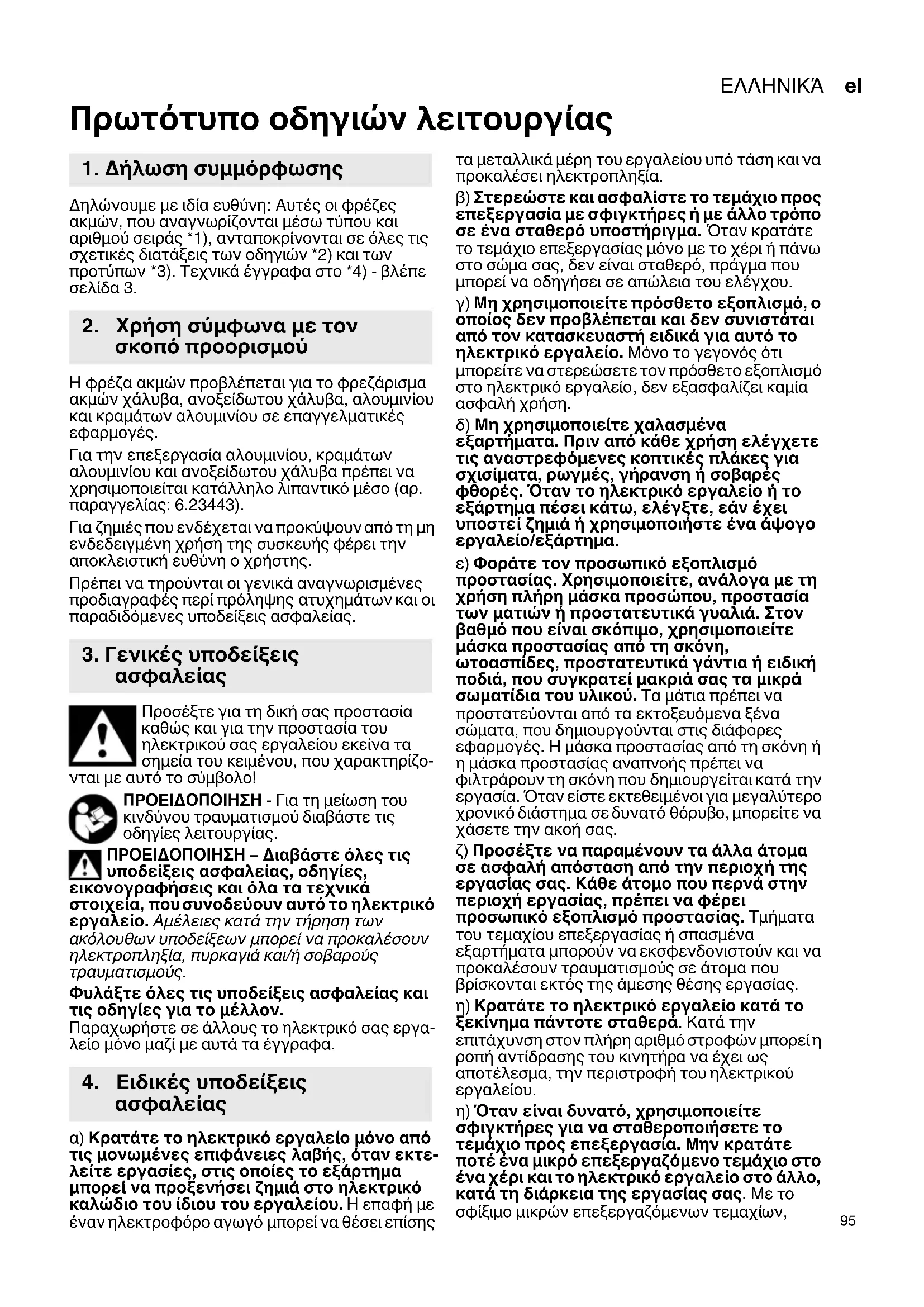 Πρωτότυπο οδηγιών λειτουργίας Δηλώνουμε με ιδία ευθύνη: Αυτές οι φρέζες ακμών, που αναγνωρίζονται μέσω τύπου και αριθμού σειράς *1), ανταποκρίνονται σε όλες τις σχετικές διατάξεις των οδηγιών *2) και των προτύπων *3). Τεχνικά έγγραφα στο *4) - βλέπε σελίδα 3. Η φρέζα ακμών προβλέπεται για το φρεζάρισμα ακμών χάλυβα, ανοξείδωτου χάλυβα, αλουμινίου και κραμάτων αλουμινίου σε επαγγελματικές