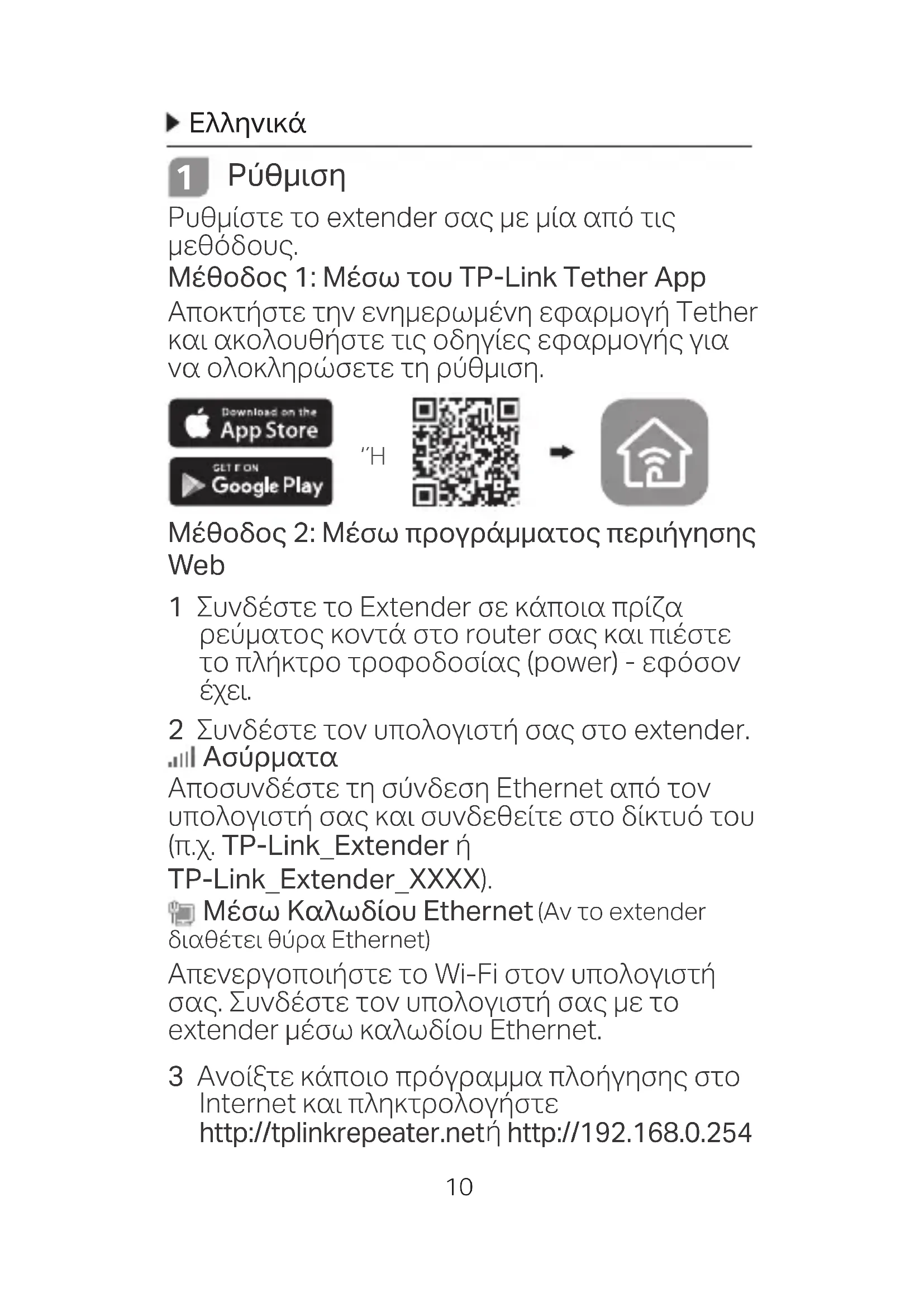Μέθοδος 1: Μέσω του TP-Link Tether App Αποκτήστε την ενημερωμένη εφαρμογή Tether και ακολουθήστε τις οδηγίες εφαρμογής για να ολοκληρώσετε τη ρύθμιση. Μέθοδος 2: Μέσω προγράμματος περιήγησης Web 1 Συνδέστε το Extender σε κάποια πρίζα ρεύματος κοντά στο router σας και πιέστε το πλήκτρο τροφοδοσίας (power) - εφόσον
