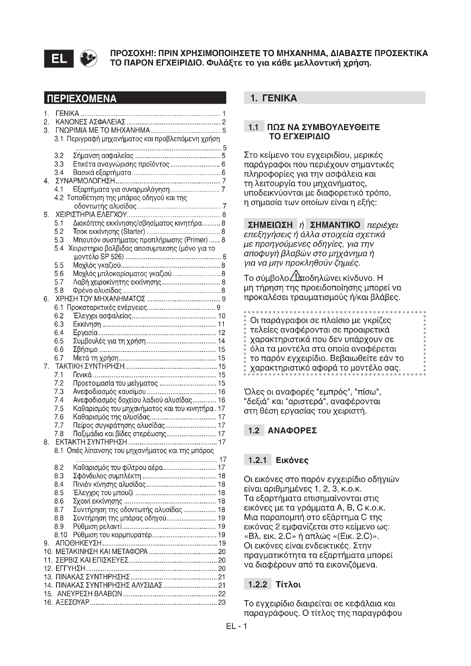 - Μη βάζετε σε λειτουργία τον κινητήρα σε κλειστούς χώρους, όπου μπορούν να συγκεντρωθούν επικίνδυνα καυσαέριαEL - 3 μονοξειδίου του άνθρακα. Η εκκίνηση του κινητήρα πρέπει να γίνεται σε ανοιχτό ή καλά αεριζόμενο χώρο. Να θυμάστε πάντα ότι τα καυσαέρια είναι δηλητηριώδη.
