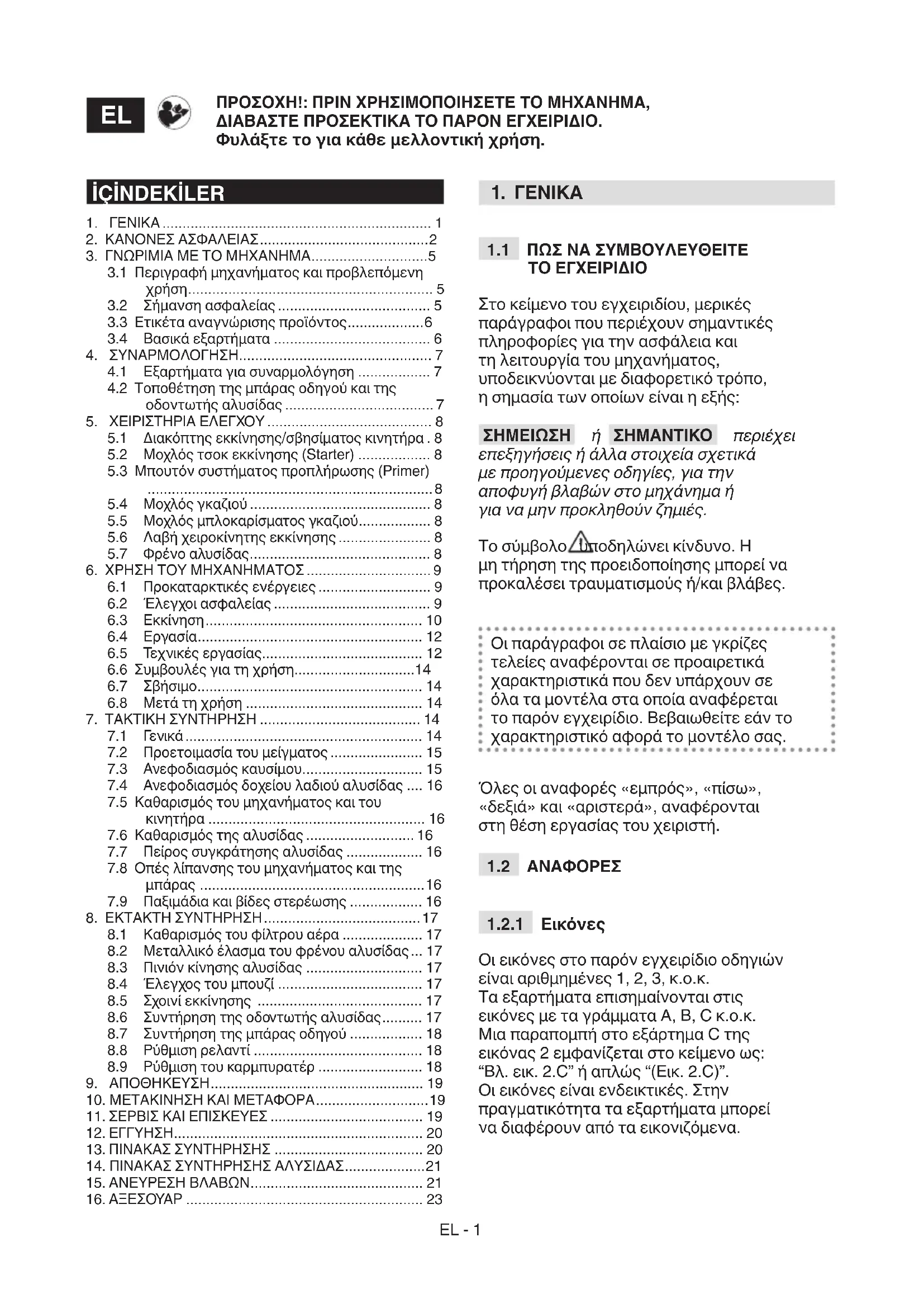 Το παρόν εγχειρίδιο παρέχει όλες τις αναγκαίες οδηγίες για το χειρισμό του μηχανήματος και για μια σωστή βασική συντήρηση που εκτελείται από το χρήστη. Όλες οι επεμβάσεις ρύθμισης και συντήρησης που δεν περιγράφονται στο παρόν εγχειρίδιο πρέπει να εκτελούνται από την Αντιπροσωπεία ή από εξειδικευμένο συνεργείο που διαθέτει τις αναγκαίες γνώσεις και τον εξοπλισμό για τη σωστή εκτέλεση των εργασιών, διατηρώντας τον αρχικό βαθμό ασφαλείας του μηχανήματος. Οι επεμβάσεις σε μη εξειδικευμένα συνεργεία και χωρίς τον κατάλληλο εξοπλισμό έχουν ως αποτέλεσμα την ακύρωση κάθεEL - 20 είδους Εγγύησης και κάθε υποχρέωσης ή ευθύνης του Κατασκευαστή.