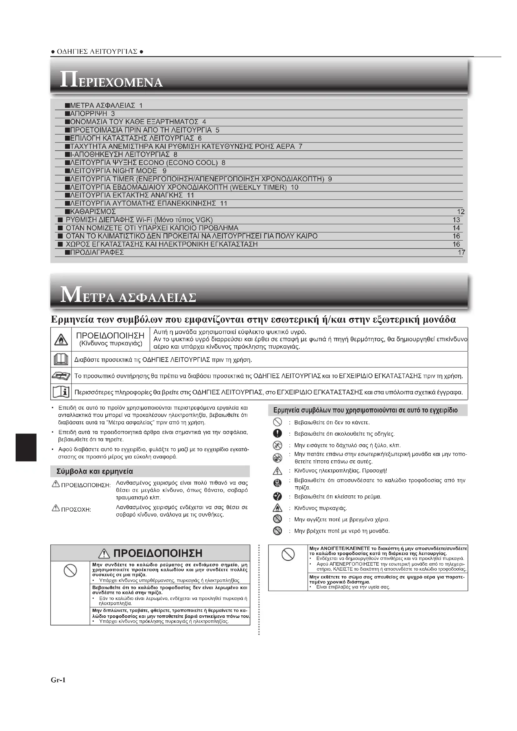 JG79Y259H03_it.indd 17 2017/10/12 15:44:14Gr-1 ● ΟΔΗΓΙΕΣ ΛΕΙΤΟΥΡΓΙΑΣ ● ΠΕΡΙΕΧΟΜΕΝΑ ■ ΜΕΤΡΑ ΑΣΦΑΛΕΙΑΣ 1 ■ ΑΠΟΡΡΙΨΗ 3 ■ ΟΝΟΜΑΣΙΑ ΤΟΥ ΚΑΘΕ ΕΞΑΡΤΗΜΑΤΟΣ 4 ■ ΠΡΟΕΤΟΙΜΑΣΙΑ ΠΡΙΝ ΑΠΟ ΤΗ ΛΕΙΤΟΥΡΓΙΑ 5 ■ ΕΠΙΛΟΓΗ ΚΑΤΑΣΤΑΣΗΣ ΛΕΙΤΟΥΡΓΙΑΣ 6 ■ ΤΑΧΥΤΗΤΑ ΑΝΕΜΙΣΤΗΡΑ ΚΑΙ ΡΥΘΜΙΣΗ ΚΑΤΕΥΘΥΝΣΗΣ ΡΟΗΣ ΑΕΡΑ 7 ■ I-ΑΠΟΘΗΚΕΥΣΗ ΛΕΙΤΟΥΡΓΙΑΣ 8 ■ ΛΕΙΤΟΥΡΓΙΑ ΨΥΞΗΣ ECONO (ECONO COOL) 8 ■ ΛΕΙΤΟΥΡΓΙΑ NIGHT MODE 9 ■ ΛΕΙΤΟΥΡΓIΑ TIMER (ΕΝΕΡΓΟΠΟΙΗΣΗ/ΑΠΕΝΕΡΓΟΠΟΙΗΣΗ ΧΡΟΝΟΔΙΑΚOΠΤΗ) 9 ■ ΛΕΙΤΟΥΡΓΙΑ ΕΒΔΟΜΑΔΙΑΙΟΥ ΧΡΟΝΟΔΙΑΚΟΠΤΗ (WEEKLY TIMER) 10 ■ ΛΕΙΤΟΥΡΓΙΑ ΕΚΤΑΚΤΗΣ ΑΝΑΓΚΗΣ 11 ■ ΛΕΙΤΟΥΡΓΙΑ ΑΥΤΟΜΑΤΗΣ ΕΠΑΝΕΚΚΙΝΗΣΗΣ 11 ■ ΚΑΘΑΡΙΣΜΟΣ 12 ■ ΡΥΘΜΙΣΗ ΔΙΕΠΑΦΗΣ Wi-Fi (Μόνο τύπος VGK) 13 ■ ΟΤΑΝ ΝΟΜΙΖΕΤΕ ΟΤΙ ΥΠΑΡΧΕΙ ΚΑΠΟΙΟ ΠΡΟΒΛΗΜΑ 14 ■ ΟΤΑΝ ΤΟ ΚΛΙΜΑΤΙΣΤΙΚΟ ΔΕΝ ΠΡΟΚΕΙΤΑΙ ΝΑ ΛΕΙΤΟΥΡΓΗΣΕΙ ΓΙΑ ΠΟΛΥ ΚΑΙΡΟ 16 ■ ΧΩΡΟΣ ΕΓΚΑΤΑΣΤΑΣΗΣ ΚΑΙ ΗΛΕΚΤΡΟΝΙΚΗ ΕΓΚΑΤΑΣΤΑΣΗ 16 ■ ΠΡΟΔΙΑΓΡΑΦΕΣ 17 ΠΡΟΕΙΔΟΠΟΙΗΣΗ Μην συνδέετε το καλώδιο ρεύματος σε ενδιάμεσο σημείο, μη χρησιμοποιείτε προέκταση καλωδίου και μην συνδέετε πολλές συσκευές σε μια πρίζα.• Υπάρχει κίνδυνος υπερθέρμανσης, πυρκαγιάς ή ηλεκτροπληξίας. Βεβαιωθείτε ότι το καλώδιο τροφοδοσίας δεν είναι λερωμένο και συνδέστε το καλά στην πρίζα.