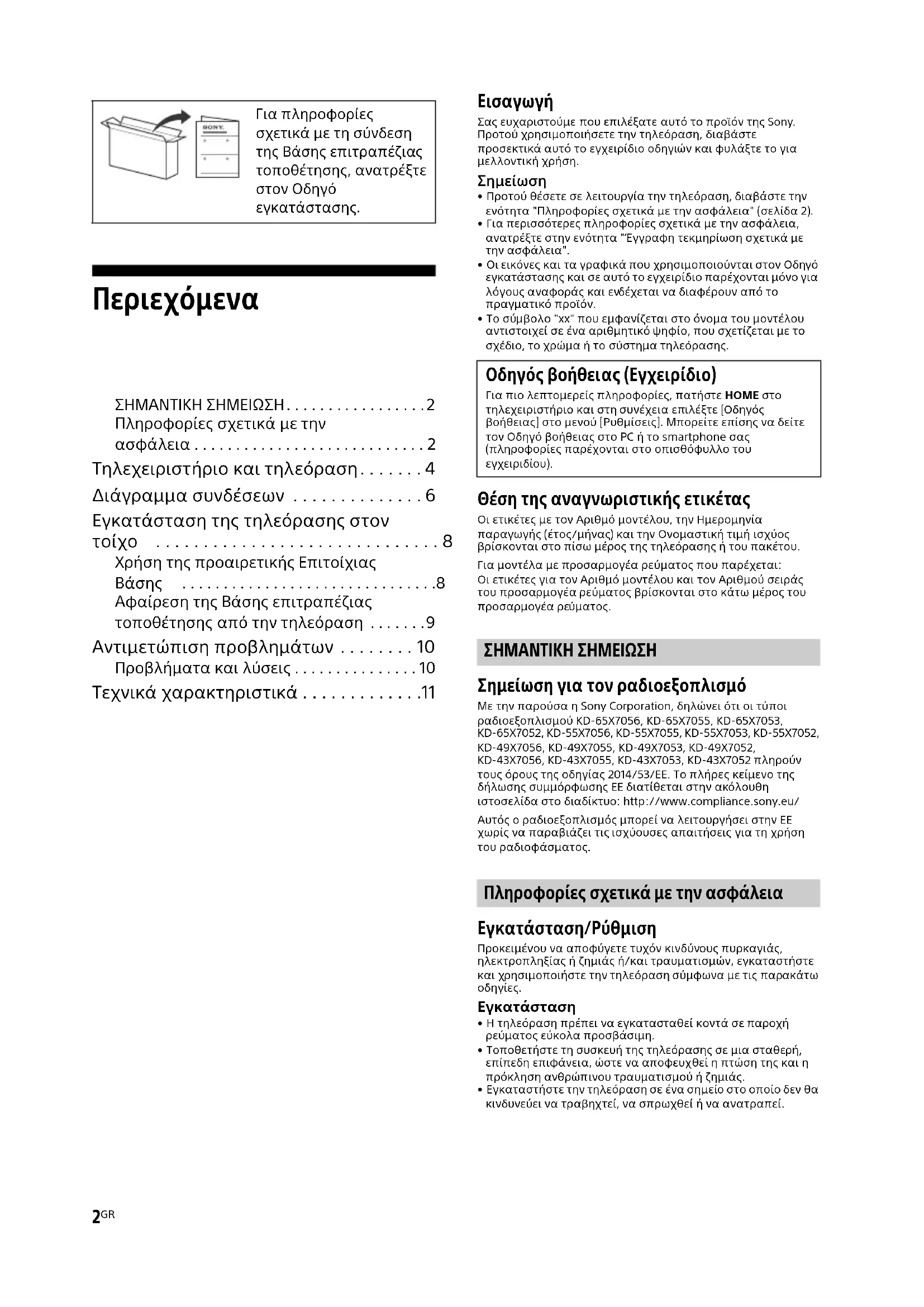 - Το σύμβολο "xx" που εμφανίζεται στο όνομα του μοντέλου αντιστοιχεί σε ένα αριθμητικό ψηφίο, που σχετίζεται με το σχέδιο, το χρώμα ή το σύστημα τηλεόρασης. Θέση της αναγνωριστικής ετικέτας Οι ετικέτες με τον Αριθμό μοντέλου, την Ημερομηνία παραγωγής (έτος/μήνας) και την Ονομαστική τιμή ισχύος βρίσκονται στο πίσω μέρος της τηλεόρασης ή του πακέτου. Για μοντέλα με προσαρμογέα ρεύματος που παρέχεται: Οι ετικέτες για τον Αριθμό μοντέλου και τον Αριθμού σειράς του προσαρμογέα ρεύματος βρίσκονται στο κάτω μέρος του προσαρμογέα ρεύματος. ΣΗΜΑΝΤΙΚΗ ΣΗΜΕΙΩΣΗ Σημείωση για τον ραδιοεξοπλισμό Με την παρούσα η Sony Corporation, δηλώνει ότι οι τύποι ραδιοεξοπλισμού KD-65X7056, KD-65X7055, KD-65X7053, KD-65X7052, KD-55X7056, KD-55X7055, KD-55X7053, KD-55X7052, KD-49X7056, KD-49X7055, KD-49X7053, KD-49X7052, KD-43X7056, KD-43X7055, KD-43X7053, KD-43X7052 πληρούν τους όρους της οδηγίας 2014/53/ΕΕ. Το πλήρες κείμενο της δήλωσης συμμόρφωσης ΕΕ διατίθεται στην ακόλουθη ιστοσελίδα στο διαδίκτυο: http://www.compliance.sony.eu/ Αυτός ο ραδιοεξοπλισμός μπορεί να λειτουργήσει στην ΕΕ χωρίς να παραβιάζει τις ισχύουσες απαιτήσεις για τη χρήση του ραδιοφάσματος. Πληροφορίες σχετικά με την ασφάλεια Εγκατάσταση/Ρύθμιση Προκειμένου να αποφύγετε τυχόν κινδύνους πυρκαγιάς, ηλεκτροπληξίας ή ζημιάς ή/και τραυματισμών, εγκαταστήστε και χρησιμοποιήστε την τηλεόραση σύμφωνα με τις παρακάτω Εγκατάσταση