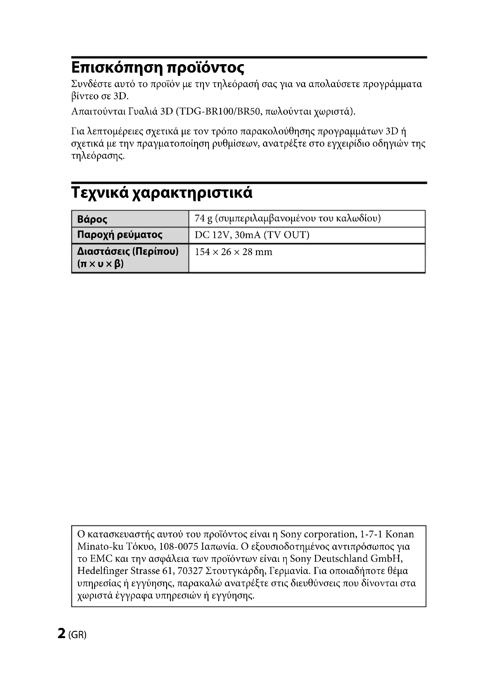 74 g (συμπεριλαμβανομένου του καλωδίου) Παροχή ρεύματος DC 12V, 30mA (TV OUT) Διαστάσεις (Περίπου) (π × υ × β) 154 × 26 × 28 mm Ο κατασκευαστής αυτού του προϊόντος είναι η Sony corporation, 1-7-1 Konan Minato-ku Τόκυο, 108-0075 Ιαπωνία. Ο εξουσιοδοτημένος αντιπρόσωπος για το EMC και την ασφάλεια των προϊόντων είναι η Sony Deutschland GmbH, Hedelfinger Strasse 61, 70327 Στουτγκάρδη, Γερμανία. Για οποιαδήποτε θέμα υπηρεσίας ή εγγύησης, παρακαλώ ανατρέξτε στις διευθύνσεις που δίνονται στα χωριστά έγγραφα υπηρεσιών ή εγγύησης.TMR-BR100 4-180-471-26(1) TMR-BR100 4-180-471-26(1) 3 (GR)
