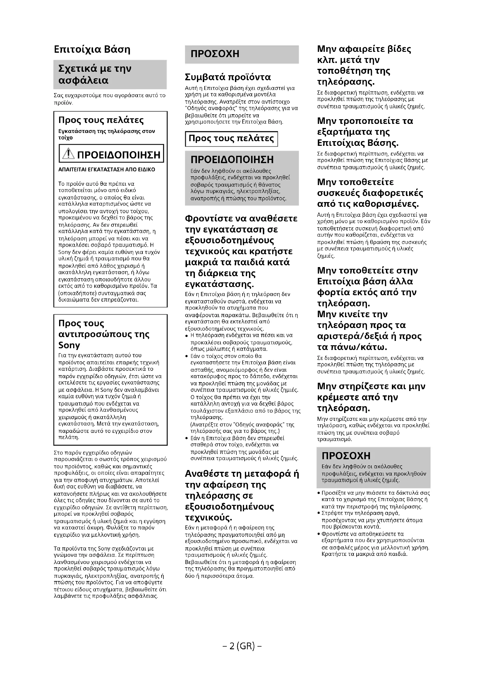 ΠΡΟΕΙΔΟΠΟΙΗΣΗ ΑΠΑΙΤΕΙΤΑΙ ΕΓΚΑΤΑΣΤΑΣΗ ΑΠΟ ΕΙΔΙΚΟ Το προϊόν αυτό θα πρέπει να τοποθετείται μόνο από ειδικό εγκατάστασης, ο οποίος θα είναι κατάλληλα καταρτισμένος ώστε να υπολογίσει την αντοχή του τοίχου, προκειμένου να δεχθεί το βάρος της τηλεόρασης. Αν δεν στερεωθεί κατάλληλα κατά την εγκατάσταση, η τηλεόραση μπορεί να πέσει και να προκαλέσει σοβαρό τραυματισμό. Η Sony δεν φέρει καμία ευθύνη για τυχόν υλική ζημιά ή τραυματισμό που θα προκληθεί από λάθος χειρισμό ή ακατάλληλη εγκατάσταση, ή λόγω εγκατάσταση οποιουδήποτε άλλου εκτός από το καθορισμένο προϊόν. Τα (οποιαδήποτε) συνταγματικά σας δικαιώματα δεν επηρεάζονται.