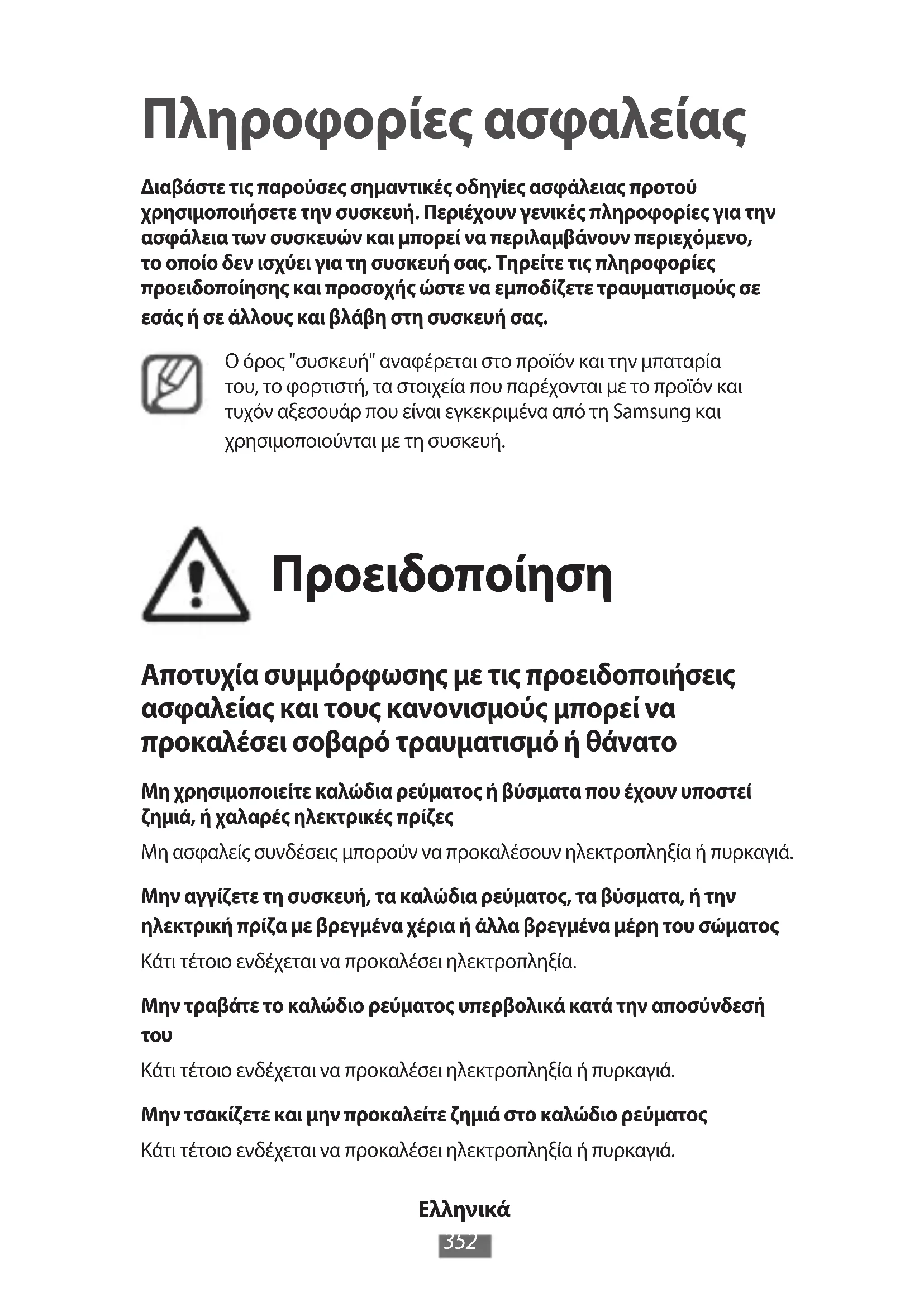Πληροφορίες ασφαλείας Διαβάστε τις παρούσες σημαντικές οδηγίες ασφάλειας προτού χρησιμοποιήσετε την συσκευή. Περιέχουν γενικές πληροφορίες για την ασφάλεια των συσκευών και μπορεί να περιλαμβάνουν περιεχόμενο, το οποίο δεν ισχύει για τη συσκευή σας. Τηρείτε τις πληροφορίες προειδοποίησης και προσοχής ώστε να εμποδίζετε τραυματισμούς σε εσάς ή σε άλλους και βλάβη στη συσκευή σας.Ο όρος "συσκευή" αναφέρεται στο προϊόν και την μπαταρία του, το φορτιστή, τα στοιχεία που παρέχονται με το προϊόν και τυχόν αξεσουάρ που είναι εγκεκριμένα από τη Samsung και χρησιμοποιούνται με τη συσκευή. Προειδοποίηση Αποτυχία συμμόρφωσης με τις προειδοποιήσεις ασφαλείας και τους κανονισμούς μπορεί να προκαλέσει σοβαρό τραυματισμό ή θάνατο Μη χρησιμοποιείτε καλώδια ρεύματος ή βύσματα που έχουν υποστεί ζημιά, ή χαλαρές ηλεκτρικές πρίζεςΜη ασφαλείς συνδέσεις μπορούν να προκαλέσουν ηλεκτροπληξία ή πυρκαγιά.Μην αγγίζετε τη συσκευή, τα καλώδια ρεύματος, τα βύσματα, ή την ηλεκτρική πρίζα με βρεγμένα χέρια ή άλλα βρεγμένα μέρη του σώματοςΚάτι τέτοιο ενδέχεται να προκαλέσει ηλεκτροπληξία.Μην τραβάτε το καλώδιο ρεύματος υπερβολικά κατά την αποσύνδεσή Κάτι τέτοιο ενδέχεται να προκαλέσει ηλεκτροπληξία ή πυρκαγιά.Μην τσακίζετε και μην προκαλείτε ζημιά στο καλώδιο ρεύματοςΚάτι τέτοιο ενδέχεται να προκαλέσει ηλεκτροπληξία ή πυρκαγιά.Ελληνικά