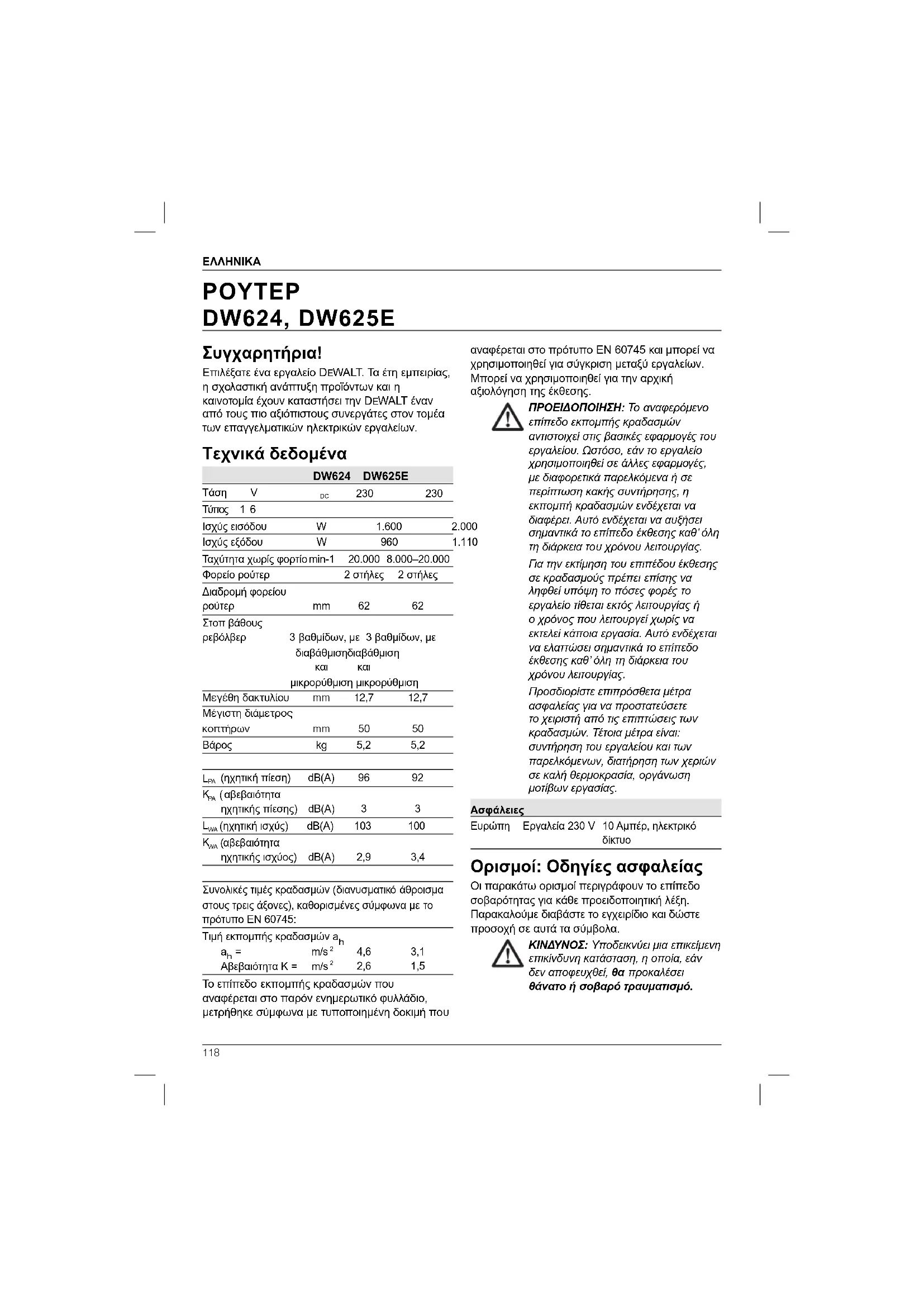 Συγχαρητήρια! Επιλέξατε ένα εργαλείο DEWALT. Τα έτη εμπειρίας, η σχολαστική ανάπτυξη προϊόντων και η καινοτομία έχουν καταστήσει την DEWALT έναν από τους πιο αξιόπιστους συνεργάτες στον τομέα των επαγγελματικών ηλεκτρικών εργαλείων. Τεχνικά δεδομένα DW624 DW625E Τάση V