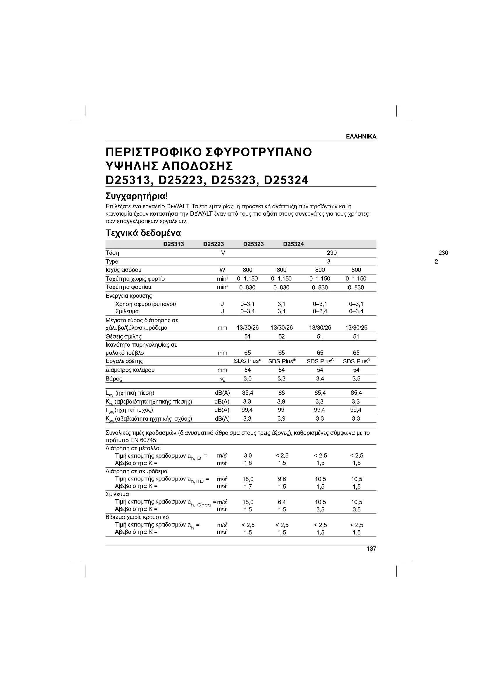 ΠΕΡΙΣΤΡΟΦΙΚΟ ΣΦΥΡΟΤΡΥΠΑΝΟ ΥΨΗΛΗΣ ΑΠΟΔΟΣΗΣ D25313, D25223, D25323, D25324 Συγχαρητήρια! Επιλέξατε ένα εργαλείο DEWALT. Τα έτη εμπειρίας, η προσεκτική ανάπτυξη των προϊόντων και η καινοτομία έχουν καταστήσει την DEWALT έναν από τους πιο αξιόπιστους συνεργάτες για τους χρήστες των επαγγελματικών εργαλείων. Τεχνικά δεδομένα D25313 D25223 D25323 D25324 Τάση V 230 230 230 230 Type 3 2 2 2 Ισχύς εισόδου W 800 800 800 800 Ταχύτητα χωρίς φορτίο min