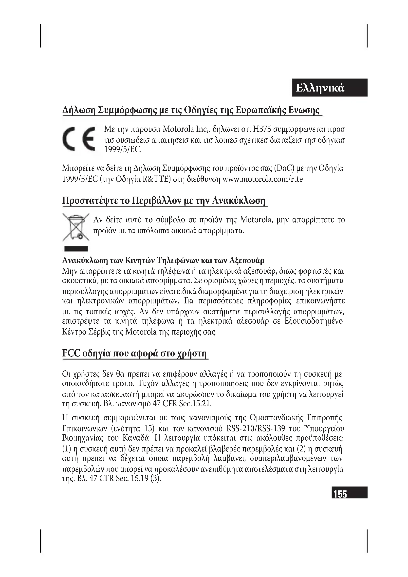 Δήλωση Συμμόρφωσης με τις Οδηγίες της Ευρωπαϊκής Ενωσης Με την παρουσα Motorola Inc,. δηλωνει οτι H375 συμμορφωνεται προσ τισ ουσιωδεισ απαιτησεισ και τισ λοιπεσ σχετικεσ διαταξεισ τησ οδηγιασ 1999/5/EC. Μπορείτε να δείτε τη Δήλωση Συμμόρφωσης του προϊόντος σας (DoC) με την Οδηγία 1999/5/ΕC (την Οδηγία R&TTE) στη διεύθυνση www.motorola.com/rtte Προστατέψτε το Περιβάλλον με την Ανακύκλωση Αν δείτε αυτό το σύμβολο σε προϊόν της Motorola, μην απορρίπτετε το προϊόν με τα υπόλοιπα οικιακά απορρίμματα. Ανακύκλωση των Κινητών Τηλεφώνων και των Αξεσουάρ Μην απορρίπτετε τα κινητά τηλέφωνα ή τα ηλεκτρικά αξεσουάρ, όπως φορτιστές και ακουστικά, με τα οικιακά απορρίμματα. Σε ορισμένες χώρες ή περιοχές, τα συστήματα περισυλλογής απορριμμάτων είναι ειδικά διαμορφωμένα για τη διαχείριση ηλεκτρικών και ηλεκτρονικών απορριμμάτων. Για περισσότερες πληροφορίες επικοινωνήστε με τις τοπικές αρχές. Αν δεν υπάρχουν συστήματα περισυλλογής απορριμμάτων, επιστρέψτε τα κινητά τηλέφωνα ή τα ηλεκτρικά αξεσουάρ σε Εξουσιοδοτημένο Κέντρο Σέρβις της Motorola της περιοχής σας. FCC οδηγία που αφορά στο χρήστη Οι χρήστες δεν θα πρέπει να επιφέρουν αλλαγές ή να τροποποιούν τη συσκευή με οποιονδήποτε τρόπο. Τυχόν αλλαγές η τροποποιήσεις που δεν εγκρίνονται ρητώς από τον κατασκευαστή μπορεί να ακυρώσουν το δικαίωμα του χρήστη να λειτουργεί τη συσκευή. Βλ. κανονισμό 47 CFR Sec.15.21. Η συσκευή συμμορφώνεται με τους κανονισμούς της Ομοσπονδιακής Επιτροπής Επικοινωνιών (ενότητα 15) και τον κανονισμό RSS-210/RSS-139 του Υπουργείου Βιομηχανίας του Καναδά. Η λειτουργία υπόκειται στις ακόλουθες προϋποθέσεις: (1) η συσκευή αυτή δεν πρέπει να προκαλεί βλαβερές παρεμβολές και (2) η συσκευή αυτή πρέπει να δέχεται όποια παρεμβολή λαμβάνει, συμπεριλαμβανομένων των παρεμβολών που μπορεί να προκαλέσουν ανεπιθύμητα αποτελέσματα στη λειτουργία της. Βλ. 47 CFR Sec. 15.19 (3).Ελληνικά