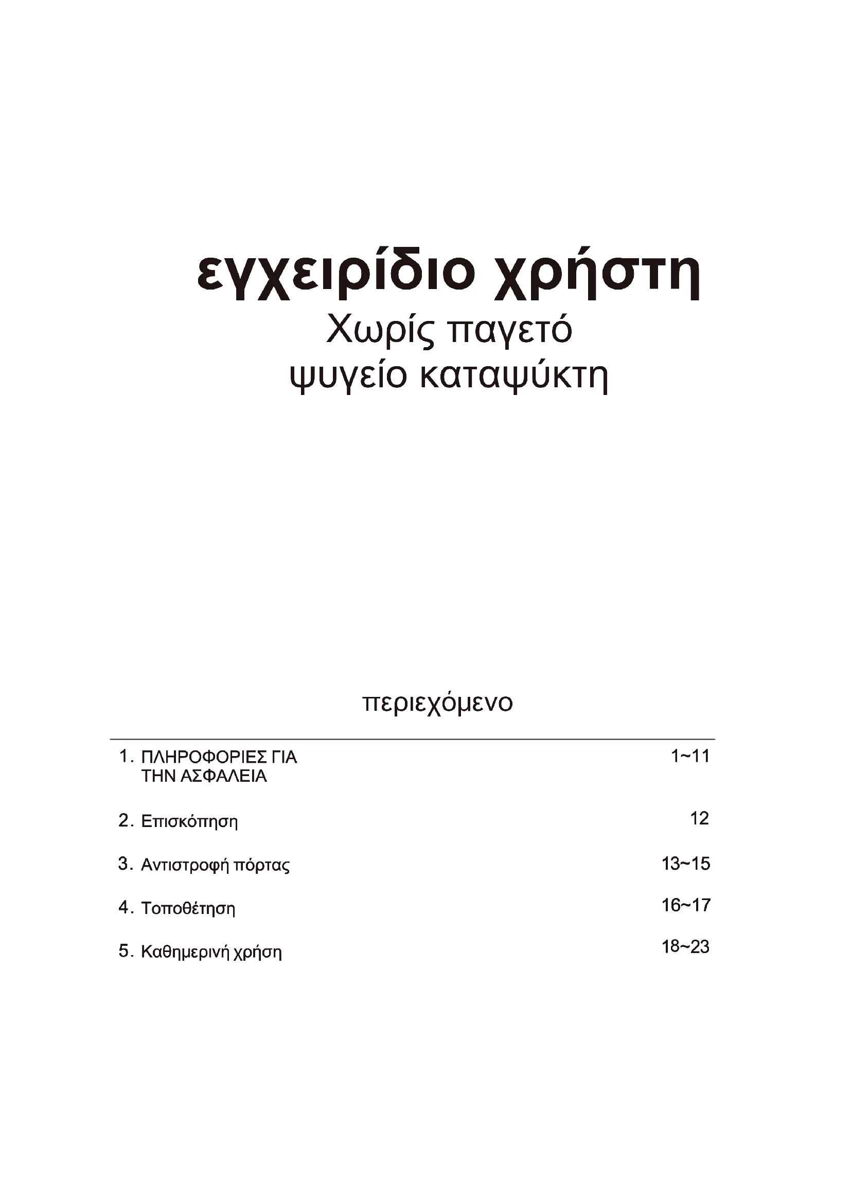 ~23 εγχειρίδιο χρήστη Χωρίς παγετό ψυγείο καταψύκτηΣας ευχαριστούμε για την αγορά αυτού του προϊόντος. Πριν χρησιμοποιήσετε το ψυγείο σας, σας παρακαλούμε να διαβάσετε προσεκτικά αυτό το εγχειρίδιο οδηγιών χρήσης έτσι ώστε να μεγιστοποιήσετε την απόδοση του. Φυλάξτε όλα τα έγγραφα για μελλοντική χρήση ή για άλλους ιδιοκτήτες. Αυτό το προϊόν προορίζεται αποκλειστικά για οικιακή χρήση ή παρόμοιες εφαρμογές όπως: - την περιοχή της κουζίνας για προσωπικό καταστημάτων, γραφείων και άλλα περιβάλλοντα εργασίας - σε φάρμες, από πελάτες σε ξενοδοχεία, πανδοχεία και άλλα περιβάλλοντα οικιακού