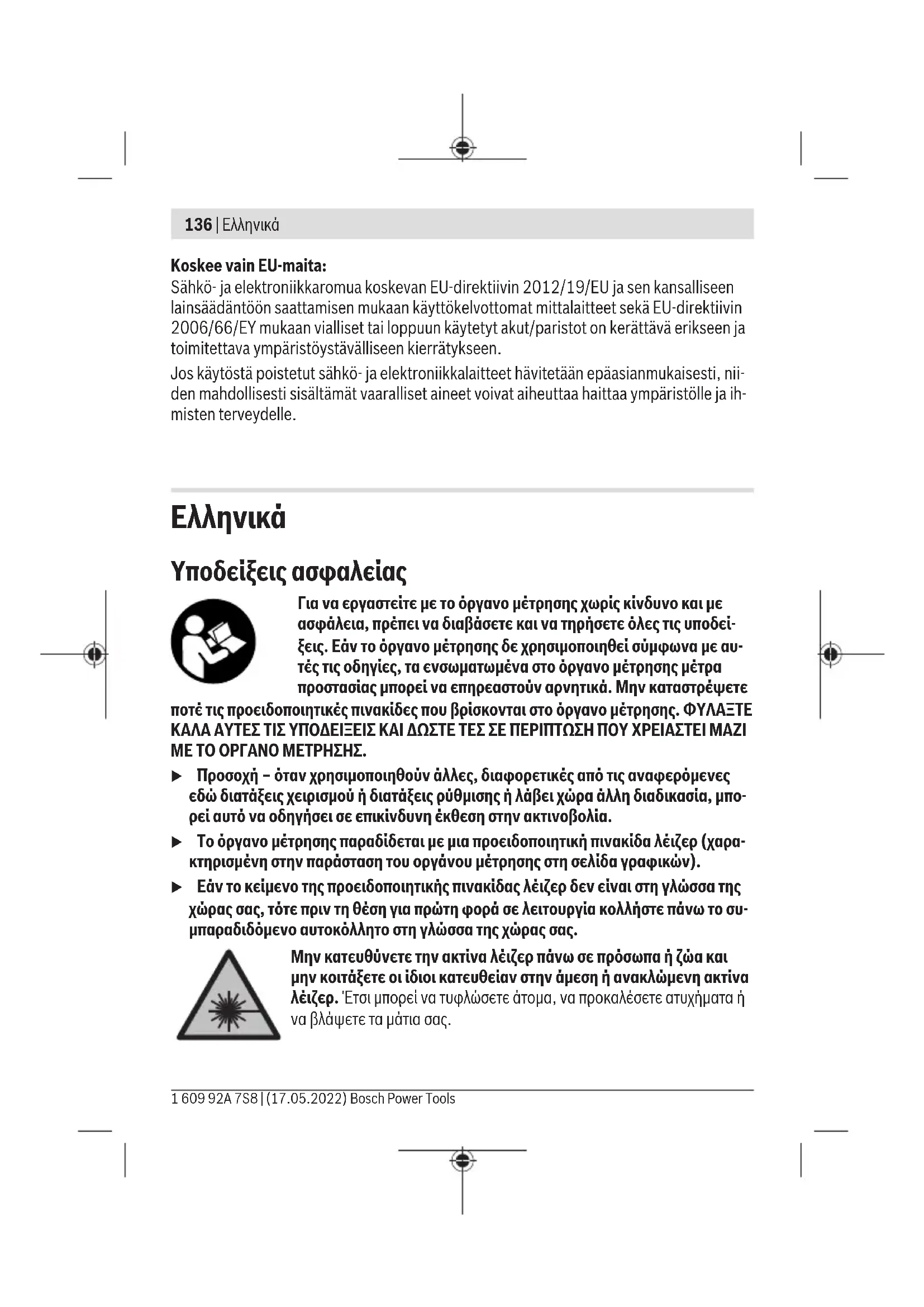 Υποδείξεις ασφαλείας Για να εργαστείτε με το όργανο μέτρησης χωρίς κίνδυνο και με ασφάλεια, πρέπει να διαβάσετε και να τηρήσετε όλες τις υποδεί- ξεις. Εάν το όργανο μέτρησης δε χρησιμοποιηθεί σύμφωνα με αυ- τές τις οδηγίες, τα ενσωματωμένα στο όργανο μέτρησης μέτρα προστασίας μπορεί να επηρεαστούν αρνητικά. Μην καταστρέψετε ποτέ τις προειδοποιητικές πινακίδες που βρίσκονται στο όργανο μέτρησης. ΦΥΛΑΞΤΕ ΚΑΛΑ ΑΥΤΕΣ ΤΙΣ ΥΠΟΔΕΙΞΕΙΣ ΚΑΙ ΔΩΣΤΕ ΤΕΣ ΣΕ ΠΕΡΙΠΤΩΣΗ ΠΟΥ ΧΡΕΙΑΣΤΕΙ ΜΑΖΙ ΜΕ ΤΟ ΟΡΓΑΝΟ ΜΕΤΡΗΣΗΣ. u Προσοχή – όταν χρησιμοποιηθούν άλλες, διαφορετικές από τις αναφερόμενες εδώ διατάξεις χειρισμού ή διατάξεις ρύθμισης ή λάβει χώρα άλλη διαδικασία, μπο- ρεί αυτό να οδηγήσει σε επικίνδυνη έκθεση στην ακτινοβολία. u Το όργανο μέτρησης παραδίδεται με μια προειδοποιητική πινακίδα λέιζερ (χαρα- κτηρισμένη στην παράσταση του οργάνου μέτρησης στη σελίδα γραφικών). u Εάν το κείμενο της προειδοποιητικής πινακίδας λέιζερ δεν είναι στη γλώσσα της χώρας σας, τότε πριν τη θέση για πρώτη φορά σε λειτουργία κολλήστε πάνω το συ- μπαραδιδόμενο αυτοκόλλητο στη γλώσσα της χώρας σας. Μην κατευθύνετε την ακτίνα λέιζερ πάνω σε πρόσωπα ή ζώα και μην κοιτάξετε οι ίδιοι κατευθείαν στην άμεση ή ανακλώμενη ακτίνα λέιζερ. Έτσι μπορεί να τυφλώσετε άτομα, να προκαλέσετε ατυχήματα ή να βλάψετε τα μάτια σας. 1 609 92A 7S8 | (17.05.2022) Bosch Power ToolsΕλληνικά | 137 u Σε περίπτωση που η ακτίνα λέιζερ πέσει στα μάτια σας, πρέπει να κλείσετε τα μάτια συνειδητά και να απομακρύνετε το κεφάλι σας αμέσως από την ακτίνα. u Μην προβείτε σε καμία αλλαγή στη διάταξη λέιζερ. u Μη χρησιμοποιείτε τα γυαλιά λέιζερ (εξάρτημα) ως προστατευτικά γυαλιά. Τα γυα- λιά λέιζερ χρησιμεύουν για την καλύτερη αναγνώριση της ακτίνας λέιζερ, αλλά όμως δεν προστατεύουν από την ακτίνα λέιζερ. u Μη χρησιμοποιείτε τα γυαλιά λέιζερ (εξάρτημα) ως γυαλιά ηλίου ή στην οδική κυ- κλοφορία. Τα γυαλιά λέιζερ δεν προσφέρουν πλήρη προστασία από την υπεριώδη ακτι- νοβολία και μειώνουν την αντίληψη των χρωμάτων. u Αναθέστε την επισκευή του οργάνου μέτρησης μόνο σε ειδικευμένο τεχνικό προ- σωπικό και μόνο με γνήσια ανταλλακτικά. Μ’ αυτόν τον τρόπο εξασφαλίζεται η διατή- ρηση της ασφαλούς λειτουργίας του εργαλείου μέτρησης. u Μην αφήσετε παιδιά χωρίς επιτήρηση να χρησιμοποιήσουν το όργανο μέτρησης λέιζερ. Θα μπορούσαν ακούσια να τυφλώσουν άλλα άτομα ή να τυφλωθούν τα ίδια. u Μην εργάζεστε με το όργανο μέτρησης σε επικίνδυνο για έκρηξη περιβάλλον, στο οποίο βρίσκονται εύφλεκτα υγρά, αέρια ή εύφλεκτες σκόνες. Στο εσωτερικό του ερ- γαλείου μέτρησης μπορεί να δημιουργηθεί σπινθηρισμός κι έτσι να αναφλεχθούν η σκόνη ή οι αναθυμιάσεις. Μη φέρετε τον μαγνήτη κοντά σε εμφυτεύματα ή άλλες ιατρικές συσκευές, όπως π.χ. βηματοδότης καρδιάς ή αντλία ινσουλίνης. Από τον μαγνήτηδημιουργείται ένα πεδίο, το οποίο μπορεί να θέσει σε κίνδυνο τη λειτουργία των εμφυτευμάτων ή των ιατρικών συσκευών. u Κρατήστε το όργανο μέτρησης μακριά από μαγνητικούς φορείς δεδομένων και μα- γνητικές ευαίσθητες συσκευές. Η επίδραση των μαγνητών μπορεί οδηγήσει σε οριστι- κή απώλεια των δεδομένων. Περιγραφή προϊόντος και ισχύος Προσέξτε παρακαλώ τις εικόνες στο μπροστινό μέρος των οδηγιών λειτουργίας. Χρήση σύμφωνα με τον προορισμό Το όργανο μέτρησης προορίζεται για τον προσδιορισμό και τον έλεγχο οριζόντιων ευθυ- γραμμίσεων καθώς και σημείων κατακορύφου. Το εργαλείο μέ
