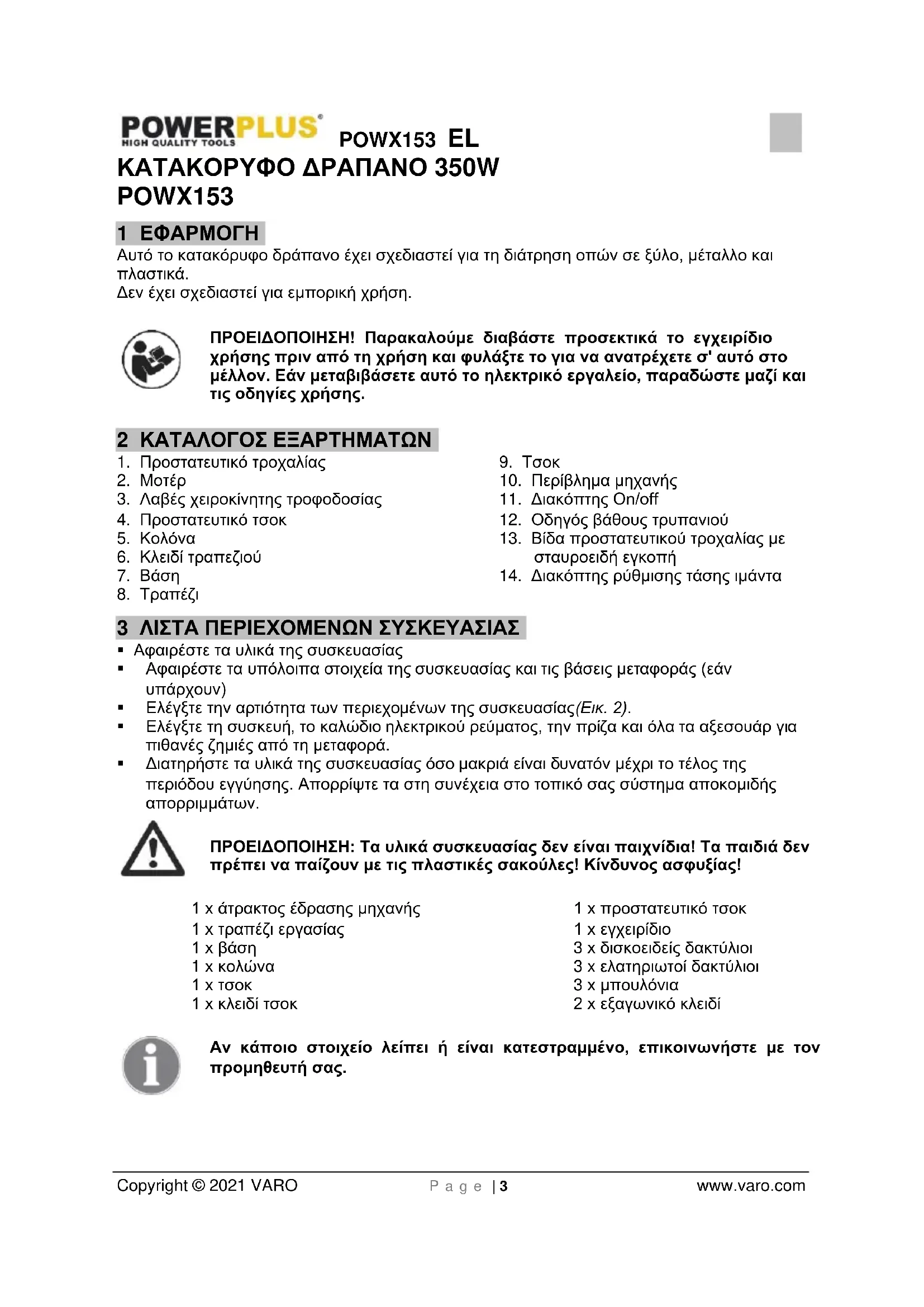 - Διατηρήστε τα υλικά της συσκευασίας όσο μακριά είναι δυνατόν μέχρι το τέλος της περιόδου εγγύησης. Απορρίψτε τα στη συνέχεια στο τοπικό σας σύστημα αποκομιδής απορριμμάτων. ΠΡΟΕΙΔΟΠΟΙΗΣΗ: Τα υλικά συσκευασίας δεν είναι παιχνίδια! Τα παιδιά δεν πρέπει να παίζουν με τις πλαστικές σακούλες! Κίνδυνος ασφυξίας! 1 x άτρακτος έδρασης μηχανής 1 x τραπέζι εργασίας 1 x βάση 1 x κολώνα 1 x τσοκ 1 x κλειδί τσοκ 1 x προστατευτικό τσοκ 1 x εγχειρίδιο 3 x δισκοειδείς δακτύλιοι 3 x ελατηριωτοί δακτύλιοι 3 x μπουλόνια 2 x εξαγωνικό κλειδί Αν κάποιο στοιχείο λείπει ή είναι κατεστραμμένο, επικοινωνήστε με τον προμηθευτή σας.POWX153 EL Copyright © 2021 VARO P a g e | 4 www.varo.com 4 ΣΥΜΒΟΛΑ Τα σύμβολα που ακολουθούν χρησιμοποιούνται μέσα στο παρόν εγχειρίδιο