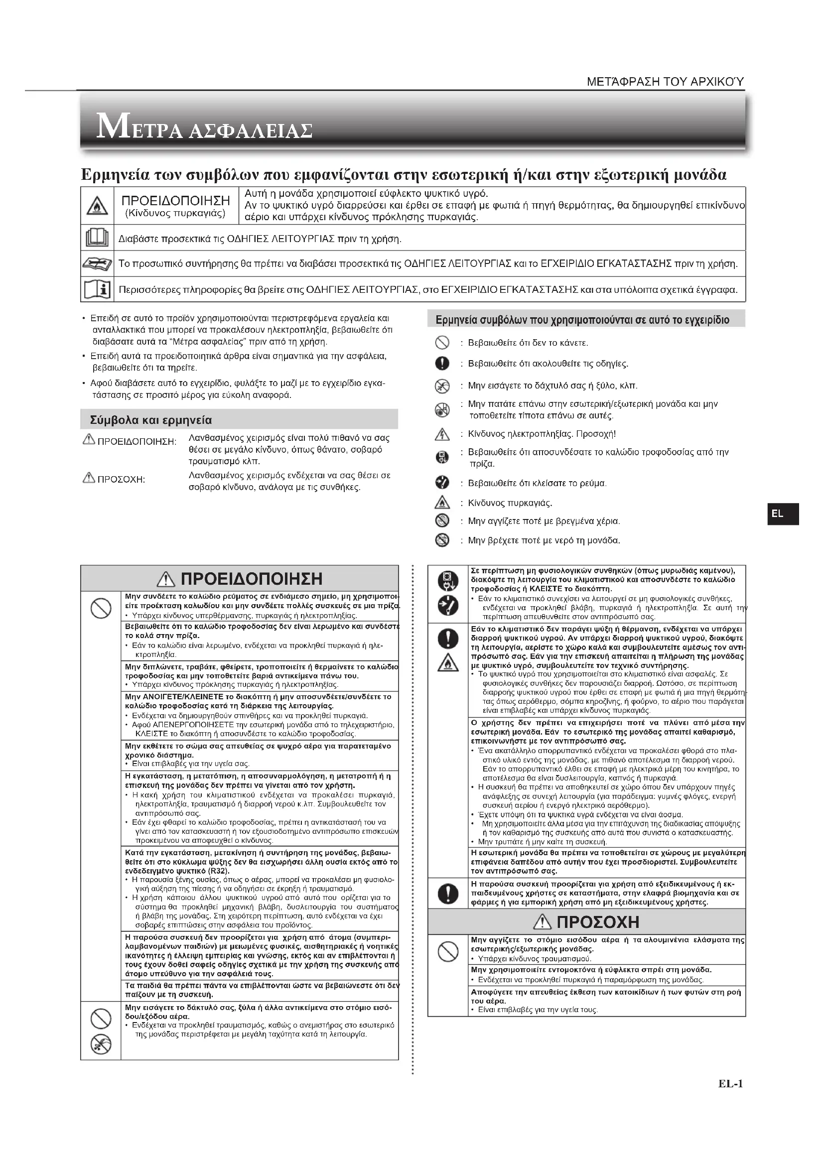 - Μη χρησιμοποιείτε άλλα μέσα για την επιτάχυνση της διαδικασίας απόψυξης ή τον καθαρισμό της συσκευής από αυτά που συνιστά ο κατασκευαστής. • Μην τρυπάτε ή μην καίτε τη συσκευή.Η εσωτερική μονάδα θα πρέπει να τοποθετείται σε χώρους με μεγαλύτερη επιφάνεια δαπέδου από αυτήν που έχει προσδιοριστεί. Συμβουλευτείτε τον αντιπρόσωπό σας.Η παρούσα συσκευή προορίζεται για χρήση από εξειδικευμένους ή εκ-παιδευμένους χρήστες σε καταστήματα, στην ελαφρά βιομηχανία και σε φάρμες ή για εμπορική χρήση από μη εξειδικευμένους χρήστες. Μην αγγίζετε το στόμιο εισόδου αέρα ή τα αλουμινένια ελάσματα της εσωτερικής/εξωτερικής μονάδας.• Υπάρχει κίνδυνος τραυματισμού.Μην χρησιμοποιείτε εντομοκτόνα ή εύφλεκτα σπρέι στη μονάδα.• Ενδέχεται να προκληθεί πυρκαγιά ή παραμόρφωση της μονάδας.Αποφύγετε την απευθείας έκθεση των κατοικίδιων ή των φυτών στη ροή του αέρα.• Είναι επιβλαβές για την υγεία τους. Ερμηνεία των συμβόλων που εμφανίζονται στην εσωτερική ή/και στην εξωτερική μονάδα ΠΡΟΕΙΔΟΠΟΙΗΣΗ (Κίνδυνος πυρκαγιάς)Αυτή η μονάδα χρησιμοποιεί εύφλεκτο ψυκτικό υγρό.Αν το ψυκτικό υγρό διαρρεύσει και έρθει σε επαφή με φωτιά ή πηγή θερμότητας, θα δημιουργηθεί επικίνδυνο αέριο και υπάρχει κίνδυνος πρόκλησης πυρκαγιάς.Διαβάστε προσεκτικά τις ΟΔΗΓΙΕΣ ΛΕΙΤΟΥΡΓΙΑΣ πριν τη χρήση. Το προσωπικό συντήρησης θα πρέπει να διαβάσει προσεκτικά τις ΟΔΗΓΙΕΣ ΛΕΙΤΟΥΡΓΙΑΣ και το ΕΓΧΕΙΡΙΔΙΟ ΕΓΚΑΤΑΣΤΑΣΗΣ πριν τη χρήση. Περισσότερες πληροφορίες θα βρείτε στις ΟΔΗΓΙΕΣ ΛΕΙΤΟΥΡΓΙΑΣ, στο ΕΓΧΕΙΡΙΔΙΟ ΕΓΚΑΤΑΣΤΑΣΗΣ και στα υπόλοιπα σχετικά έγγραφα. JG79Y566L01_07El.indd 1 2018-12-27 10:08:07EL-2 Για να χρησιμοποιήσετε αυτή τη μονάδα σωστά και με ασφάλεια, βεβαιωθείτε ότι έχετε διαβάσει αυτό το εγχειρίδιο οδηγιών πριν από τη χρήση.