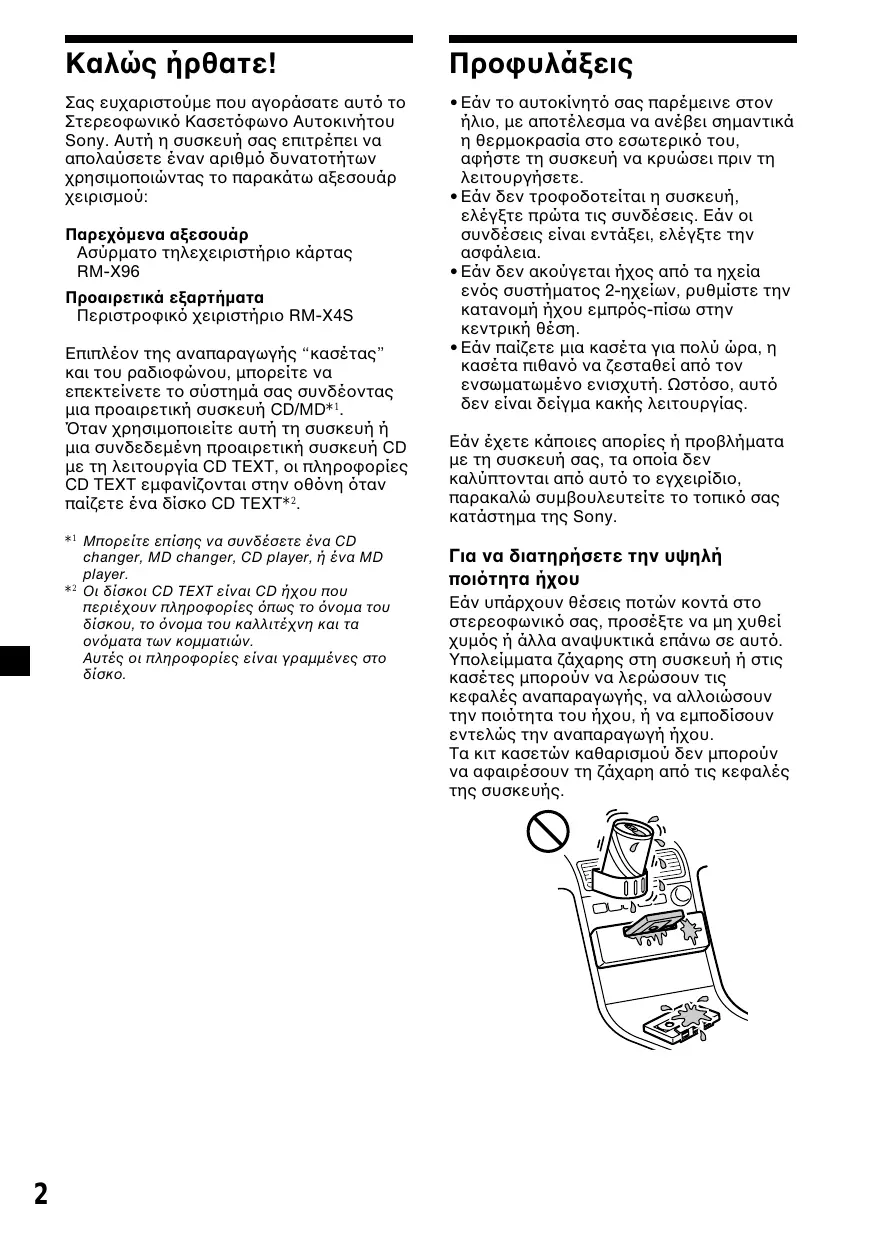 Καλώς ήρθατε! Προφυλάξεις Σας ευχαριστούµε που αγοράσατε αυτ το Στερεοφωνικ Κασετφωνο Αυτοκινήτου Sony. Αυτή η συσκευή σας επιτρέπει να απολαύσετε έναν αριθµ δυνατοτήτων χρησιµοποιώντας το παρακάτω αξεσουάρ