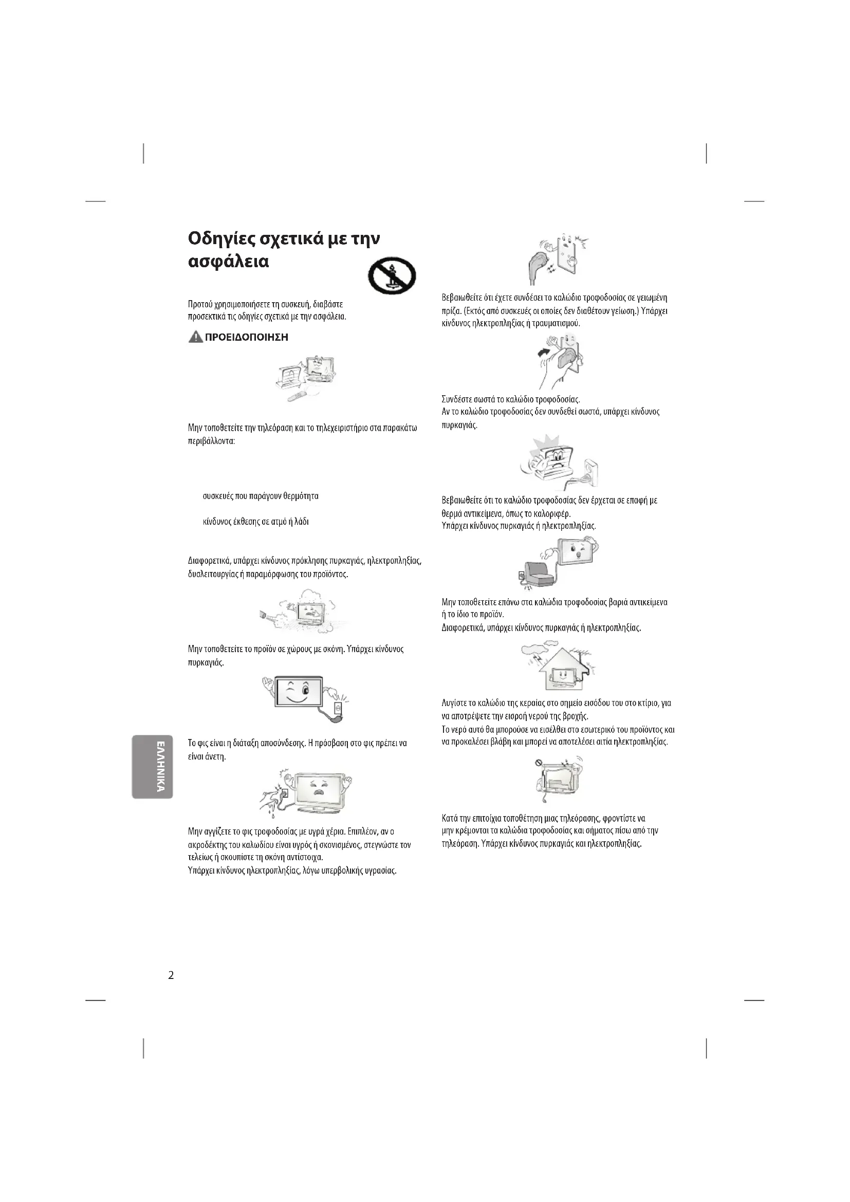 Προτού χρησιμοποιήσετε τη συσκευή, διαβάστε προσεκτικά τις οδηγίες σχετικά με την ασφάλεια. ΠΡΟΕΙΔΟΠΟΙΗΣΗ Μην τοποθετείτε την τηλεόραση και το τηλεχειριστήριο στα παρακάτω περιβάλλοντα: tΣε θέση εκτεθειμένη σε άμεσο ηλιακό φως tΣε περιοχή με υψηλή υγρασία, όπως στο μπάνιο tΚοντά σε οποιαδήποτε πηγή θερμότητας, όπως θερμάστρες ή άλλες συσκευές που παράγουν θερμότητα tΚοντά σε πάγκους κουζίνας ή υγροποιητές, όπου υπάρχει ο κίνδυνος έκθεσης σε ατμό ή λάδι tΣε περιοχή εκτεθειμένη στη βροχή ή στον άνεμο tΚοντά σε δοχεία νερού, όπως βάζα Διαφορετικά, υπάρχει κίνδυνος πρόκλησης πυρκαγιάς, ηλεκτροπληξίας, δυσλειτουργίας ή παραμόρφωσης του προϊόντος. Μην τοποθετείτε το προϊόν σε χώρους με σκόνη. Υπάρχει κίνδυνος