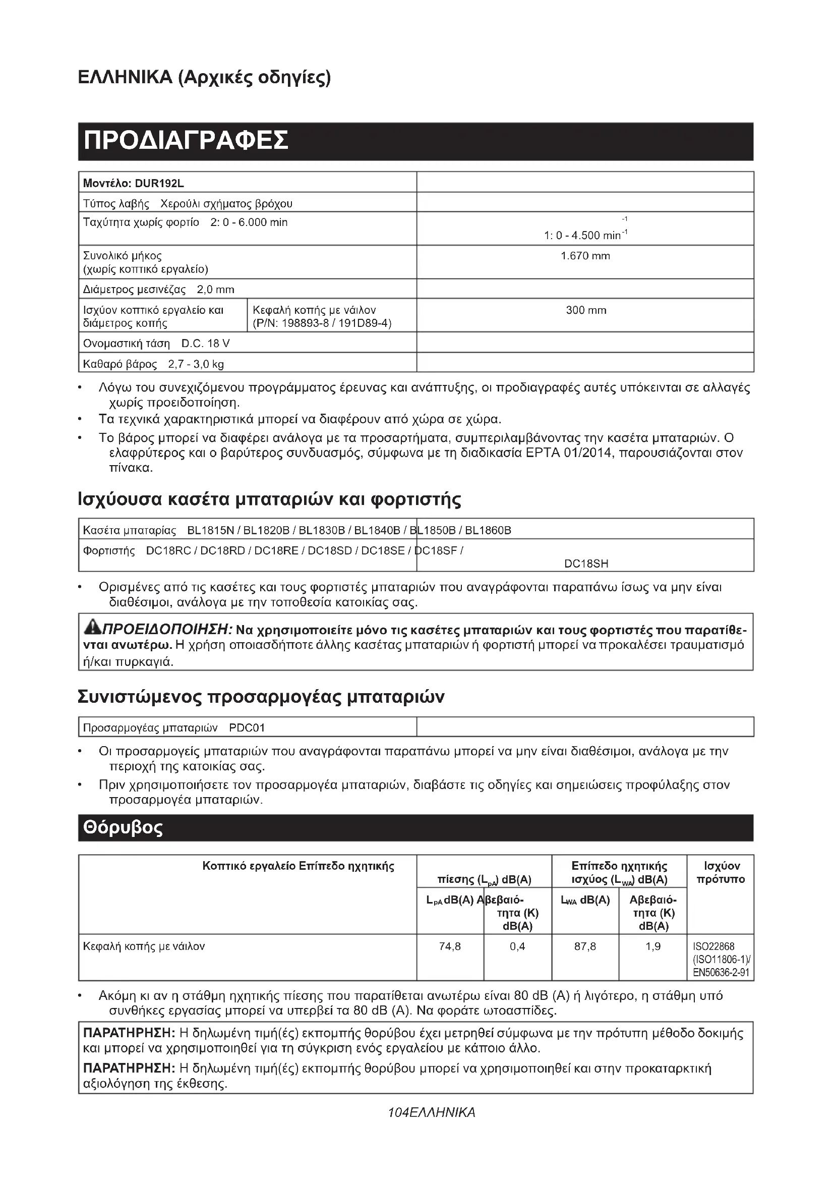 - Ακόμηκιανηστάθμηηχητικήςπίεσηςπουπαρατίθεταιανωτέρωείναι80dB(A)ήλιγότερο,ηστάθμηυπό συνθήκεςεργασίαςμπορείναυπερβείτα80dB(A).Ναφοράτεωτοασπίδες. ΠΑΡΑΤΗΡΗΣΗ:Ηδηλωμένητιμή(ές)εκπομπήςθορύβουέχειμετρηθείσύμφωναμετηνπρότυπημέθοδοδοκιμής καιμπορείναχρησιμοποιηθείγιατησύγκρισηενόςεργαλείουμεκάποιοάλλο. ΠΑΡΑΤΗΡΗΣΗ:Ηδηλωμένητιμή(ές)εκπομπήςθορύβουμπορείναχρησιμοποιηθείκαιστηνπροκαταρκτική αξιολόγησητηςέκθεσης.105 ΕΛΛΗΝΙΚΑ ΠΡΟΕΙΔΟΠΟΙΗΣΗ: Να φοράτε ωτοασπίδες. ΠΡΟΕΙΔΟΠΟΙΗΣΗ: Η εκπομπή θορύβου κατά τη χρήση του ηλεκτρικού εργαλείου σε πραγματικές συνθήκες μπορεί να διαφέρει από τη δηλωμένη τιμή(ές) ανάλογα με τους τρόπους χρήσης του εργαλείου, ιδιαίτερα το είδος του τεμαχίου εργασίας που υπόκειται επεξεργασία. ΠΡΟΕΙΔΟΠΟΙΗΣΗ: Φροντίστε να λάβετε τα κατάλληλα μέτρα προστασίας του χειριστή βάσει ενός υπολογισμού της έκθεσης σε πραγματικές συνθήκες χρήσης (λαμβάνοντας υπόψη όλες τις συνιστώσες του κύκλου λειτουργίας όπως τους χρό- νους που το εργαλείο είναι εκτός λειτουργίας και όταν βρίσκεται σε αδρανή λειτουργία πέραν του χρόνου ενεργοποίησης).