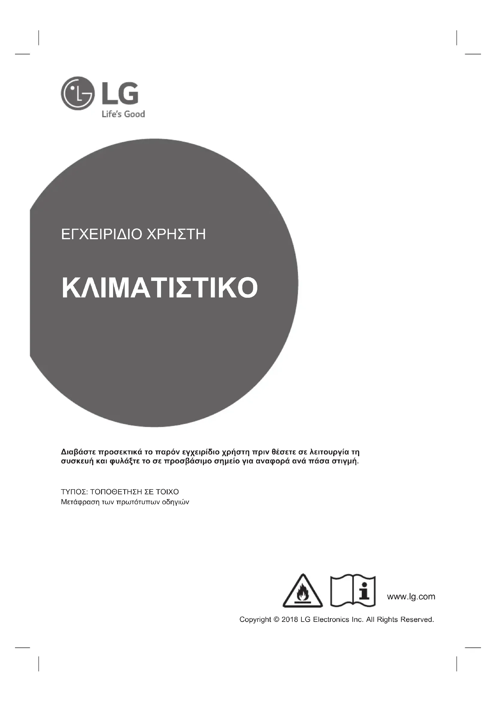 - Certaines fonctions peuvent ne pas être prises en charge en fonction du modèle.www.lg.com ΕΓΧΕΙΡΙΔΙΟ ΧΡΗΣΤΗ ΚΛΙΜΑΤΙΣΤΙΚΟ Διαβάστε προσεκτικά το παρόν εγχειρίδιο χρήστη πριν θέσετε σε λειτουργία τη συσκευή και φυλάξτε το σε προσβάσιμο σημείο για αναφορά ανά πάσα στιγμή. ΤΥΠΟΣ: ΤΟΠΟΘΕΤΗΣΗ ΣΕ ΤΟΙΧΟ Μετάφραση των πρωτότυπων οδηγιών Copyright © 2018 LG Electronics Inc. All Rights Reserved.ΠΙΝΑΚΑΣ ΠΕΡΙΕΧΟΜΕΝΩΝ Το εγχειρίδιο αυτό μπορεί να περιέχει εικόνες ή περιεχόμενο διαφορετικό από το μοντέλο που αγοράσατε. Το εγχειρίδιο υπόκειται σε αναθεώρηση από τον κατασκευαστή. ΟΔΗΓΙΕΣ ΑΣΦΑΛΕΙΑΣ ................................................................3 ΣΗΜΑΝΤΙΚΕΣ ΟΔΗΓΙΕΣ ΑΣΦΑΛΕΙΑΣ............................................................ 4 ΛΕΙΤΟΥΡΓΙΑ ...............................................................................11 Σημειώσεις για λειτουργία ............................................................................. 11 Εξαρτήματα και λειτουργίες