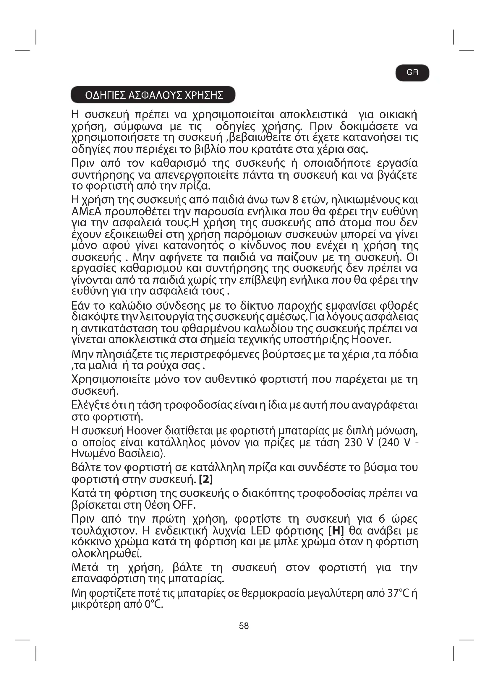 FI58 ΟΔΗΓΙΕΣ ΑΣΦΑΛΟΥΣ ΧΡΗΣΗΣ H συσκευή πρέπει να χρησιμοποιείται αποκλειστικά για οικιακή χρήση, σύμφωνα με τις οδηγίες χρήσης. Πριν δοκιμάσετε να χρησιμοποιήσετε τη συσκευή ,βεβαιωθείτε ότι έχετε κατανοήσει τις οδηγίες που περιέχει το βιβλίο που κρατάτε στα χέρια σας. Πριν από τον καθαρισμό της συσκευής ή οποιαδήποτε εργασία συντήρησης να απενεργοποιείτε πάντα τη συσκευή και να βγάζετε το φορτιστή από την πρίζα. Η χρήση της συσκευής από παιδιά άνω των 8 ετών, ηλικιωμένους και ΑΜεΑ προυποθέτει την παρουσία ενήλικα που θα φέρει την ευθύνη για την ασφαλειά τους.Η χρήση της συσκευής από άτομα που δεν έχουν εξοικειωθεί στη χρήση παρόμοιων συσκευών μπορεί να γίνει μόνο αφού γίνει κατανοητός ο κίνδυνος που ενέχει η χρήση της συσκευής . Μην αφήνετε τα παιδιά να παίζουν με τη συσκευή. Οι εργασίες καθαρισμού και συντήρησης της συσκευής δεν πρέπει να γίνονται από τα παιδιά χωρίς την επίβλεψη ενήλικα που θα φέρει την ευθύνη για την ασφαλειά τους . Εάν το καλώδιο σύνδεσης με το δίκτυο παροχής εμφανίσει φθορές διακόψτε την λειτουργία της συσκευής αμέσως. Για λόγους ασφάλειας η αντικατάσταση του φθαρμένου καλωδίου της συσκευής πρέπει να γίνεται αποκλειστικά στα σημεία τεχνικής υποστήριξης Hoover. Μην πλησιάζετε τις περιστρεφόμενες βούρτσες με τα χέρια ,τα πόδια ,τα μαλιά ή τα ρούχα σας . Χρησιμοποιείτε μόνο τον αυθεντικό φορτιστή που παρέχεται με τη