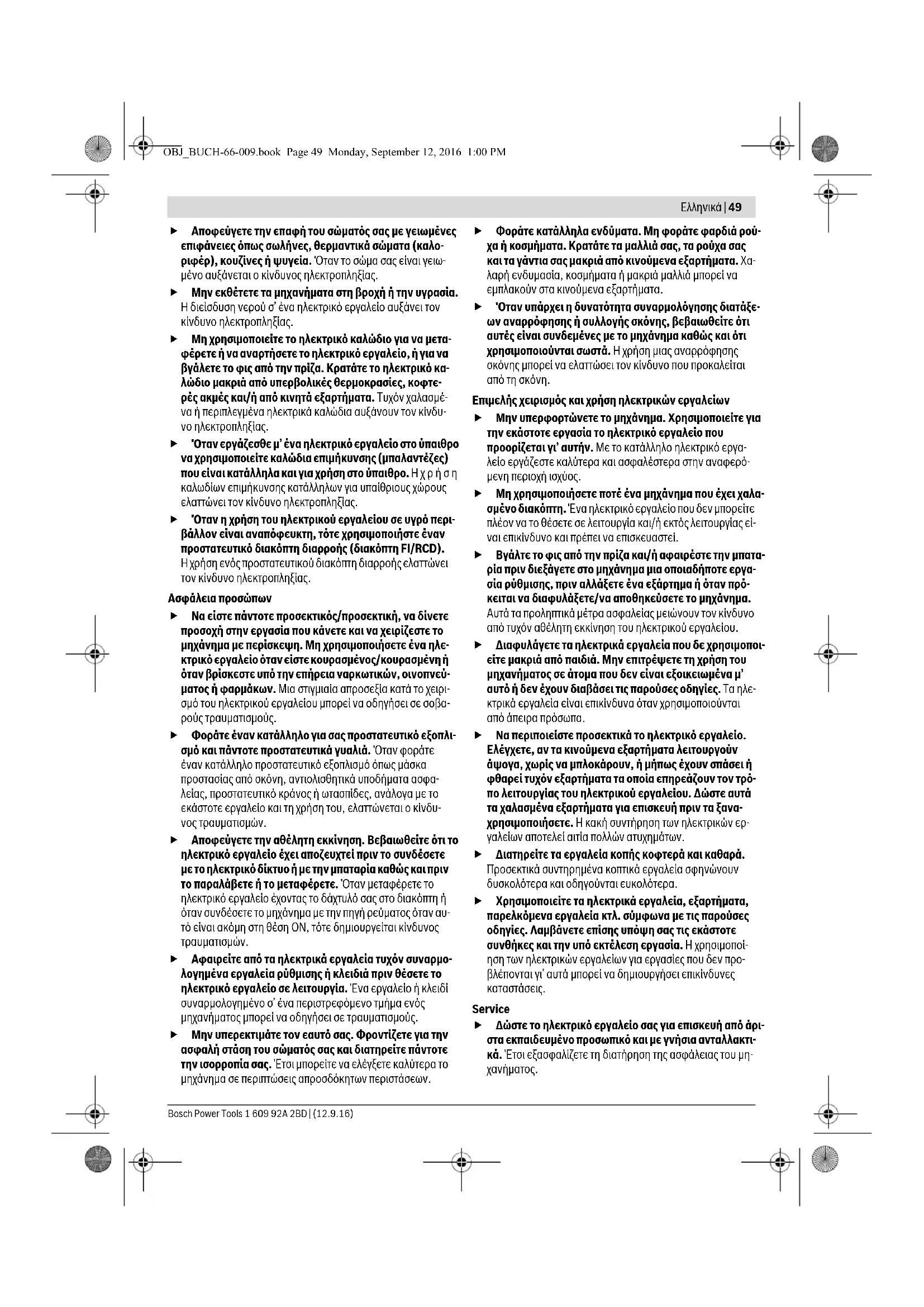 Διαβάστε όλες τις υποδείξεις ασφαλείας και τις οδηγίες. Αμέ- λειες κατά την τήρηση των υποδείξεων ασφαλείας και των οδη- γιών μπορεί να προκαλέσουν ηλεκτροπληξία, πυρκαγιά ή/και σοβαρούς τραυματισμούς. Φυλάξτε όλες τις προειδοποιητικές υποδείξεις και οδηγίες για κάθε μελλοντική χρήση. Ο ορισμός «Ηλεκτρικό εργαλείο» που χρησιμοποιείται στις προ- ειδοποιητικές υποδείξεις αναφέρεται σε ηλεκτρικά εργαλεία που τροφοδοτούνται από το ηλεκτρικό δίκτυο (με ηλεκτρικό κα- λώδιο) καθώς και σε ηλεκτρικά εργαλεία που τροφοδοτούνται από μπαταρία (χωρίς ηλεκτρικό καλώδιο). Ασφάλεια στο χώρο εργασίας Διατηρείτε τον τομέα που εργάζεσθε καθαρό και καλά φωτισμένο. Αταξία ή σκοτεινές περιοχές εργασίας μπορεί να οδηγήσουν σε ατυχήματα. Μην εργάζεσθε με το ηλεκτρικό εργαλείο σε περιβάλ- λον όπου υπάρχει κίνδυνος έκρηξης, στο οποίο υπάρ- χουν εύφλεκτα υγρά, αέρια ή σκόνες. Τα ηλεκτρικά εργα- λεία δημιουργούν σπινθηρισμό ο οποίος μπορεί να αναφλέ- ξει τη σκόνη ή τις αναθυμιάσεις. Όταν χρησιμοποιείτε το ηλεκτρικό εργαλείο κρατάτε μακριά απ’ αυτό τα παιδιά κι άλλα τυχόν παρευρισκόμε- να άτομα. Σε περίπτωση απόσπασης της προσοχής σας μπο- ρεί να χάσετε τον έλεγχο του μηχανήματος. Ηλεκτρική ασφάλεια Το φις του ηλεκτρικού εργαλείου πρέπει να ταιριάζει στην πρίζα. Δεν επιτρέπεται με κανέναν τρόπο η μετα- τροπή του φις. Μη χρησιμοποιείτε προσαρμοστικά φις σε συνδυασμό με γειωμένα ηλεκτρικά εργαλεία. Αμετα- ποίητα φις και κατάλληλες πρίζες μειώνουν τον κίνδυνο ηλεκτροπληξίας. OBJ_BUCH-66-009.book Page 48 Monday, September 12, 2016 1:00 PMΕλληνικά | 49 Bosch Power Tools 1 609 92A 2BD | (12.9.16) Αποφεύγετε την επαφή του σώματός σας με γειωμένες επιφάνειες όπως σωλήνες, θερμαντικά σώματα (καλο- ριφέρ), κουζίνες ή ψυγεία. Όταν το σώμα σας είναι γειω- μένο αυξάνεται ο κίνδυνος ηλεκτροπληξίας. Μην εκθέτετε τα μηχανήματα στη βροχή ή την υγρασία. Η διείσδυση νερού σ’ ένα ηλεκτρικό εργαλείο αυξάνει τον κίνδυνο ηλεκτροπληξίας. Μη χρησιμοποιείτε το ηλεκτρικό καλώδιο για να μετα- φέρετε ή να αναρτήσετε το ηλεκτρικό εργαλείο, ή για να βγάλετε το φις από την πρίζα. Κρατάτε το ηλεκτρικό κα- λώδιο μακριά από υπερβολικές θερμοκρασίες, κοφτε- ρές ακμές και/ή από κινητά εξαρτήματα. Τυχόν χαλασμέ- να ή περιπλεγμένα ηλεκτρικά καλώδια αυξάνουν τον κίνδυ- νο ηλεκτροπληξίας. Όταν εργάζεσθε μ’ ένα ηλεκτρικό εργαλείο στο ύπαιθρο να χρησιμοποιείτε καλώδια επιμήκυνσης (μπαλαντέζες) που είναι κατάλληλα και για χρήση στο ύπαιθρο. Ηχρήση καλωδίων επιμήκυνσης κατάλληλων για υπαίθριους χώρους ελαττώνει τον κίνδυνο ηλεκτροπληξίας. Όταν η χρήση του ηλεκτρικού εργαλείου σε υγρό περι- βάλλον είναι αναπόφευκτη, τότε χρησιμοποιήστε έναν προστατευτικό διακόπτη διαρροής (διακόπτη FI/RCD). Η χρήση ενός προστατευτικού διακόπτη διαρροής ελαττώνει τον κίνδυνο ηλεκτροπληξίας. Ασφάλεια προσώπων Να είστε πάντοτε προσεκτικός/προσεκτική, να δίνετε προσοχή στην εργασία που κάνετε και να χειρίζεστε το μηχάνημα με περίσκεψη. Μη χρησιμοποιήσετε ένα ηλε- κτρικό εργαλείο όταν είστε κουρασμένος/κουρασμένη ή όταν βρίσκεστε υπό την επήρεια ναρκωτικών, οινοπνεύ- ματος ή φαρμάκων. Μια στιγμιαία απροσεξία κατά το χειρι- σμό του ηλεκτρικού εργαλείου μπορεί να οδηγήσει σε σοβα- ρούς τραυματισμούς. Φοράτε έναν κατάλληλο για σας προστατευτικό εξοπλι- σμό και πάντοτε προστατευτικά γυαλιά. Όταν φοράτε έναν κατάλληλο προστατευτικό εξοπλισμό όπως μάσκα προστασία