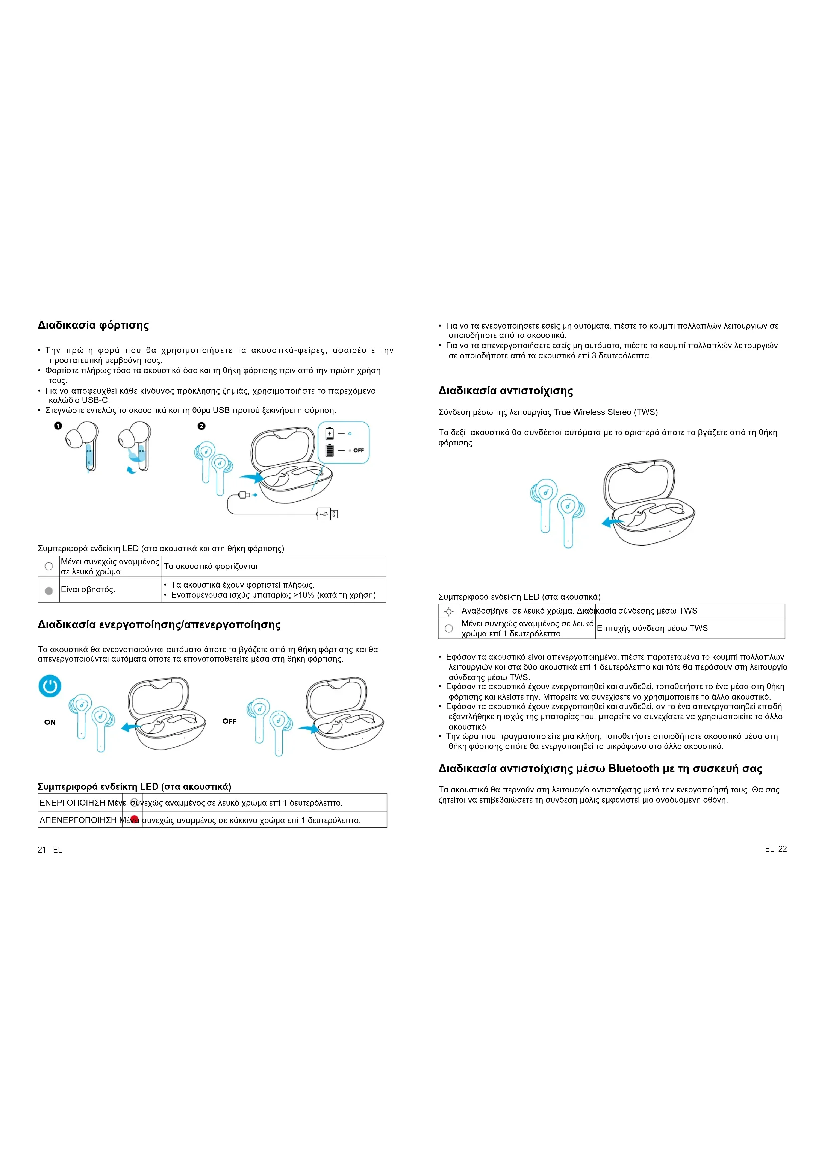 Συμπεριφορά ενδείκτη LED (στα ακουστικά) Αναβοσβήνει σε λευκό χρώμα. Διαδικασία σύνδεσης μέσω TWS Μένει συνεχώς αναμμένος σε λευκό χρώμα επί 1 δευτερόλεπτο. Επιτυχής σύνδεση μέσω TWS