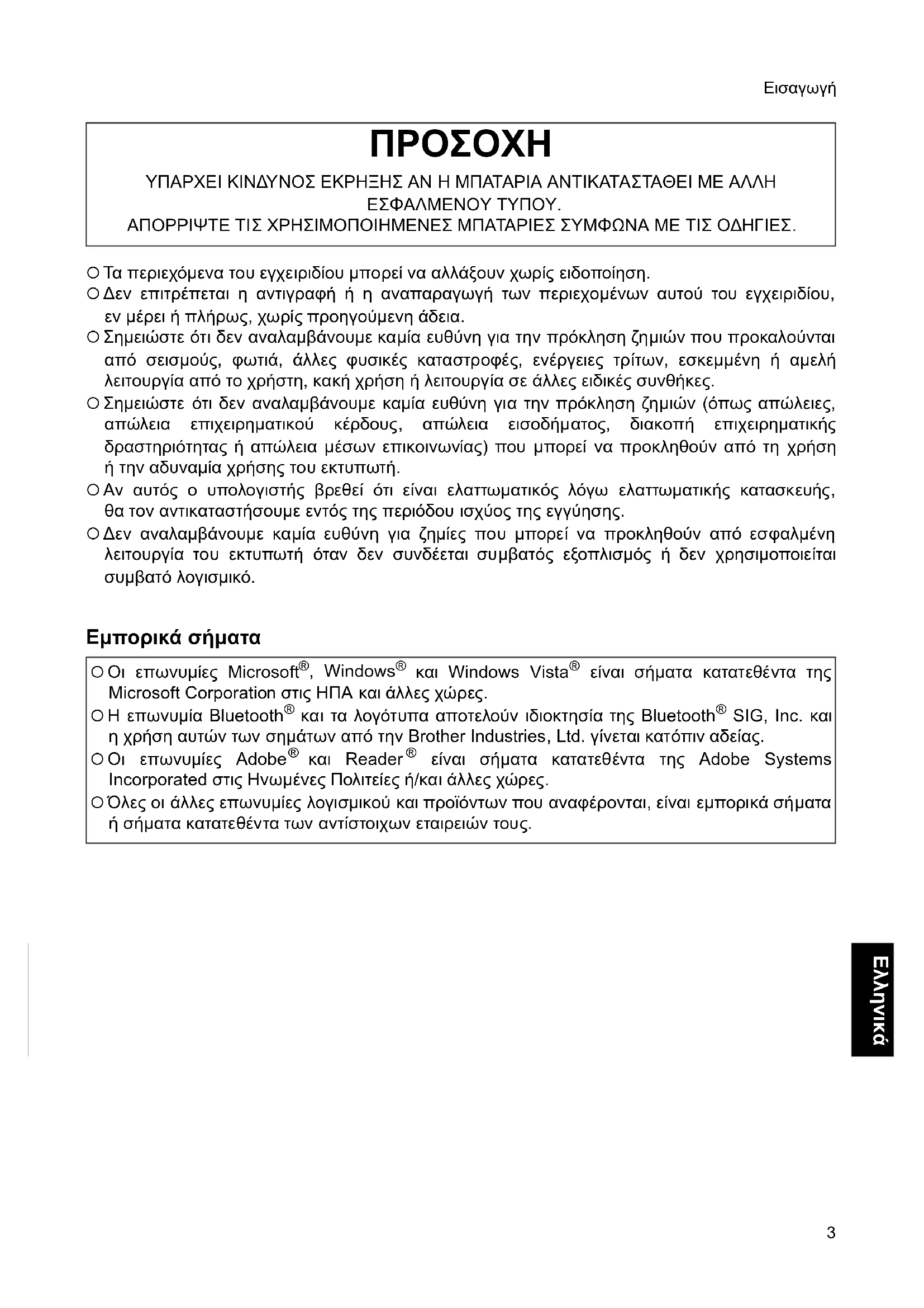 { Τα περιεχόµενα του εγχειριδίου µπορεί να αλλάξουν χωρίς ειδοποίηση. { ∆εν επιτρέπεται η αντιγραφή ή η αναπαραγωγή των περιεχοµένων αυτού του εγχειριδίου, εν µέρει ή πλήρως, χωρίς προηγούµενη άδεια. { Σηµειώστε ότι δεν αναλαµβάνουµε καµία ευθύνη για την πρόκληση ζηµιών που προκαλούνται από σεισµούς, φωτιά, άλλες φυσικές καταστροφές, ενέργειες τρίτων, εσκεµµένη ή αµελή λειτουργία από το χρήστη, κακή χρήση ή λειτουργία σε άλλες ειδικές συνθήκες. { Σηµειώστε ότι δεν αναλαµβάνουµε καµία ευθύνη για την πρόκληση ζηµιών (όπως απώλειες, απώλεια επιχειρηµατικού κέρδους, απώλεια εισοδήµατος, διακοπή επιχειρηµατικής δραστηριότητας ή απώλεια µέσων επικοινωνίας) που µπορεί να προκληθούν από τη χρήση ήτην αδυναµία χρήσης του εκτυπωτή. { Αν αυτός ο υπολογιστής βρεθεί ότι είναι ελαττωµατικός λόγω ελαττωµατικής κατασκευής, θα τον αντικαταστήσουµε εντός της περιόδου ισχύος της εγγύησης. { ∆εν αναλαµβάνουµε καµία ευθύνη για ζηµίες που µπορεί να προκληθούν από εσφαλµένη λειτουργία του εκτυπωτή όταν δεν συνδέεται συµβατός εξοπλισµός ή δεν χρησιµοποιείται συµβατό λογισµικό. Εµπορικά σήµατα